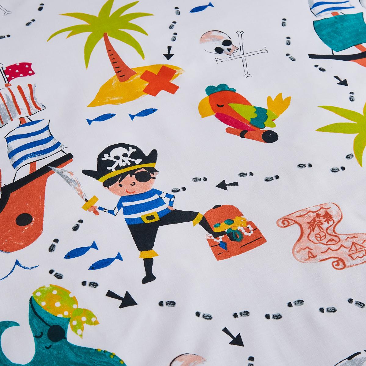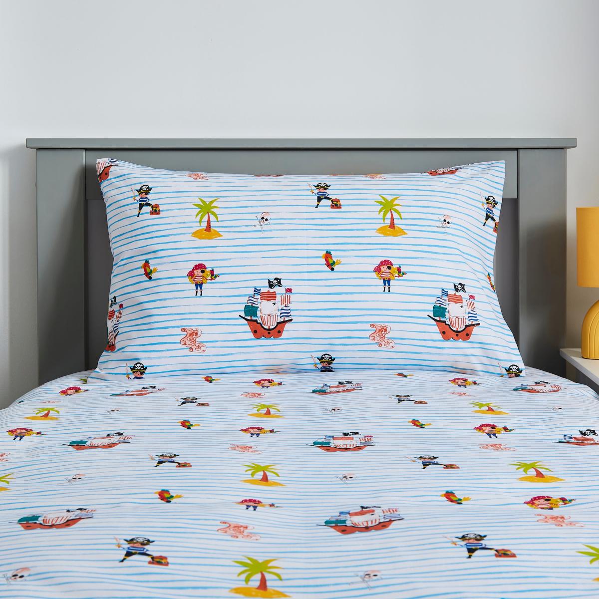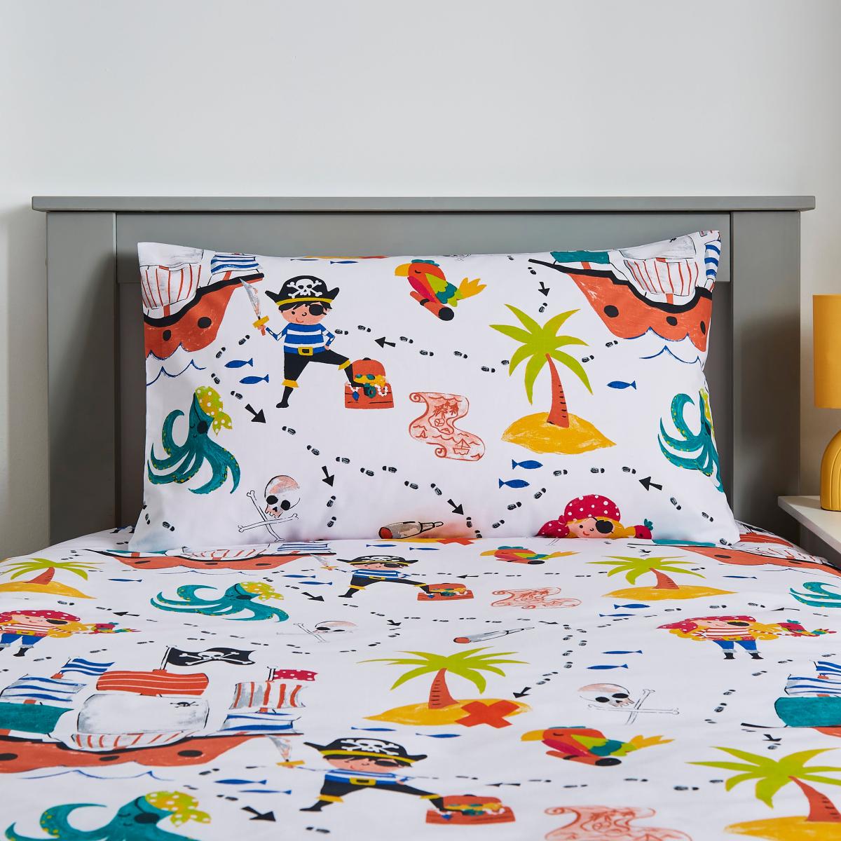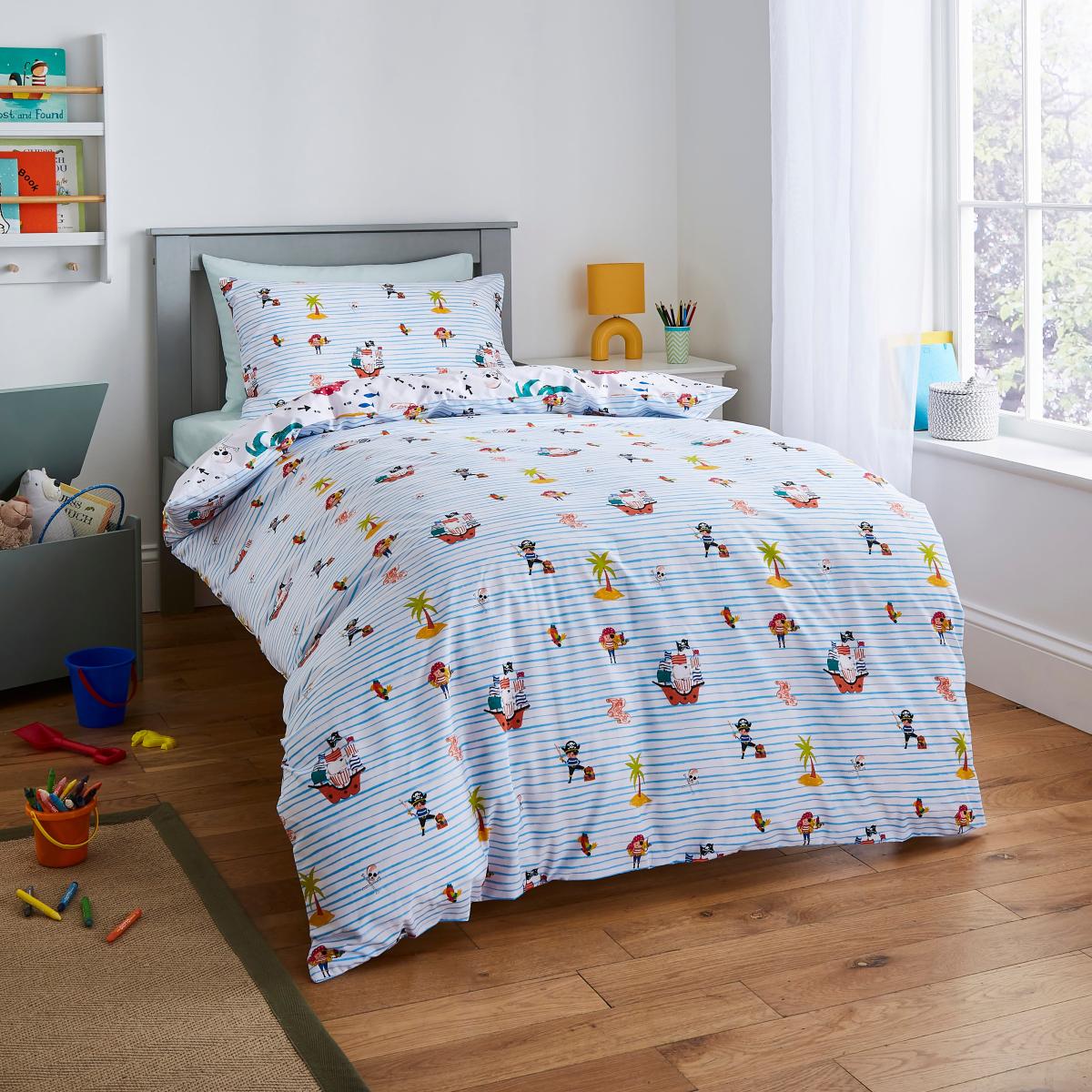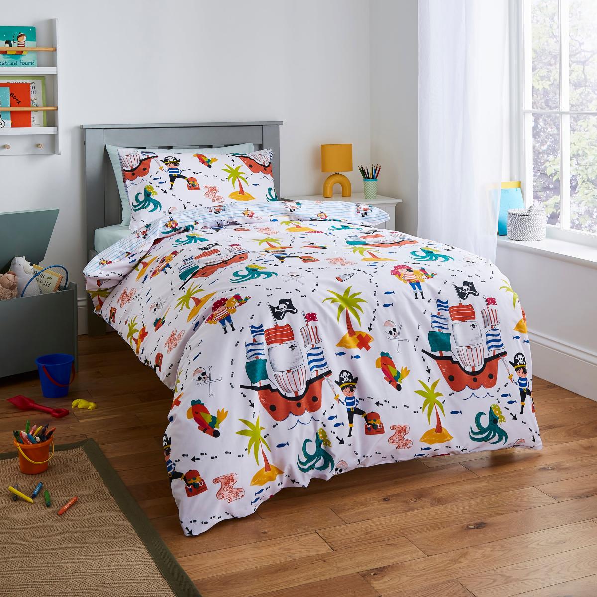 I love this kids' duvet set for its fun, vibrant pirate theme, making it perfect for sparking imagination in a child's bedroom. Its lively multicoloured design works well in playful, nautical-inspired interiors, and it can brighten up a simple space with ease. To style around the bedding, consider neutral or white furnishings to make the colours pop, and add accessories like wooden or coastal-themed decor to enhance the maritime vibe. Practical tips include pairing it with plain, coordinating pillowcases or cushions for an effortless, balanced look, and keeping the bedding easy to wash and durable to withstand the little pirates’ adventures.