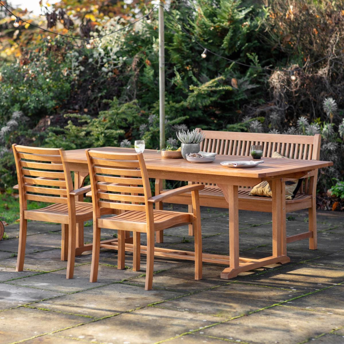 The Pires Outdoor Extending Dining Table offers a stylish, practical solution for outdoor dining. The table comfortably seats 6 normally, but features two butterfly leaves so it can be extended to two longer lengths, seating up to 12 when needed for extra guests. It is crafted from eucalyptus wood which is ideal for outdoor furniture, as the wood is naturally resistant to moisture and so offers durability and resilience to colder wetter climates. It also offers a great sustainable resource with its fast growth levels.