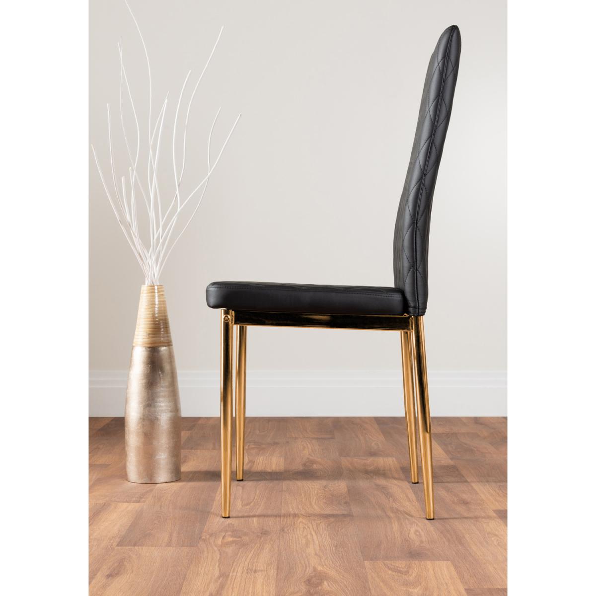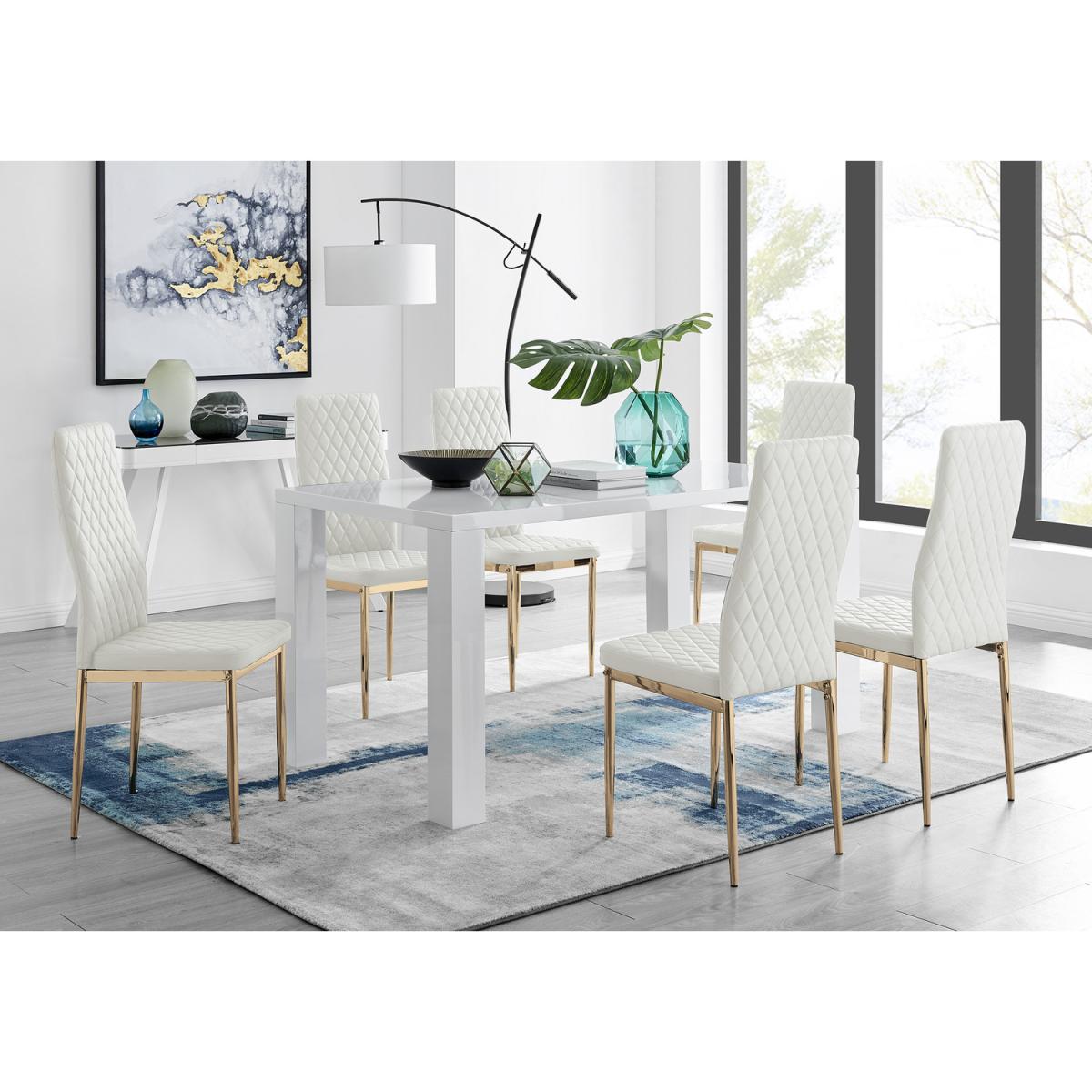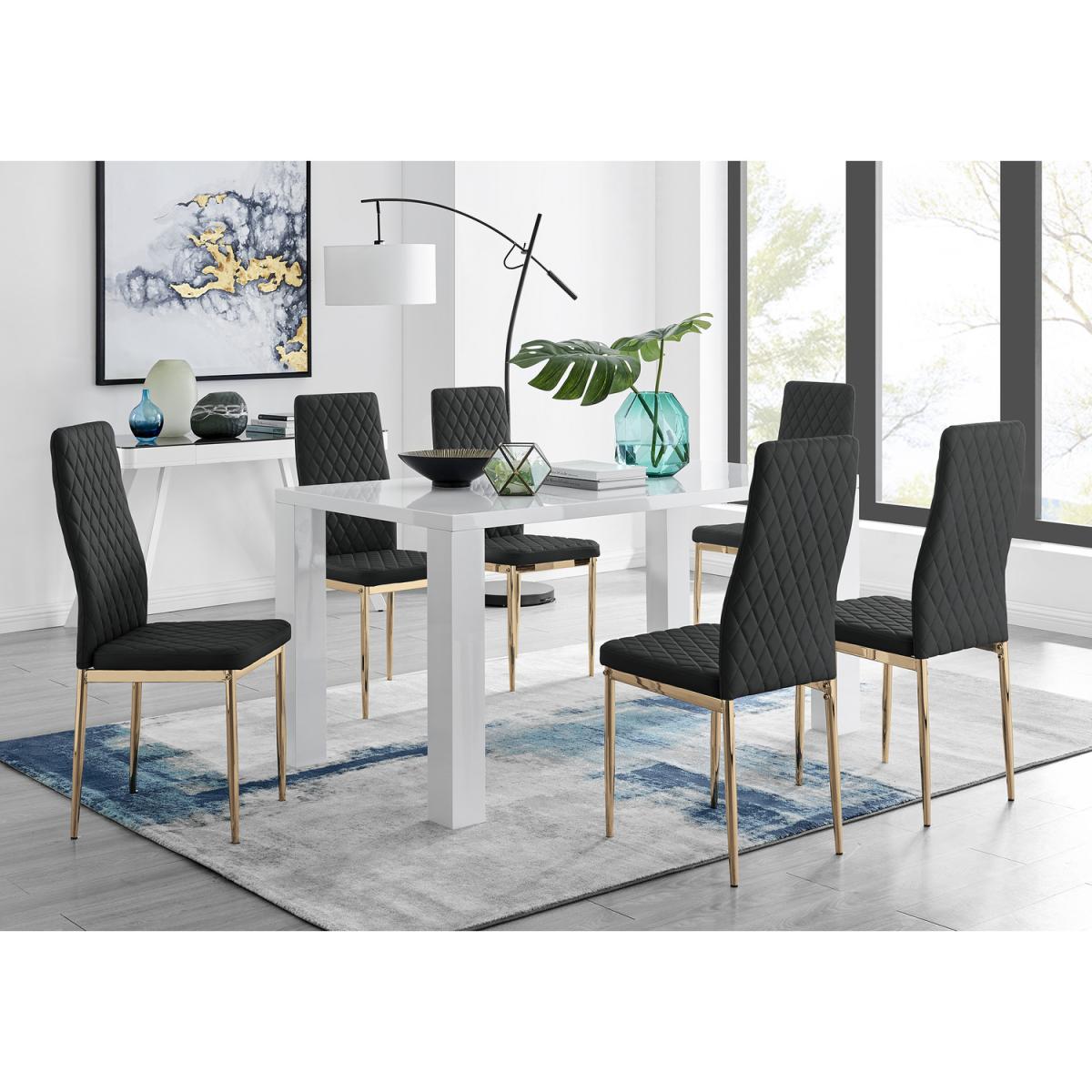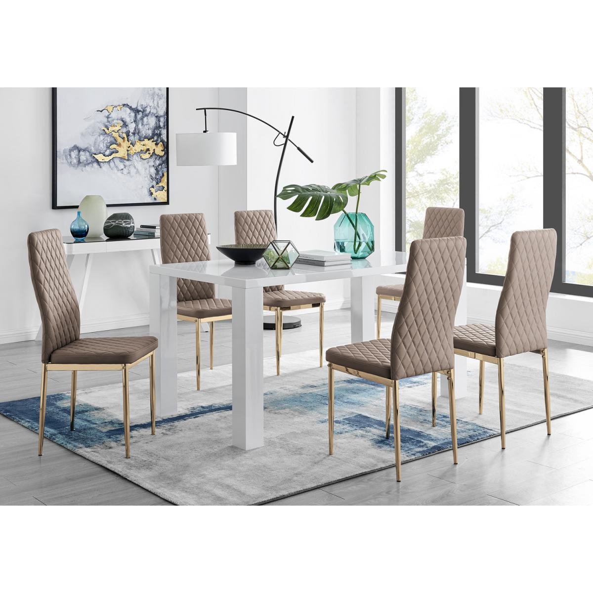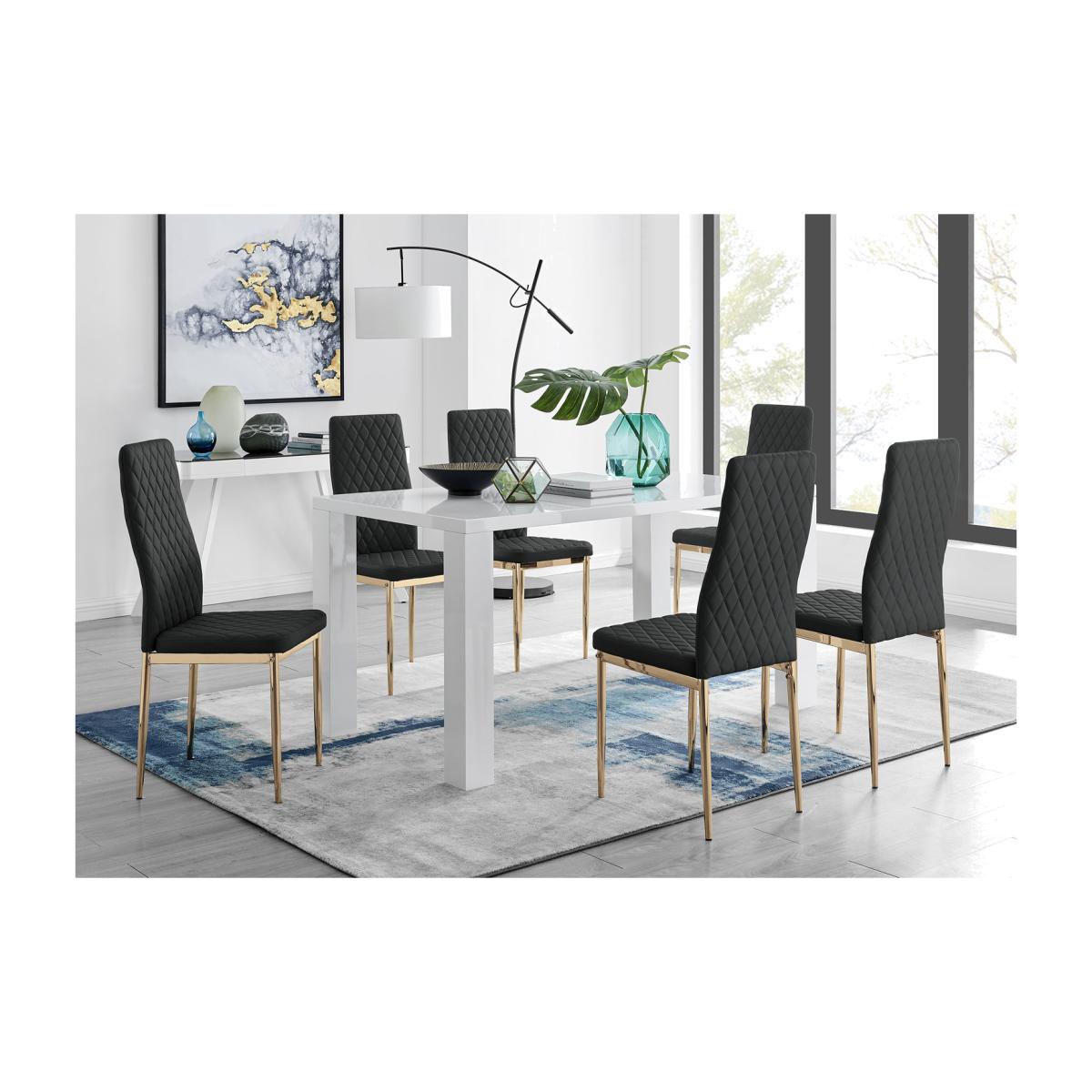Simplistic, yet elegant this Pivero dining table catches the eye with a slick high gloss finish. For those looking to make a statement in a minimalist area the Pivero table is the perfect addition. The smooth high gloss finish is easy to wipe clean meaning your table will stay looking brand new for years to come! The table also benefits from having table legs at the end of the table allowing chairs to be tucked under the table, saving space and creating an open dining room look. Paired alongside our beautiful faux leather diamond quilted Milan dining chairs for a sophisticated contemporary look. The Milan chairs are made from high-quality faux leather with trendy gold effect legs and are ergonomically designed for maximum comfort and back support. Made for regular use, the protective plastic feet will protect your floor from any damage. Available in elephant grey, cappuccino grey, white, black or mustard to add your own personality and complete this gorgeous dining set.