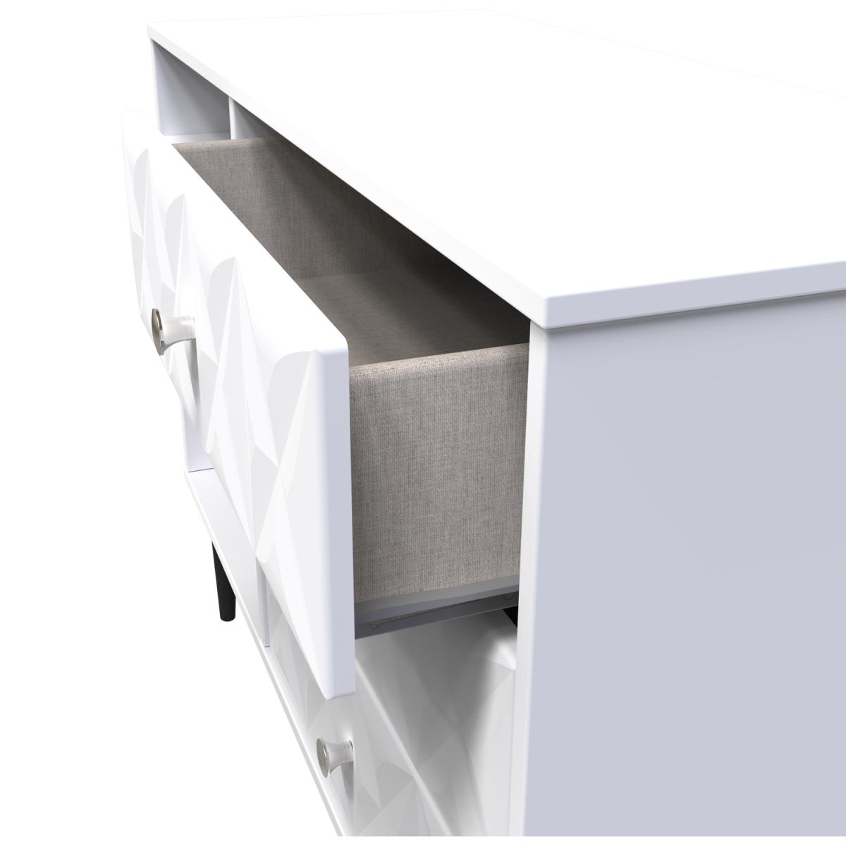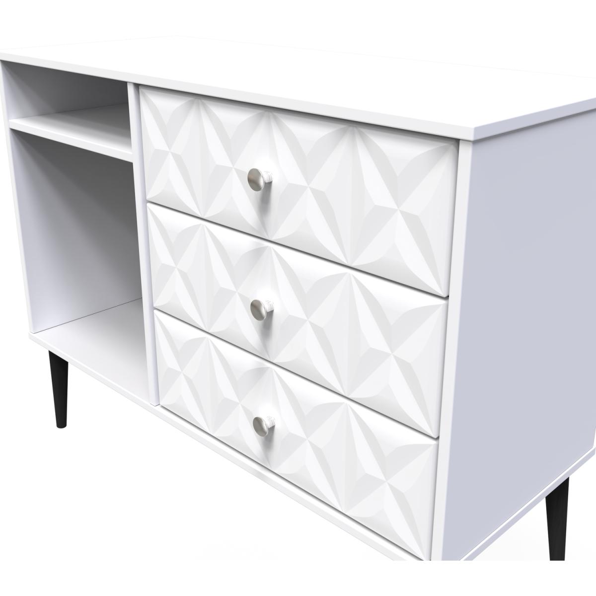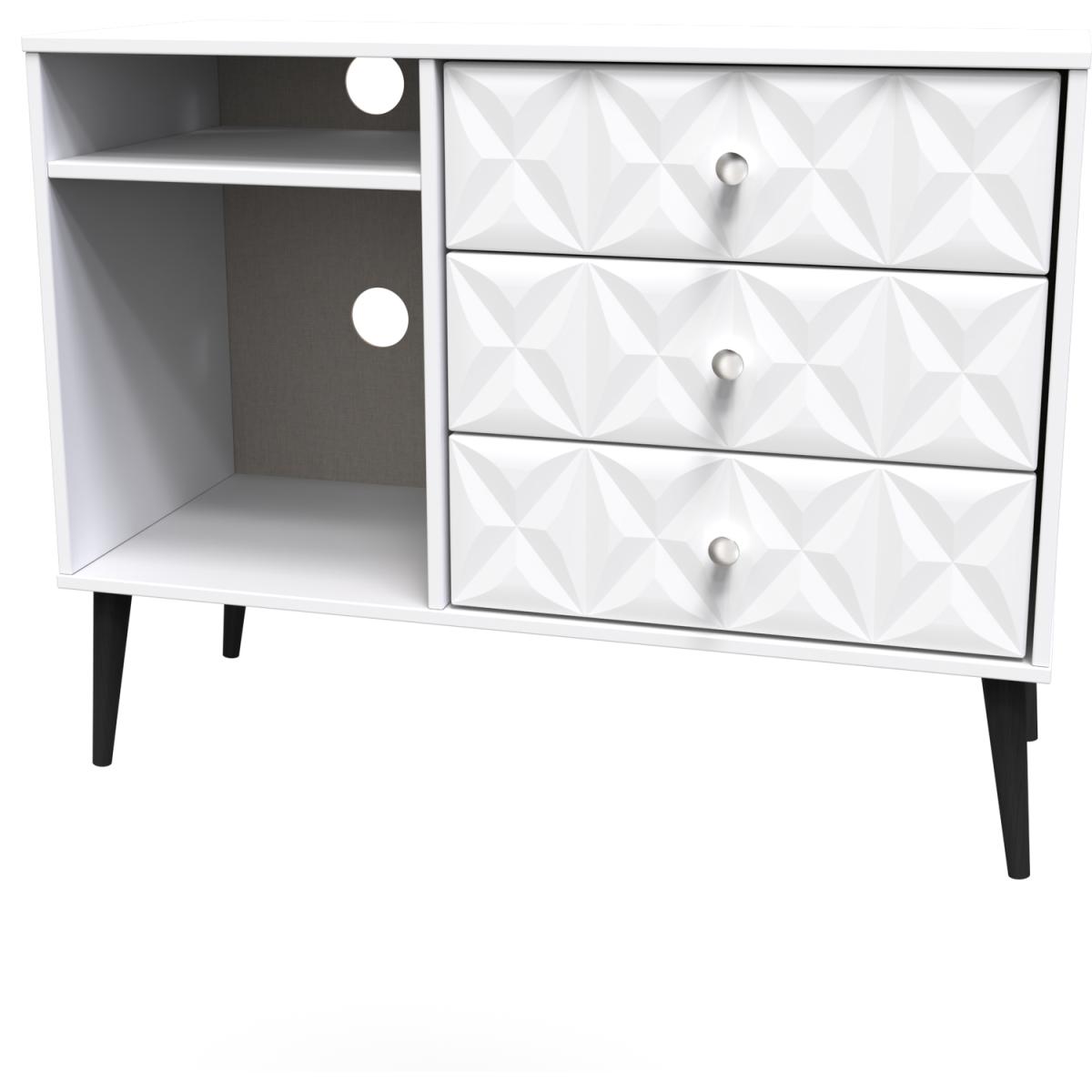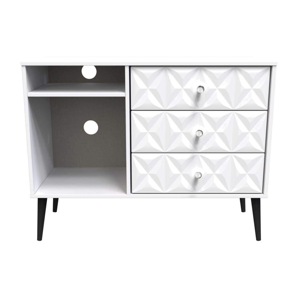 This modern storage unit features 3 drawers and a large storage area with a single shelf. Can be used as a TVMedia unit or sideboard A modern and distinctive range. Named for the unique "Pixel" patten of the drawer and door fronts. Also features Black Metal Handles and Black Hairpin Legs. Comes in a wide range of colours including eye cathching two tone colour combinations. All our furniture is made in the United Kingdom, to the highest quality. It is delivered direct to your location of choice by one of our two man delivery teams, and come full assembled (although legs may be removed to prevent damage in transit).