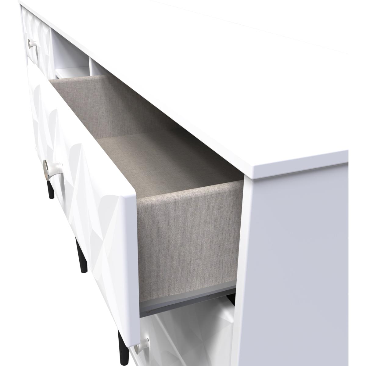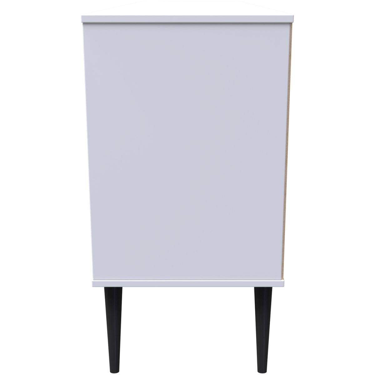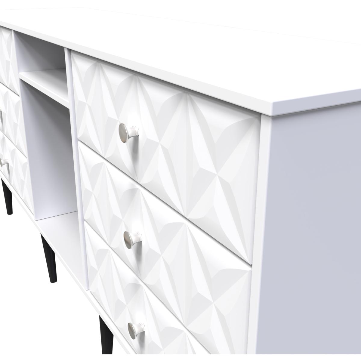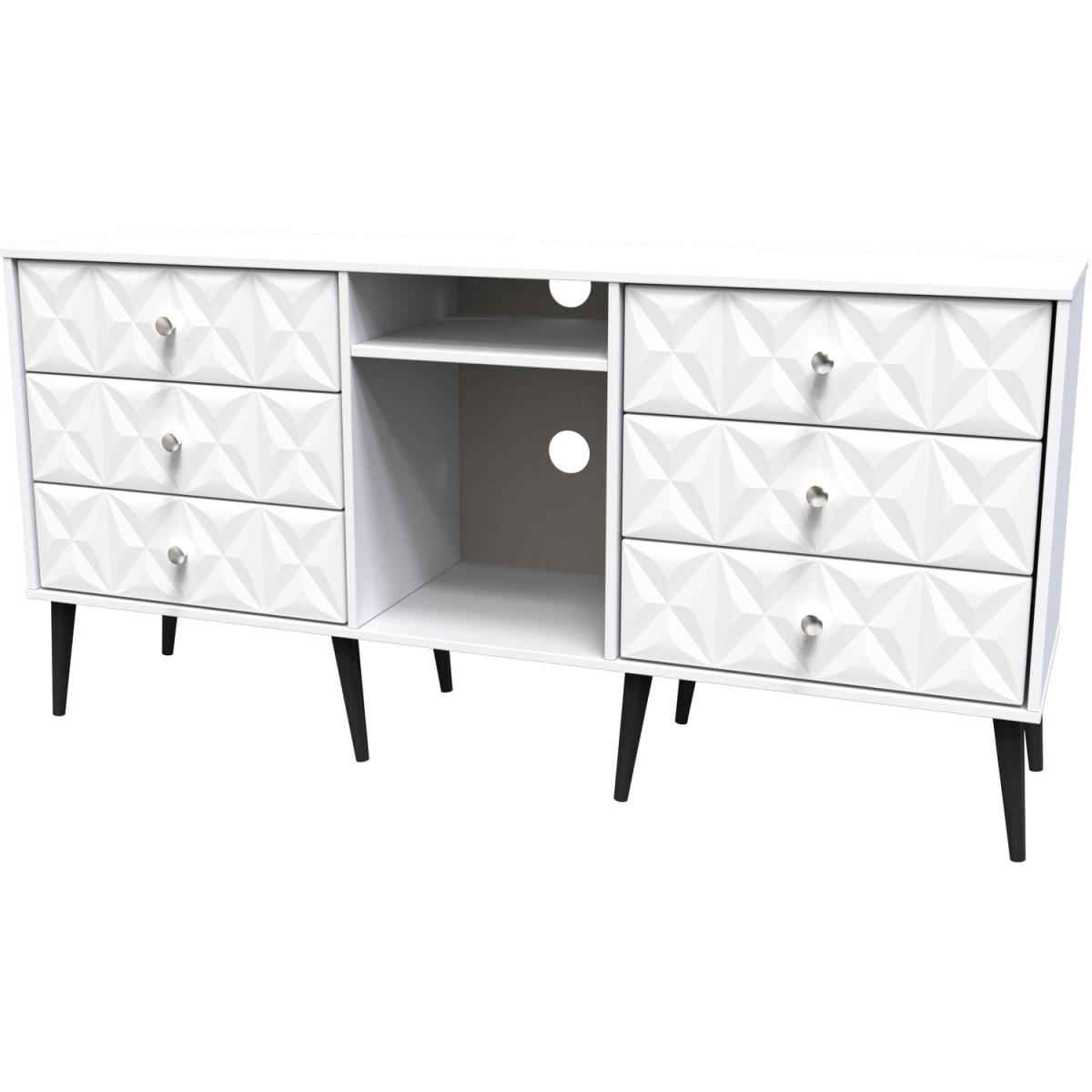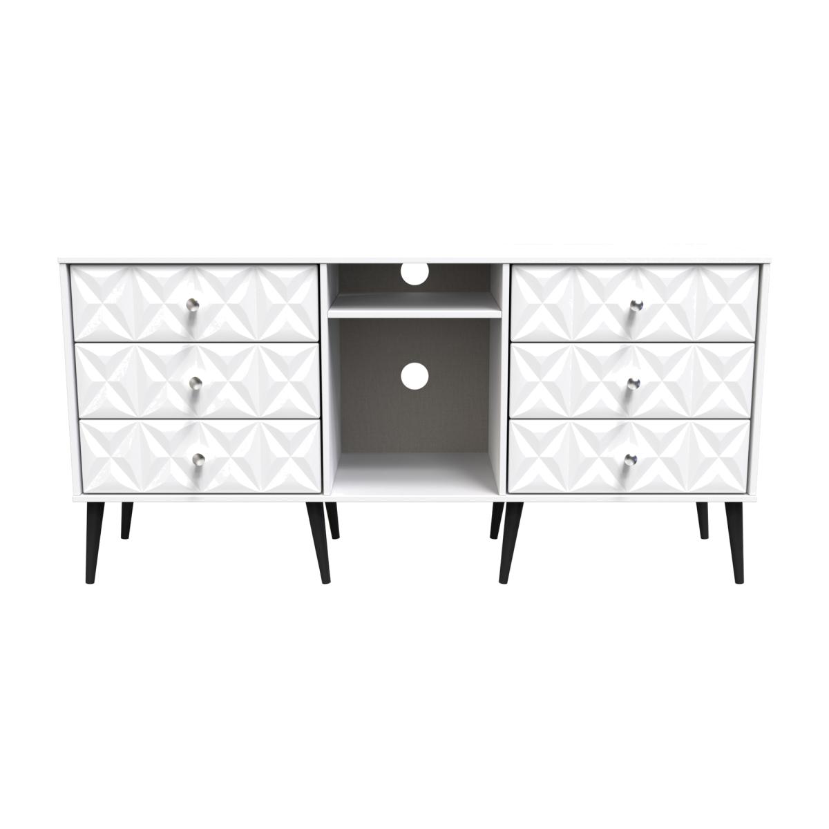 This wide storage unit features 6 storage drawers with a central shelf. Suitable for use as a TVMedia unit or sideboard. A modern and distinctive range. Named for the unique "Pixel" patten of the drawer and door fronts. Also features Black Metal Handles and Black Hairpin Legs. Comes in a wide range of colours including eye cathching two tone colour combinations. All our furniture is made in the United Kingdom, to the highest quality. It is delivered direct to your location of choice by one of our two man delivery teams, and come full assembled (although legs may be removed to prevent damage in transit).