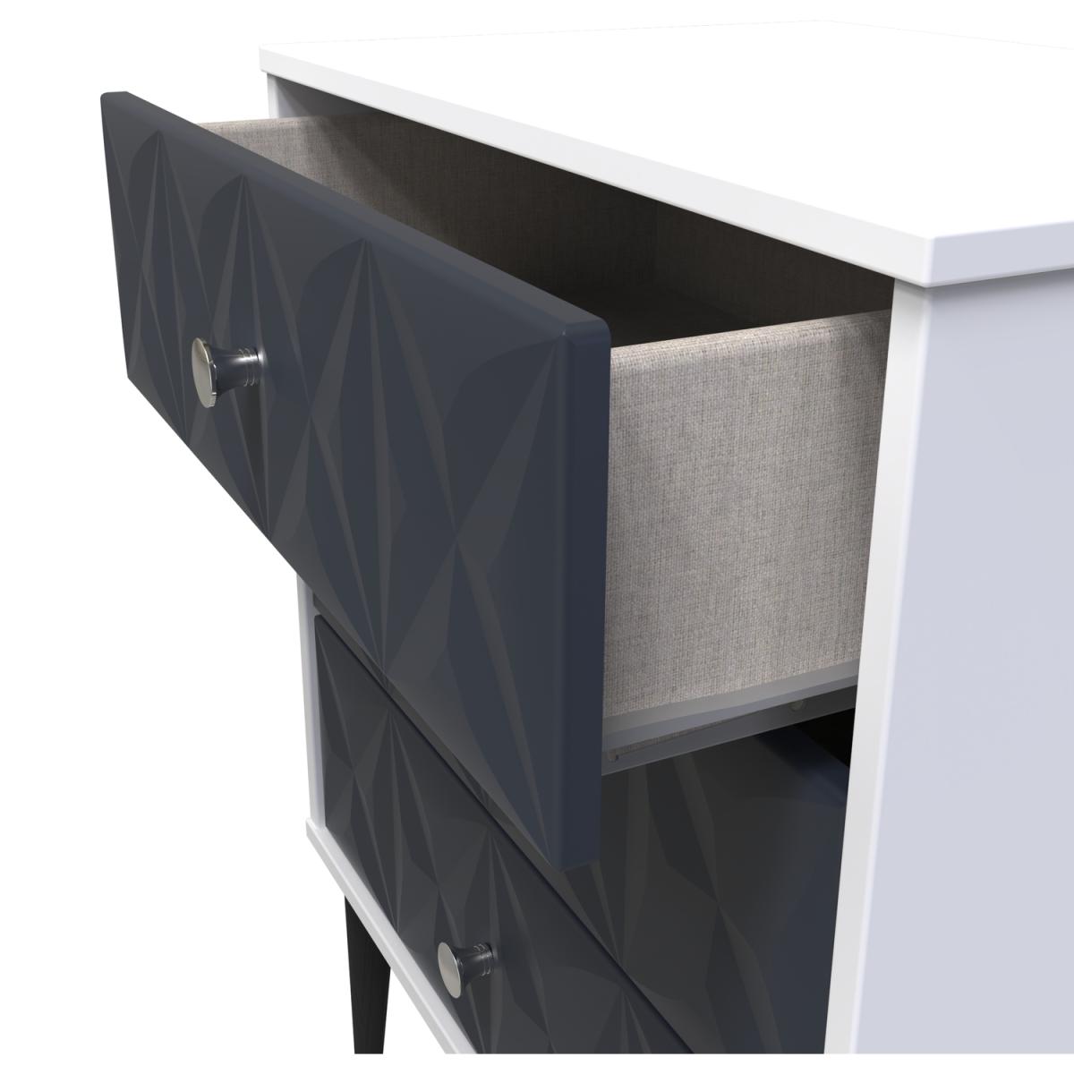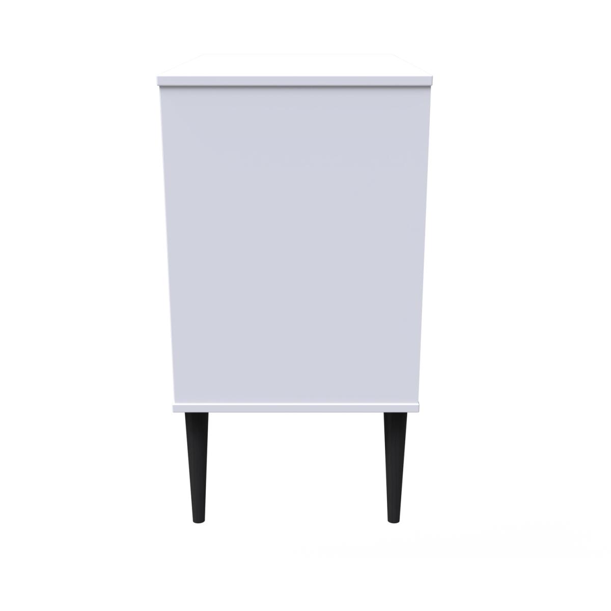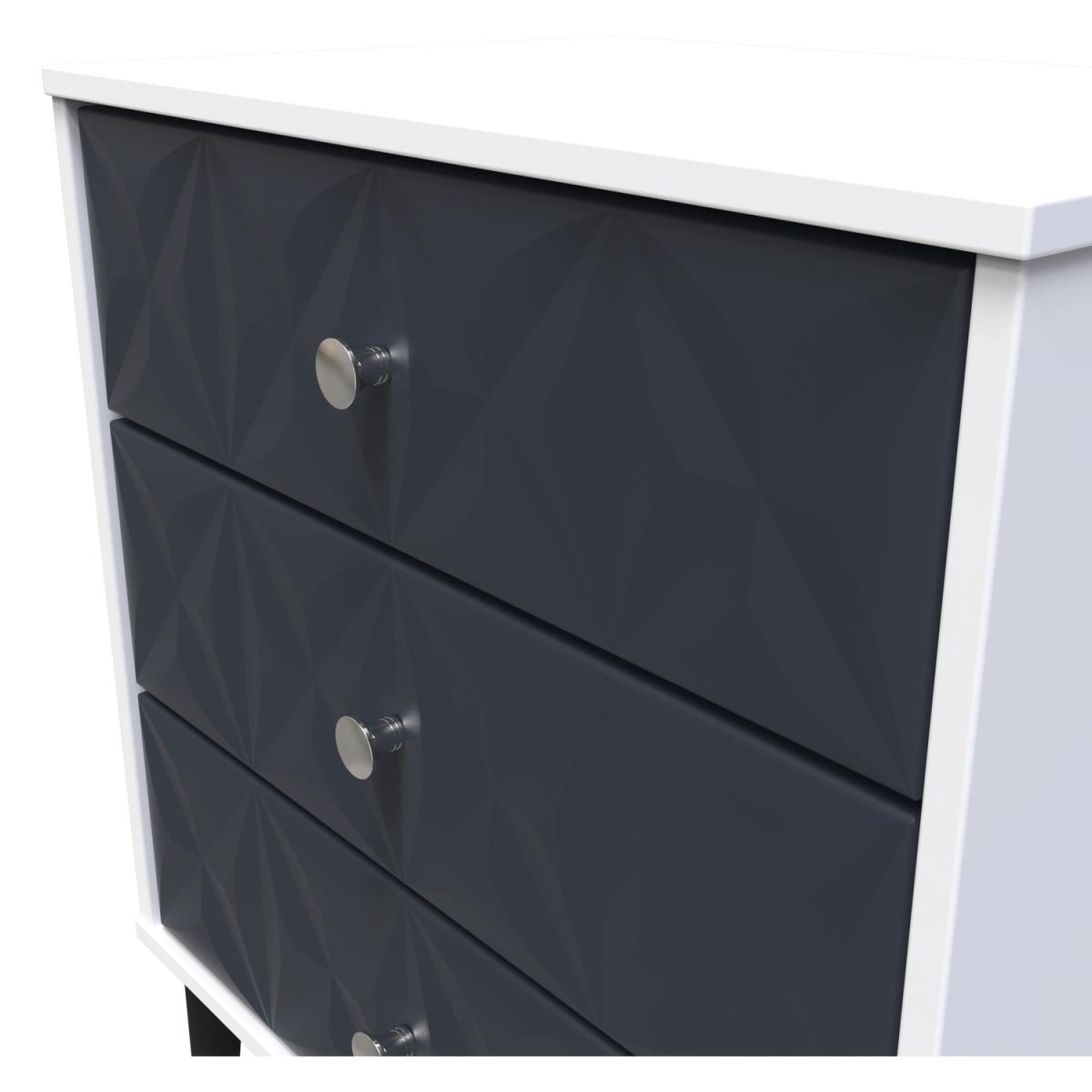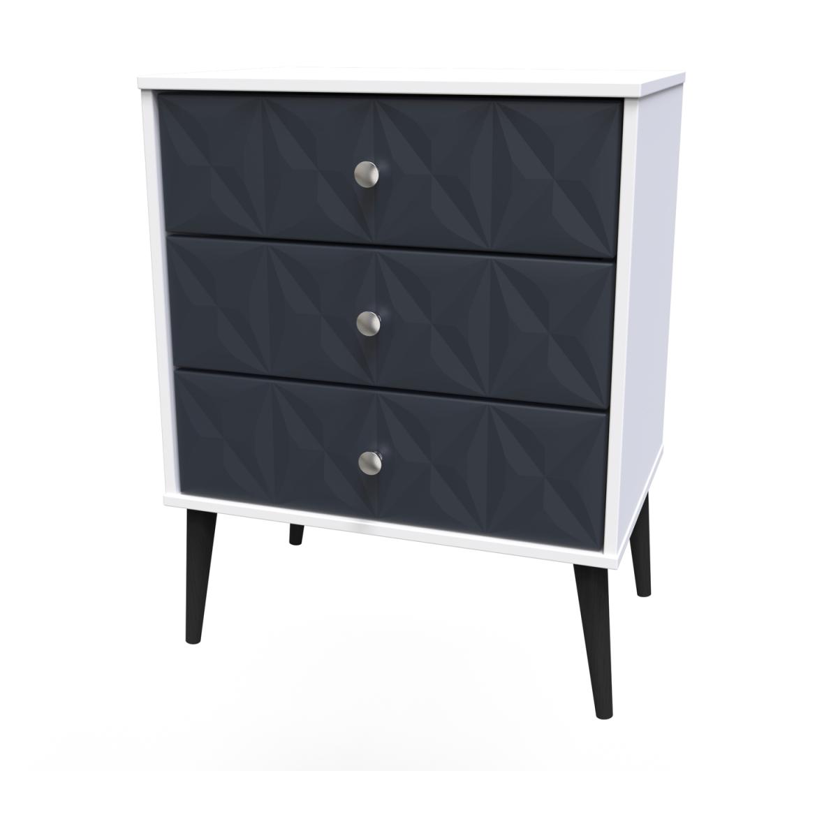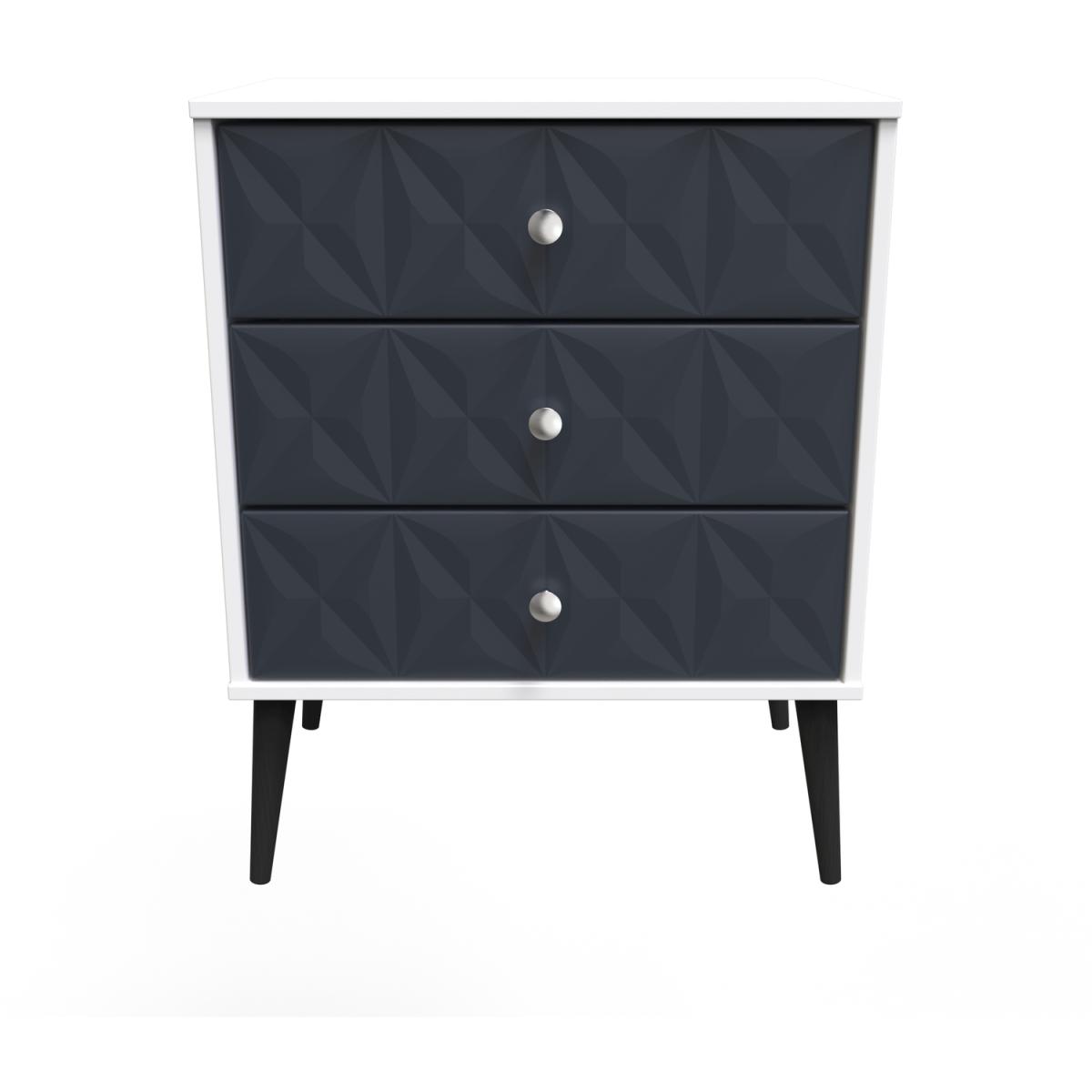 This 3 drawer bedside cabinet is wider than normal for added practicality. Perfect for any bedside or as a free standing storage unit. A modern and distinctive range. Named for the unique "Pixel" patten of the drawer and door fronts. Also features Black Metal Handles and Black Hairpin Legs. Comes in a wide range of colours including eye cathching two tone colour combinations. All our furniture is made in the United Kingdom, to the highest quality. It is delivered direct to your location of choice by one of our two man delivery teams, and come full assembled (although legs may be removed to prevent damage in transit).