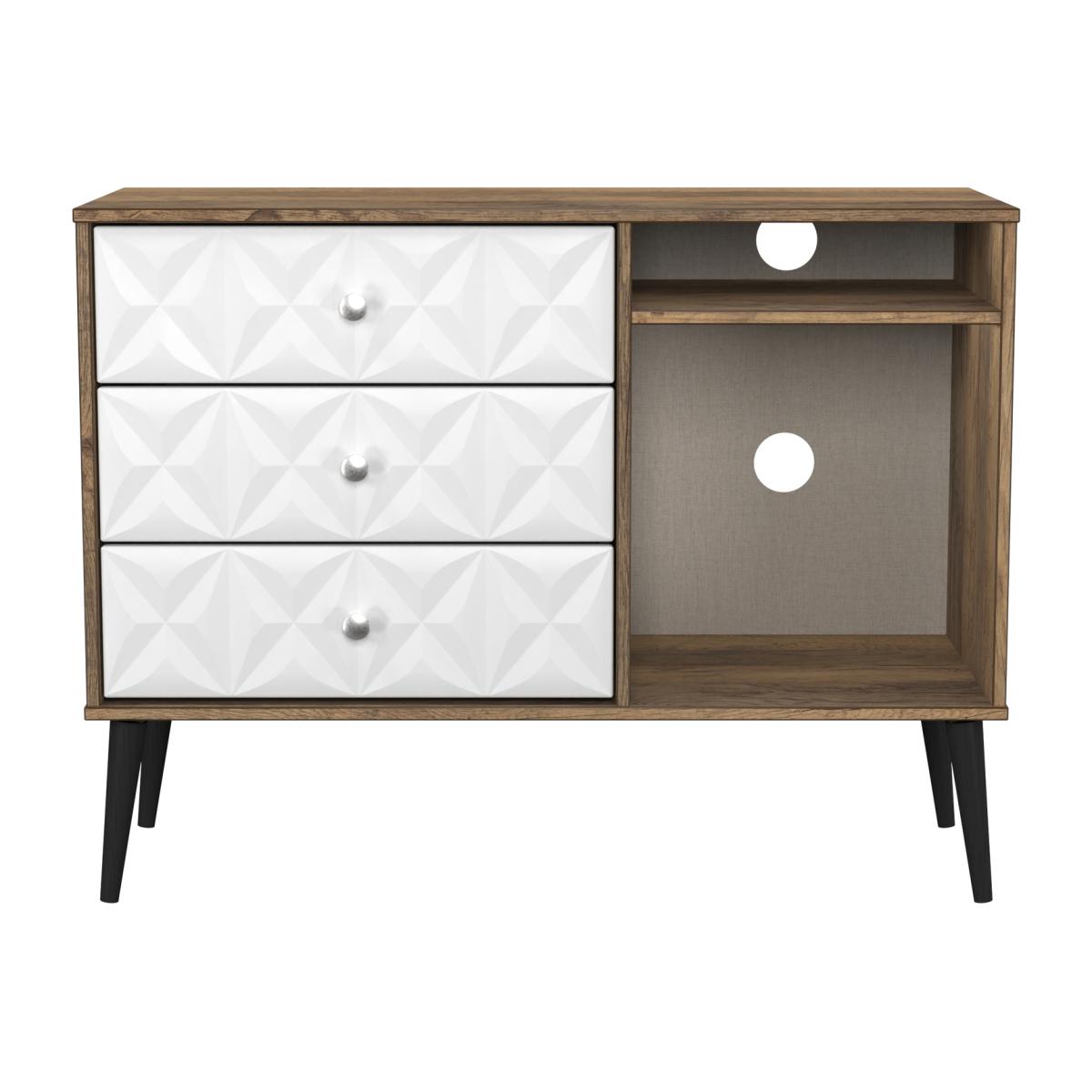 This modern storage unit features 3 drawers and a large storage area with a single shelf. Can be used as a TVMedia unit or sideboard A modern and distinctive range. Named for the unique "Pixel" patten of the drawer and door fronts. Also features Black Metal Handles and Black Hairpin Legs. Comes in a wide range of colours including eye cathching two tone colour combinations. All our furniture is made in the United Kingdom, to the highest quality. It is delivered direct to your location of choice by one of our two man delivery teams, and comes fully assembled (although legs may be removed to prevent damage in transit).