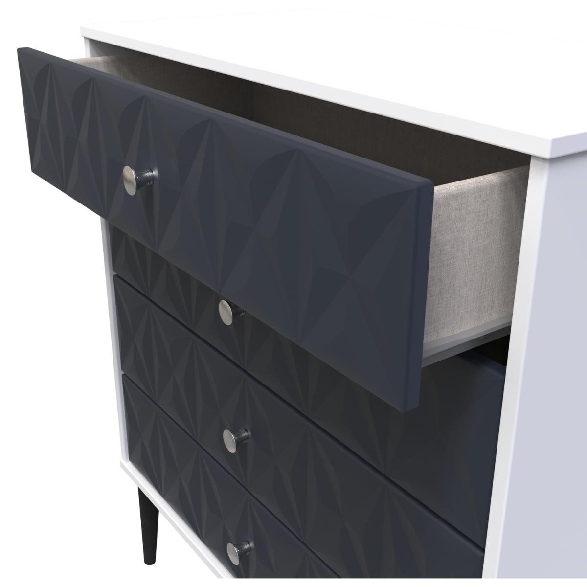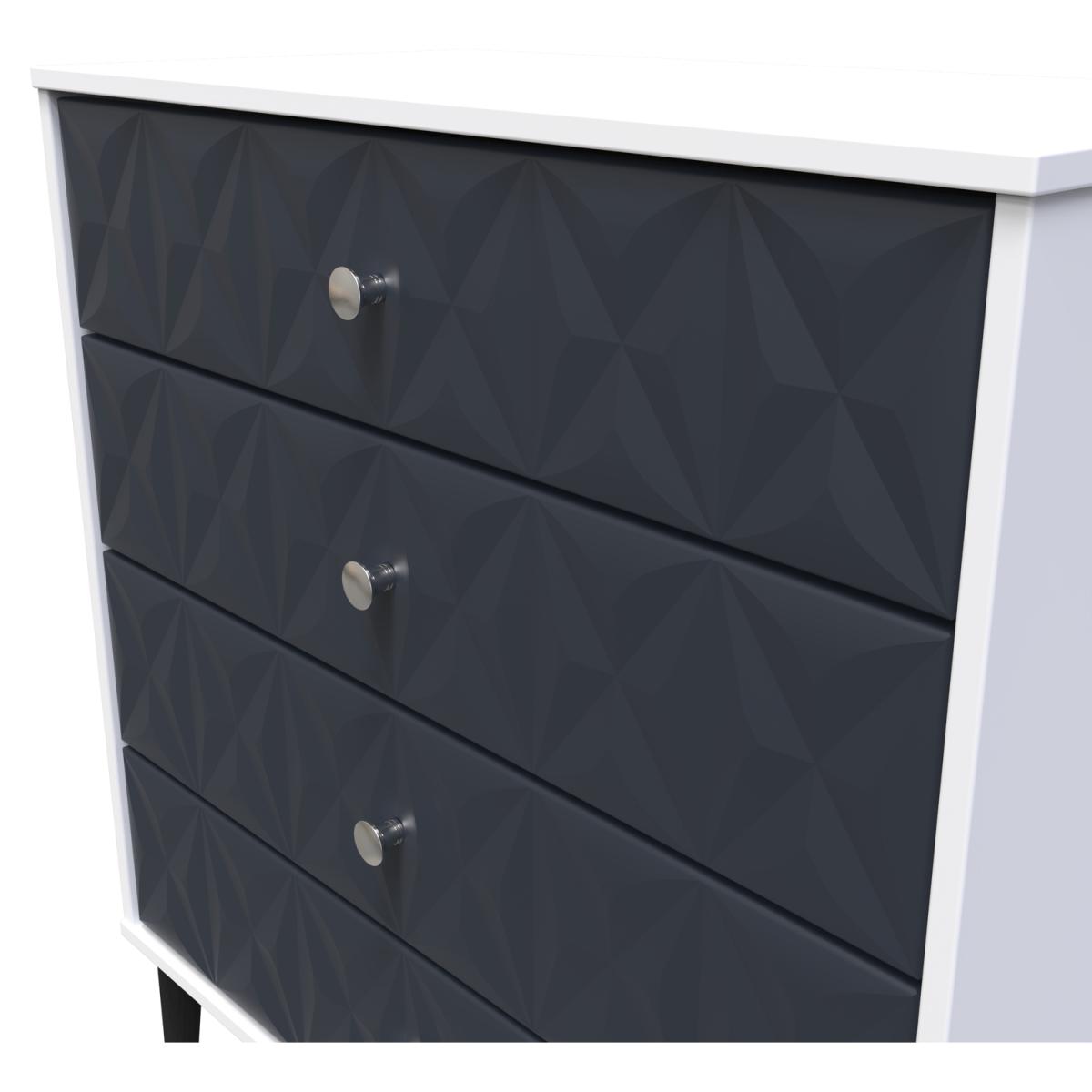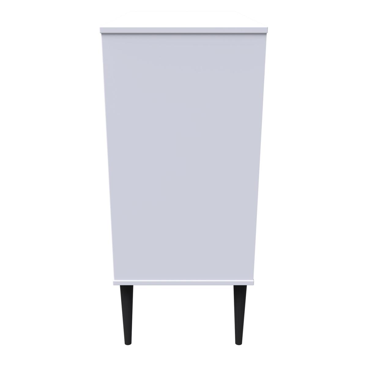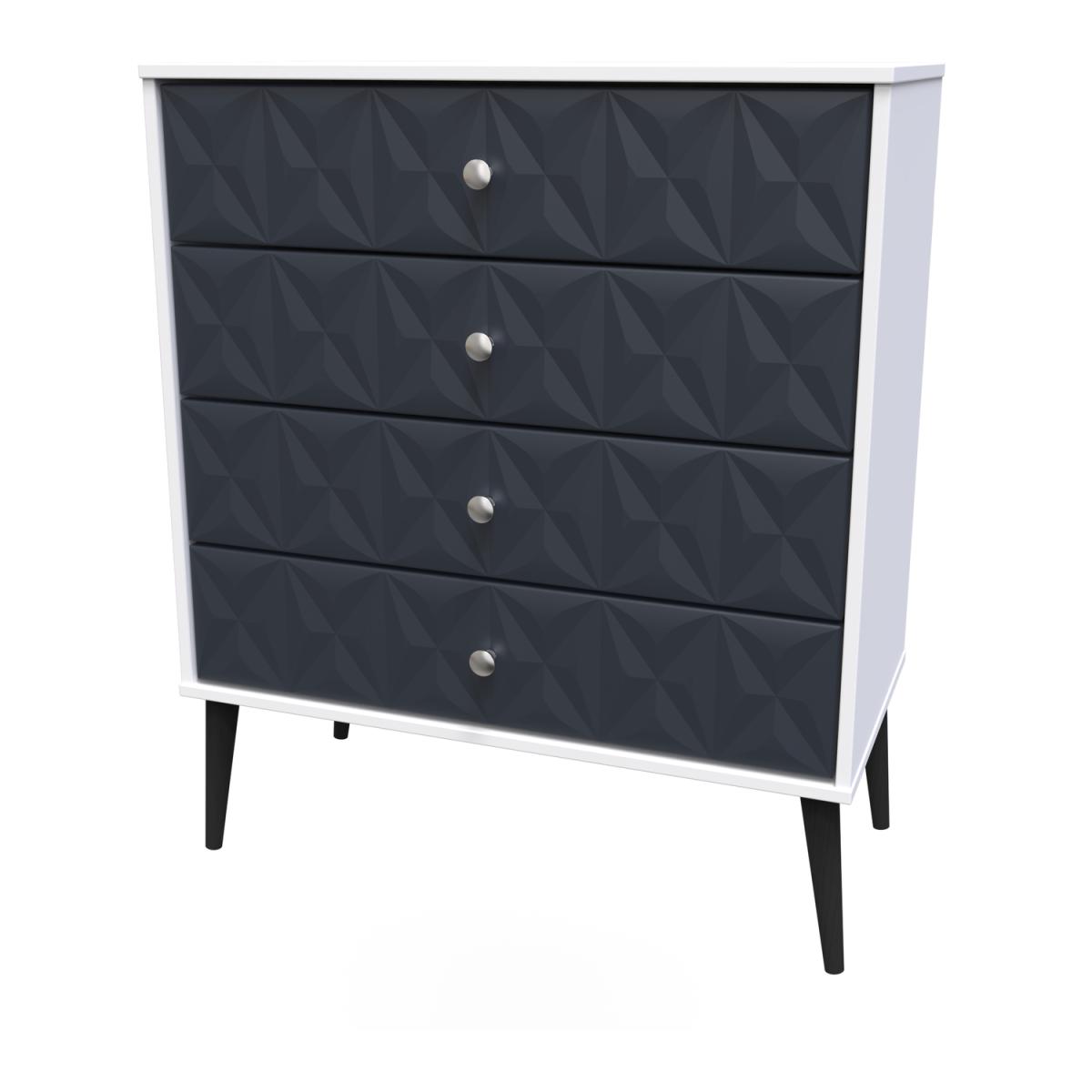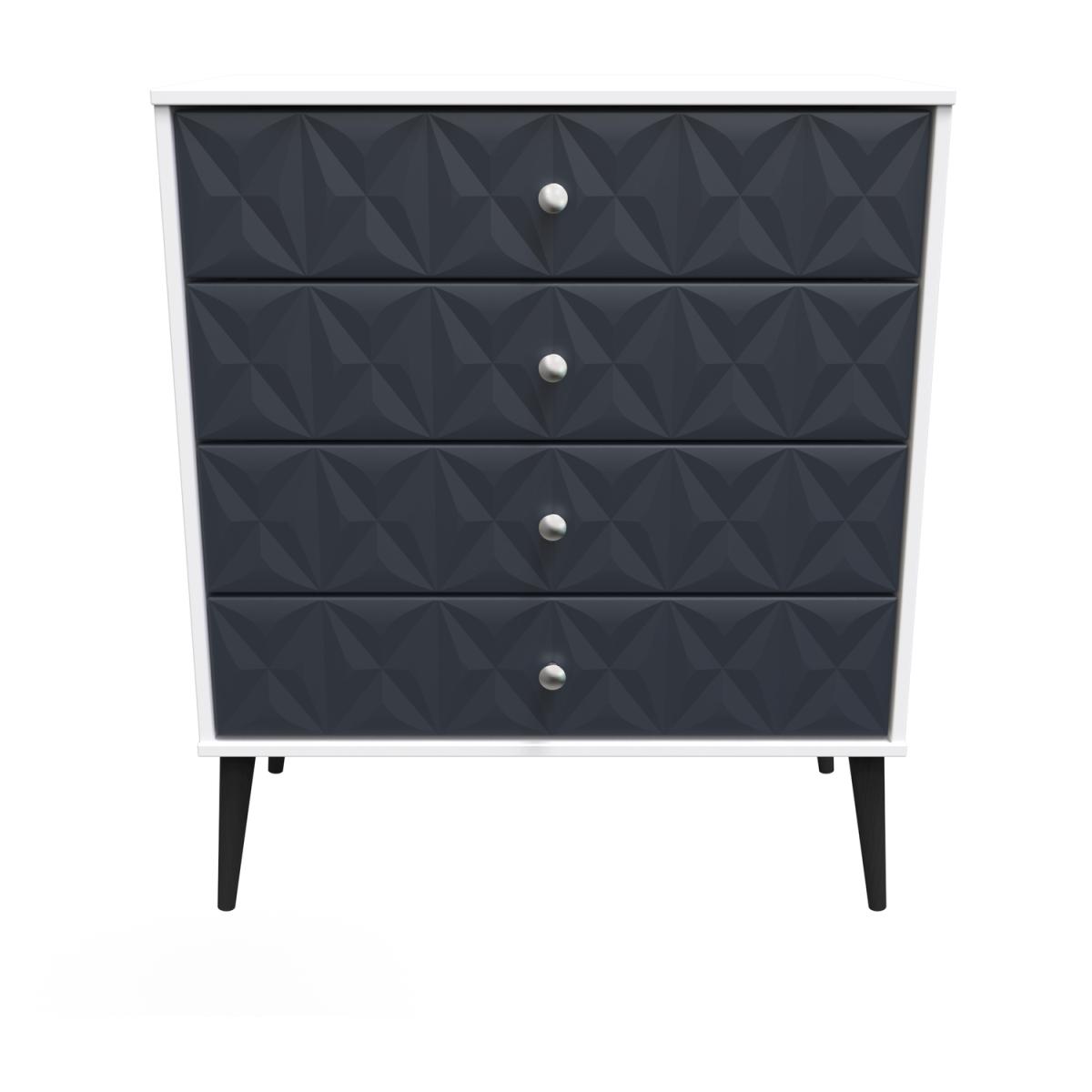 This wide 4 drawer chest of drawers is practical and stylish. Perfect for any home as a free standing storage unit. A modern and distinctive range. Named for the unique "Pixel" patten of the drawer and door fronts. Also features Black Metal Handles and Black Hairpin Legs. Comes in a wide range of colours including eye cathching two tone colour combinations. All our furniture is made in the United Kingdom, to the highest quality. It is delivered direct to your location of choice by one of our two man delivery teams, and come full assembled (although legs may be removed to prevent damage in transit).