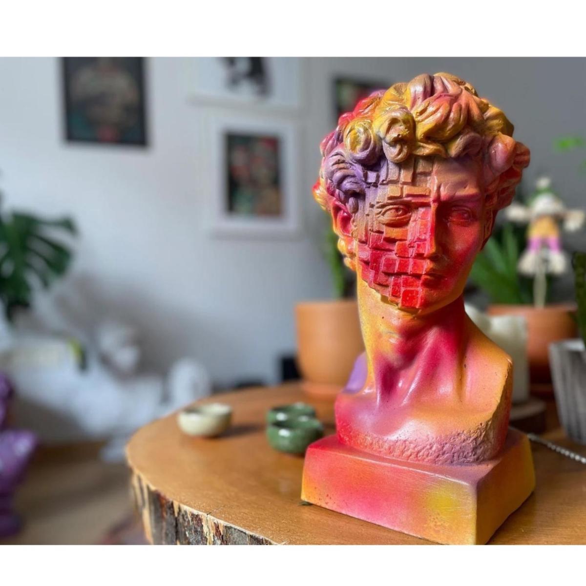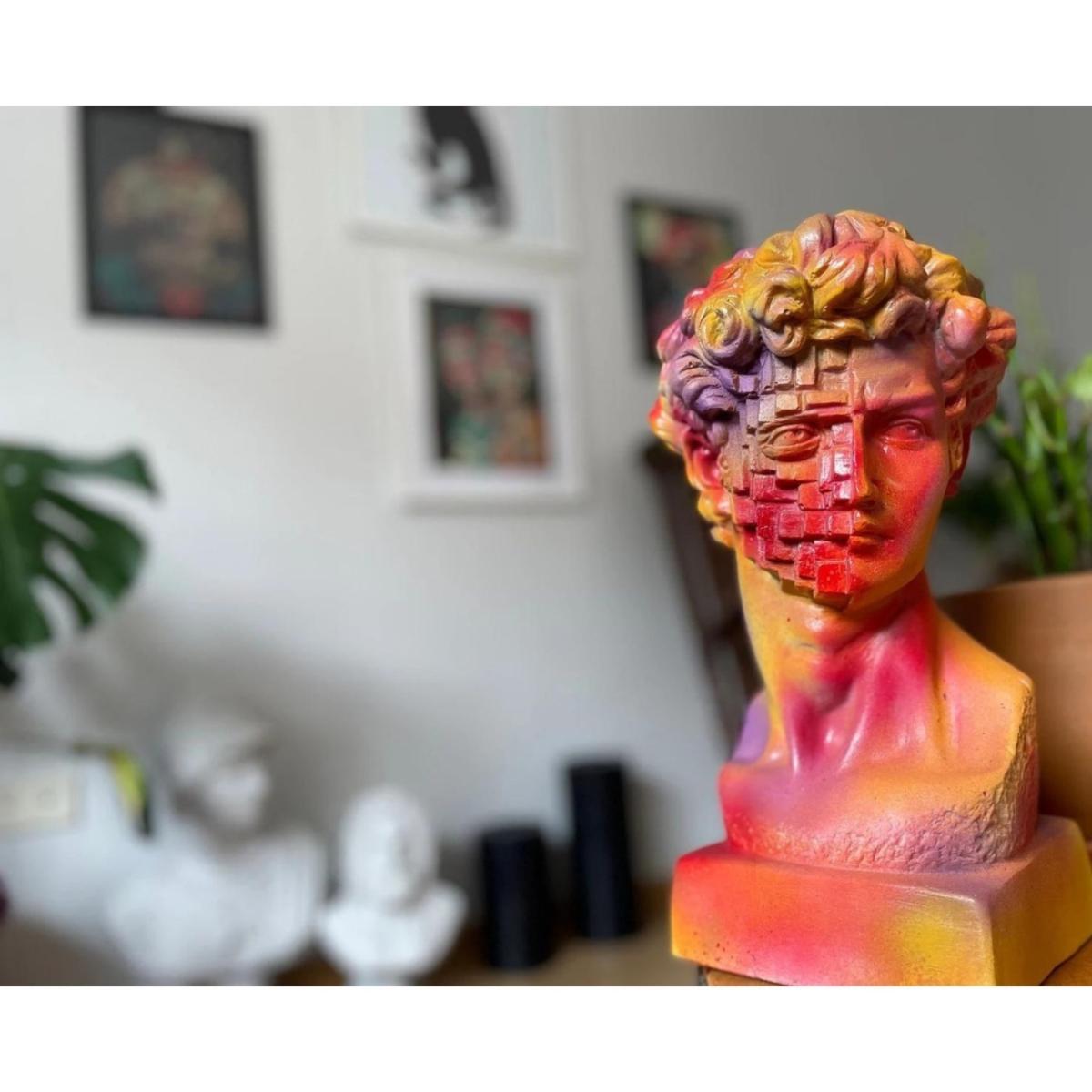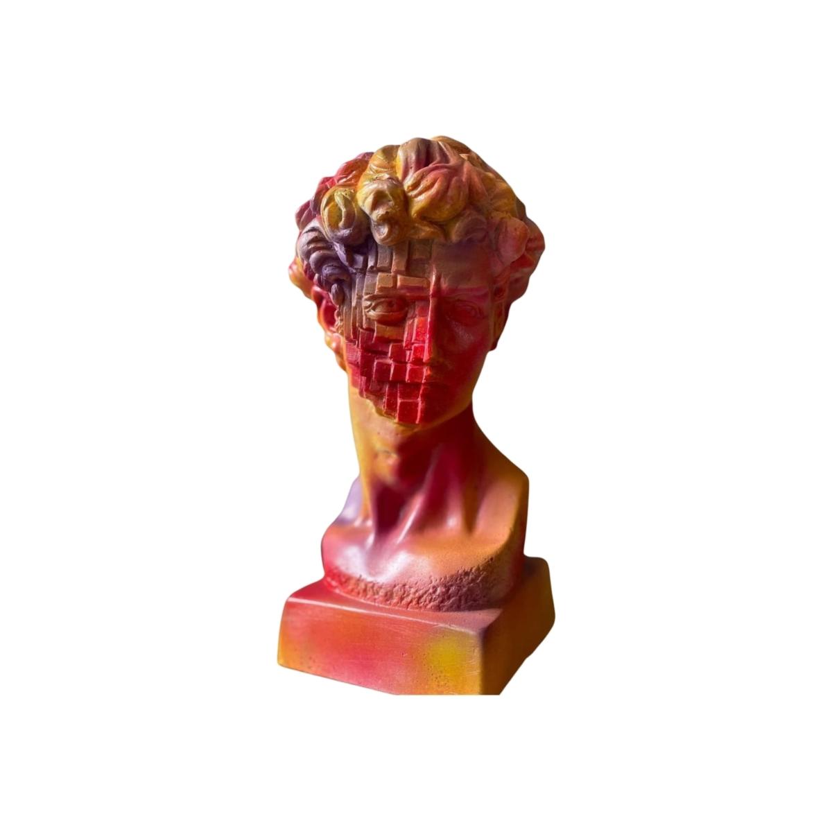 "Pixelated David" is a striking 34 x 20 cm sculpture that reimagines the iconic Michelangelo's David with a contemporary twist. This large piece is vibrantly colored, infusing modern energy into the classical form. What sets this sculpture apart is the innovative use of LEGO-like blocks on half of David's face, creating a pixelated effect that symbolizes the fusion of classical art and digital modernity. This sculpture is perfect for art enthusiasts who appreciate the blend of timeless masterpieces with bold, modern interpretations, making it a standout piece for any collection. Gently dust your sculpture with a soft, dry cloth or a feather duster.