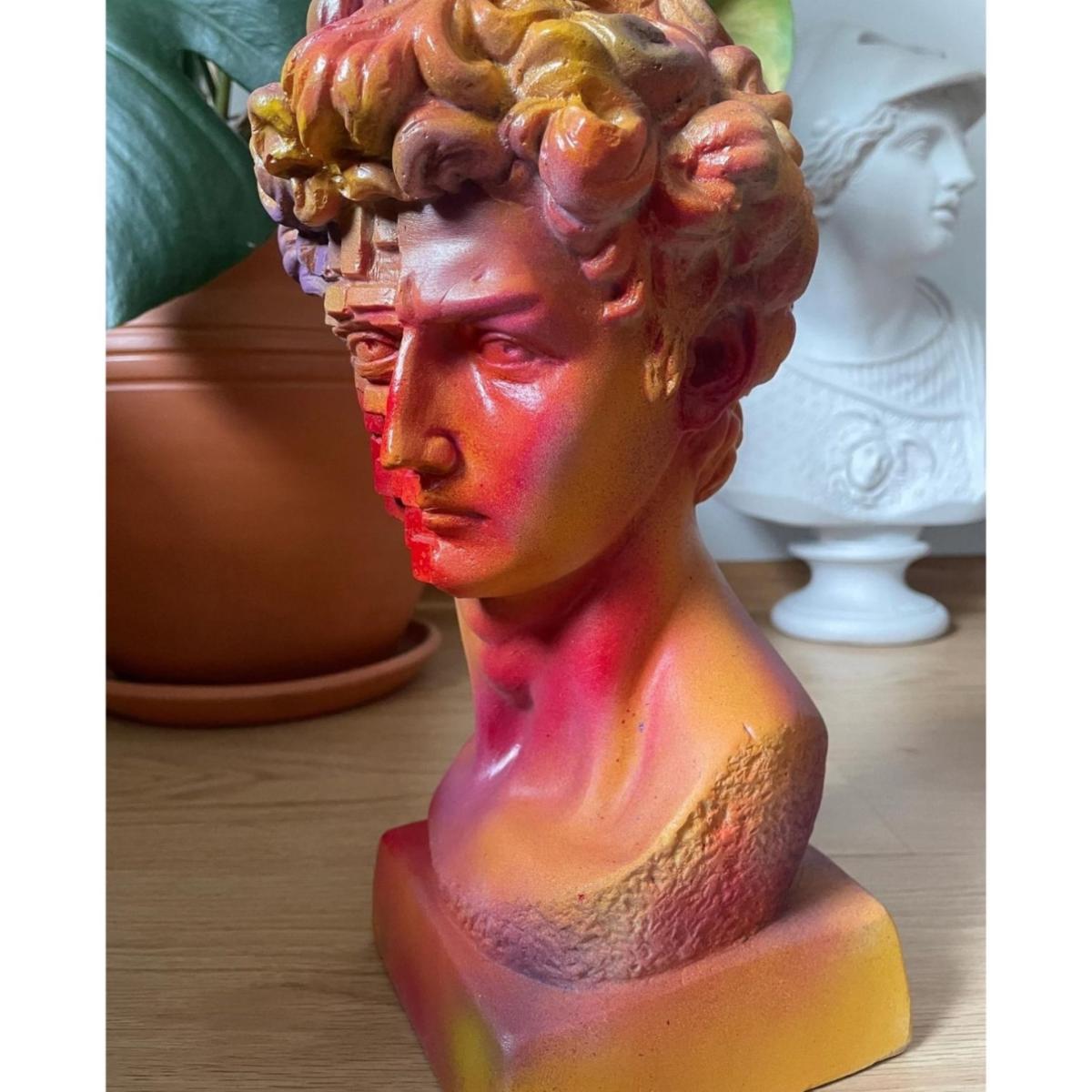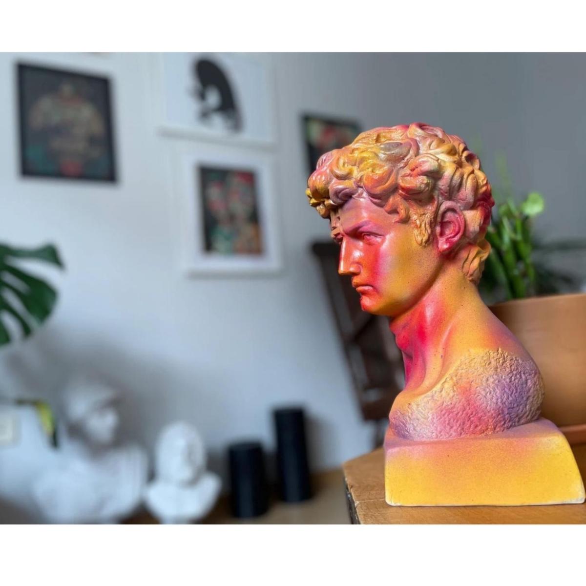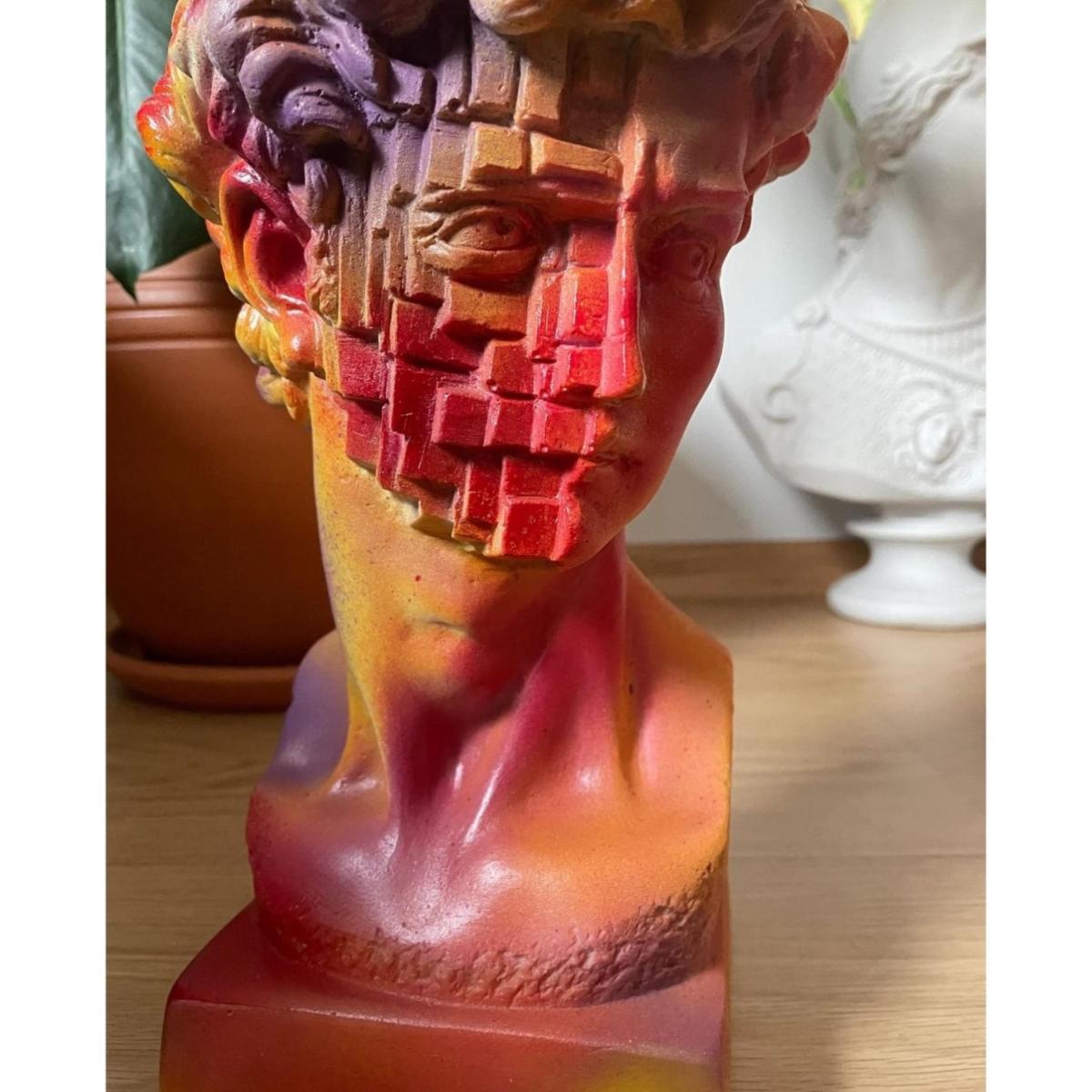 "Pixelated David" is a striking 34 x 20 cm sculpture that reimagines the iconic Michelangelo's David with a contemporary twist. This large piece is vibrantly colored, infusing modern energy into the classical form. What sets this sculpture apart is the innovative use of LEGO-like blocks on half of David's face, creating a pixelated effect that symbolizes the fusion of classical art and digital modernity. This sculpture is perfect for art enthusiasts who appreciate the blend of timeless masterpieces with bold, modern interpretations, making it a standout piece for any collection. Gently dust your sculpture with a soft, dry cloth or a feather duster.