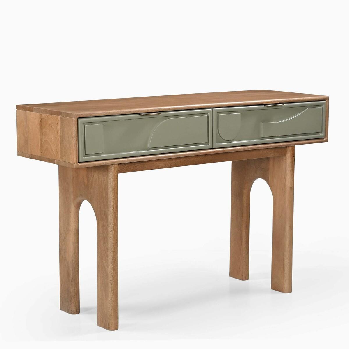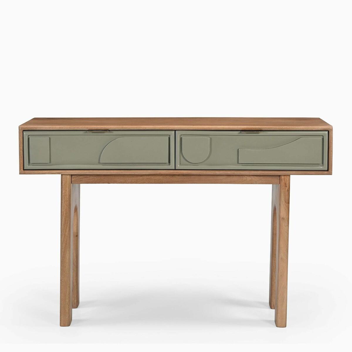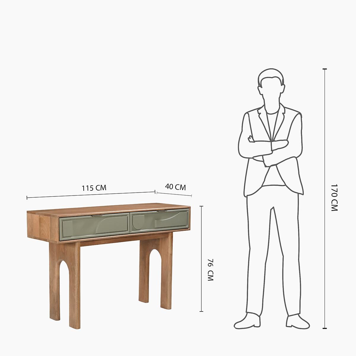 Style, simplicity, and sophistication— the Piza Collection embodies all three with effortless ease. This chic two-drawer console table, crafted from premium mango wood and finished in a refreshing cottage green, perfectly balances modern flair with eclectic charm. Designed to infuse any room with distinctive personality, it pairs beautifully with the Piza side table for a seamless, curated look. Product details• Mango wood• Sculptural panels• Gold accents• Number of drawers:2• Full assembly required. Product Composition - Mango Wood,Mdf. Product Dimensions - 115 cm x 40 cm x 76 cm , Weight - 28.4 KG• Internal drawer: 12 x 50 x 28 cm• Clearance to floor: 56 cm Package Dimensions - 124 cm x 49 cm x 45 cm, Weight 36.5 kg. This product will be dispatched by one of our trusted suppliers. You’ll be contacted by their selected courier about your delivery.