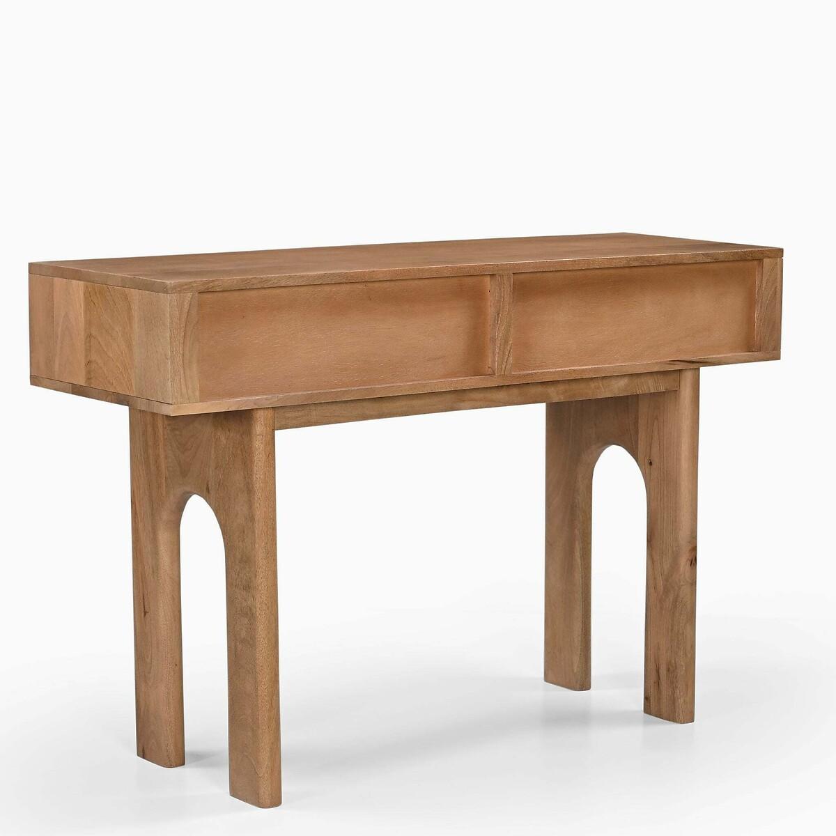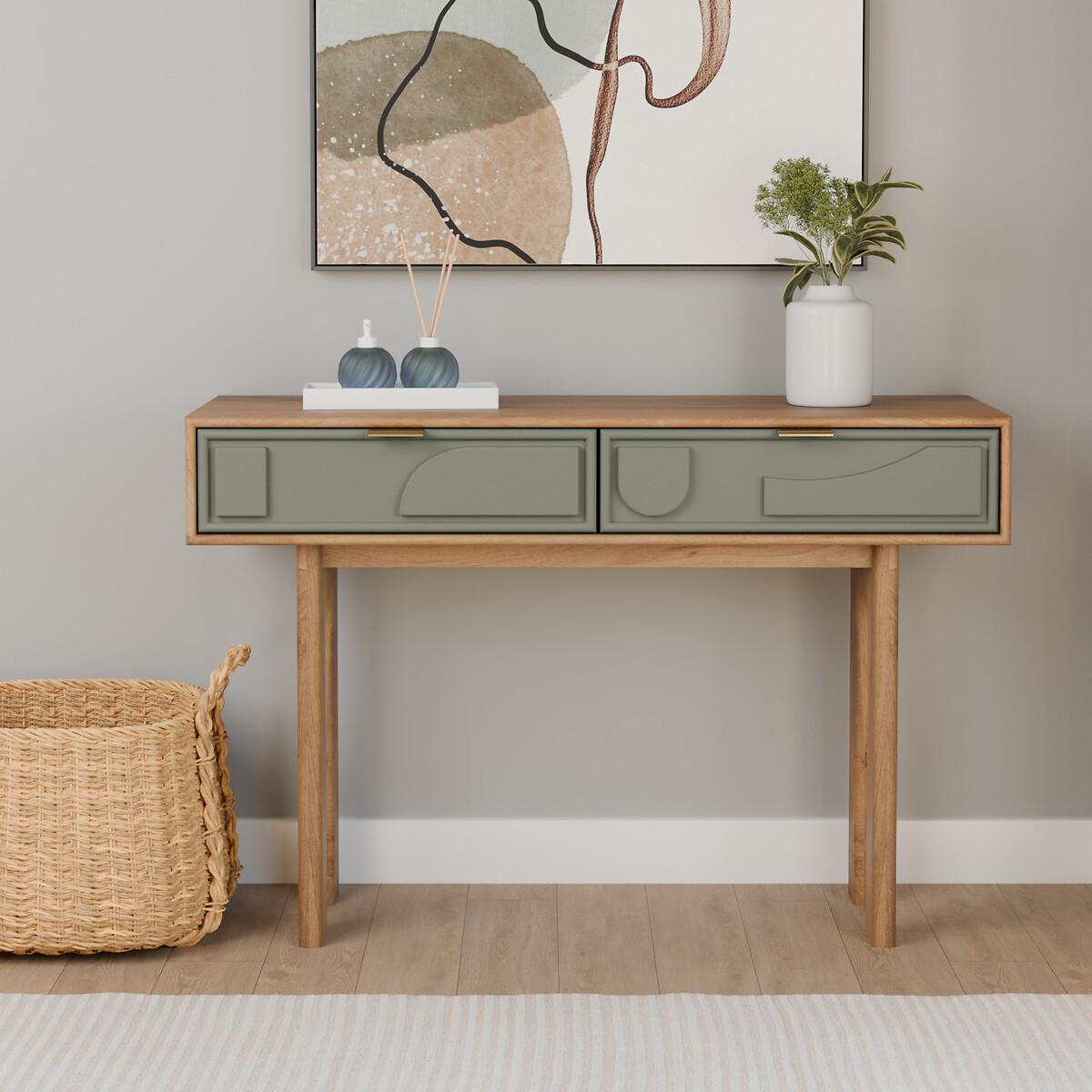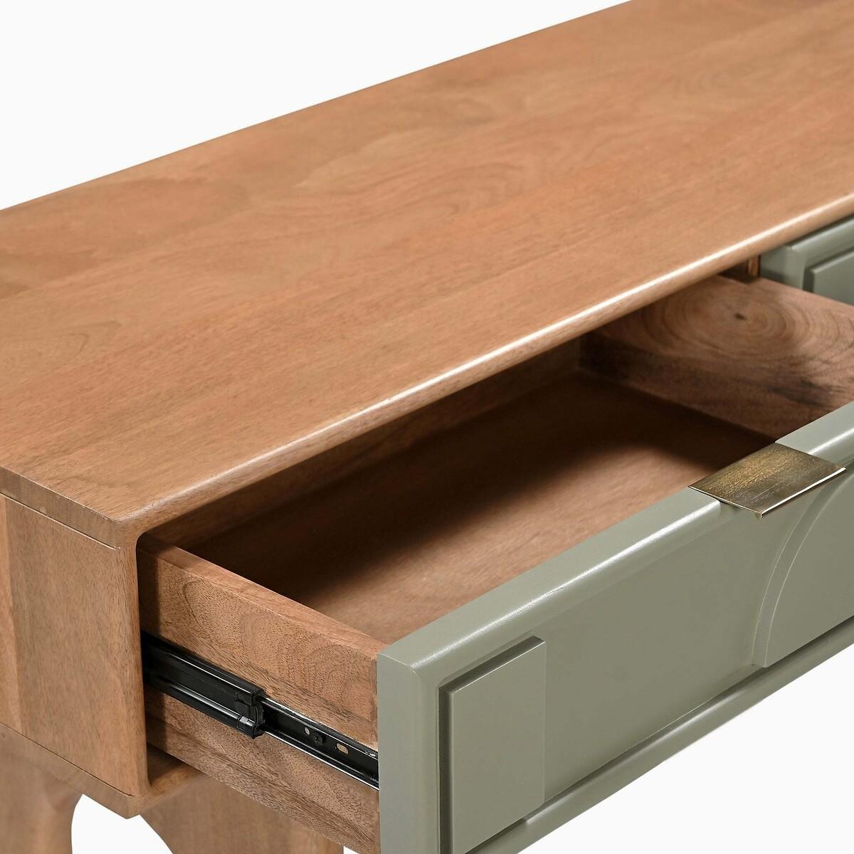 Style, simplicity, and sophistication— the Piza Collection embodies all three with effortless ease. This chic two-drawer console table, crafted from premium mango wood and finished in a refreshing cottage green, perfectly balances modern flair with eclectic charm. Designed to infuse any room with distinctive personality, it pairs beautifully with the Piza side table for a seamless, curated look. Product details• Mango wood• Sculptural panels• Gold accents• Number of drawers:2• Full assembly required. Product Composition - Mango Wood,Mdf. Product Dimensions - 115 cm x 40 cm x 76 cm , Weight - 28.4 KG• Internal drawer: 12 x 50 x 28 cm• Clearance to floor: 56 cm Package Dimensions - 124 cm x 49 cm x 45 cm, Weight 36.5 kg. This product will be dispatched by one of our trusted suppliers. You’ll be contacted by their selected courier about your delivery.