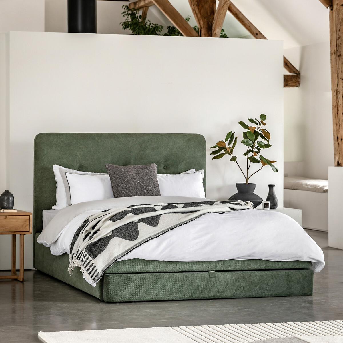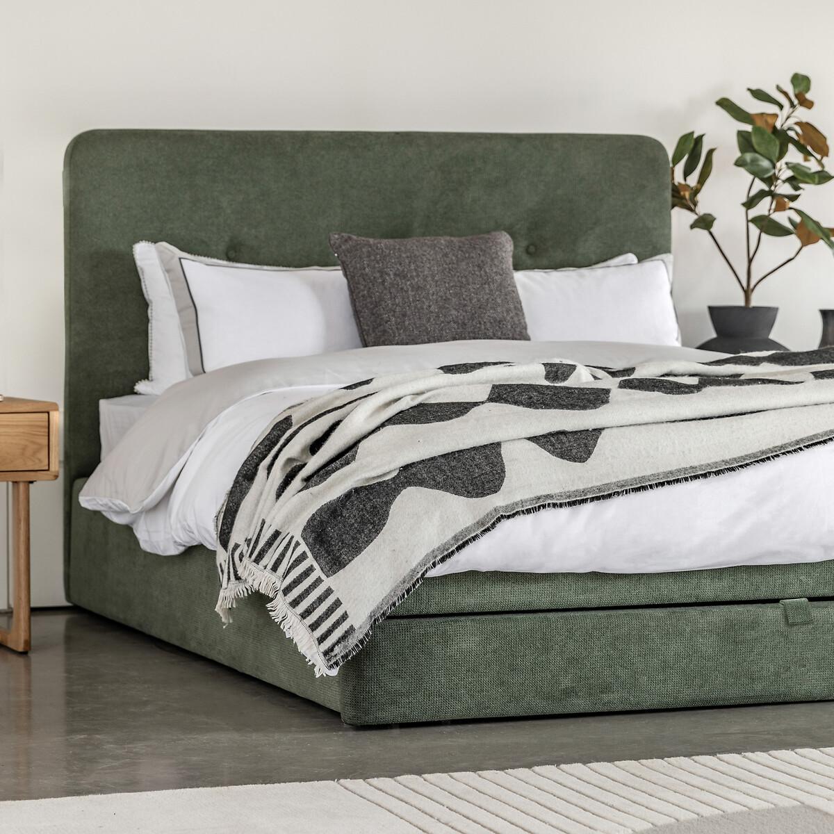 Singularly simple and classy, with a secret storage drawer - what's not to love? A classic buttoned headboard is given a modern update with rounded corners. A single end drawer is the perfect storage solution for longer narrower bedroom which can't fit a bed traditional side drawers. The large space features two compartments to help you keep organised - perfect for hiding away shoes or spare bedding. Product details • Fully upholstered in a soft waffle weave fabric • Buttoned upholstery • Floorstanding headboard • Metal feet • Storage accessible via a single drawer at the foot of the bed with two compartments • Supplied with slatted base • Mattress not included • Full assembly required Product Composition - Fabric / Wood / Foam. Product Dimensions Double • Overall Dimensions - L205cm x W149cm • Weight - 42 KG • Headboard height from floor - 120 cm • Footboard height - 33.5 cm • Leg height - 2.5 cm • Clearance to floor - 2.5 cm • Storage drawer compartment - W63.7 x D45.6 x H14.7cm King • Overall Dimensions - L216cm x W164cm • Weight - 47 KG • Headboard height from floor - 120 cm • Footboard height - 33.5 cm • Leg height - 2.5 cm • Clearance to floor - 2.5 cm • Storage drawer compartment - W71.2 x D45.6 x H14.7 cm Package Dimensions Double • Package 1 - 154cm x 121cm x 12cm Weight - 16 KG • Package 2 - 197cm x 39cm x 25cm Weight - 16 KG • Package 3 - 140cm x 51cm x 22cm Weight - 16 KGKing • Package 1 - 169cm x 121cm x 12cm Weight - 17 KG • Package 2 - 208cm x 39cm x 25cm Weight - 19 KG • Package 3 - 155cm x 51cm x 22cm Weight - 17 KGThis product will be dispatched by one of our trusted suppliers. You’ll be contacted by their selected courier about your delivery. Please note: this product cannot be delivered to all Offshore Islands, Northern Ireland or Republic of Ireland. GALLE01