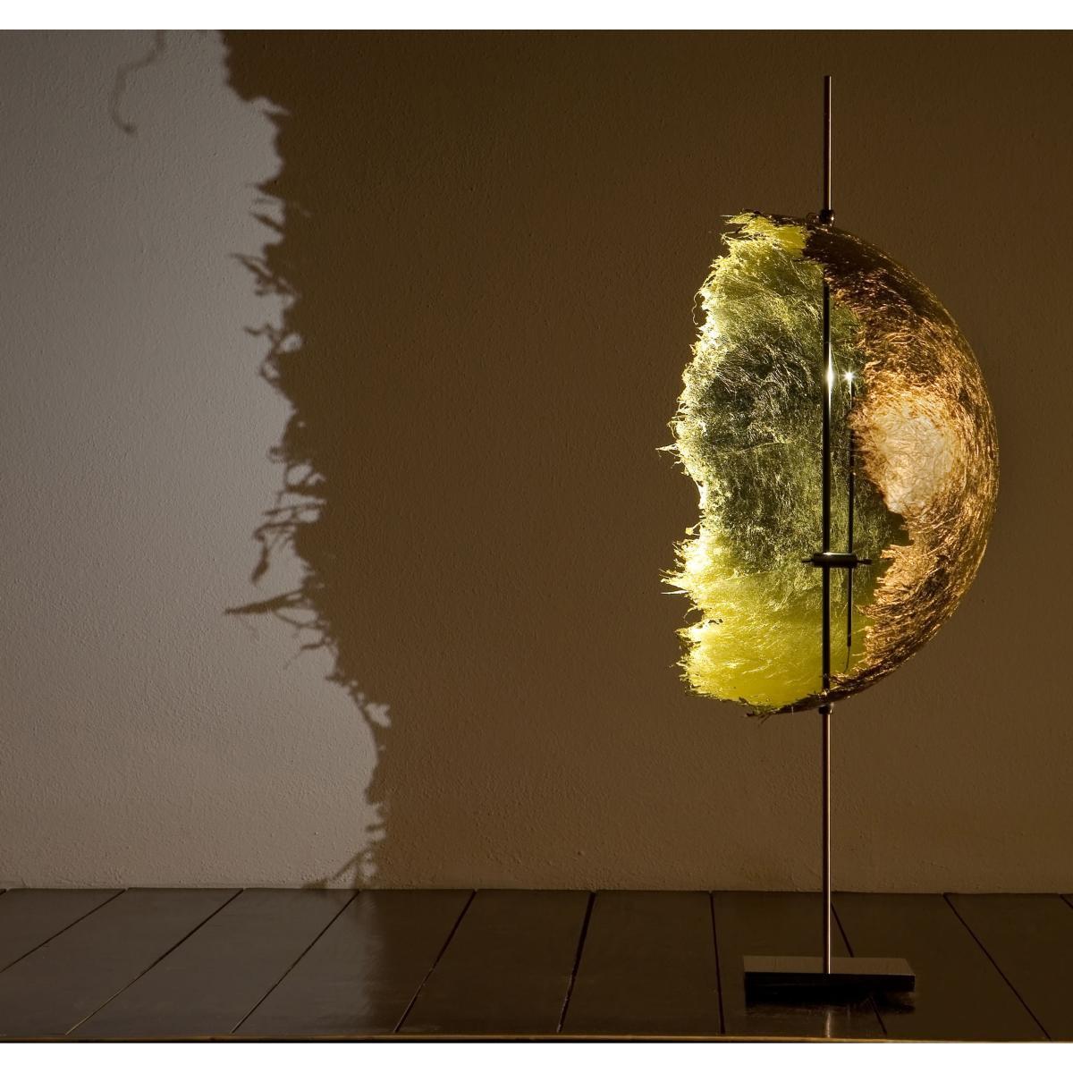 Give your home a new solar dimension with this poetic and original table lamp! Spectacular switched off or lit, PK LED is a half-sphere in fiberglass, crossed by a plated-copper stick. When switched on, it splashes the walls of a soft indirect light, ideal light to create a relaxing atmosphere. Available in the colors gold, silver and white, PK LED will adapt itself to the sober, baroque, or modern decorations.