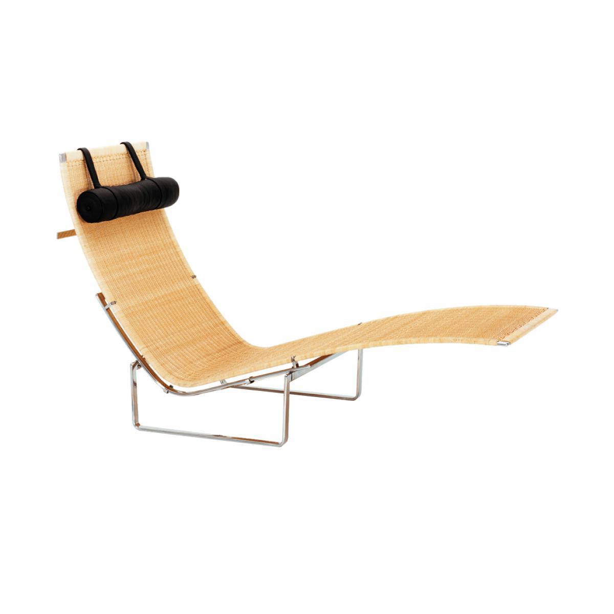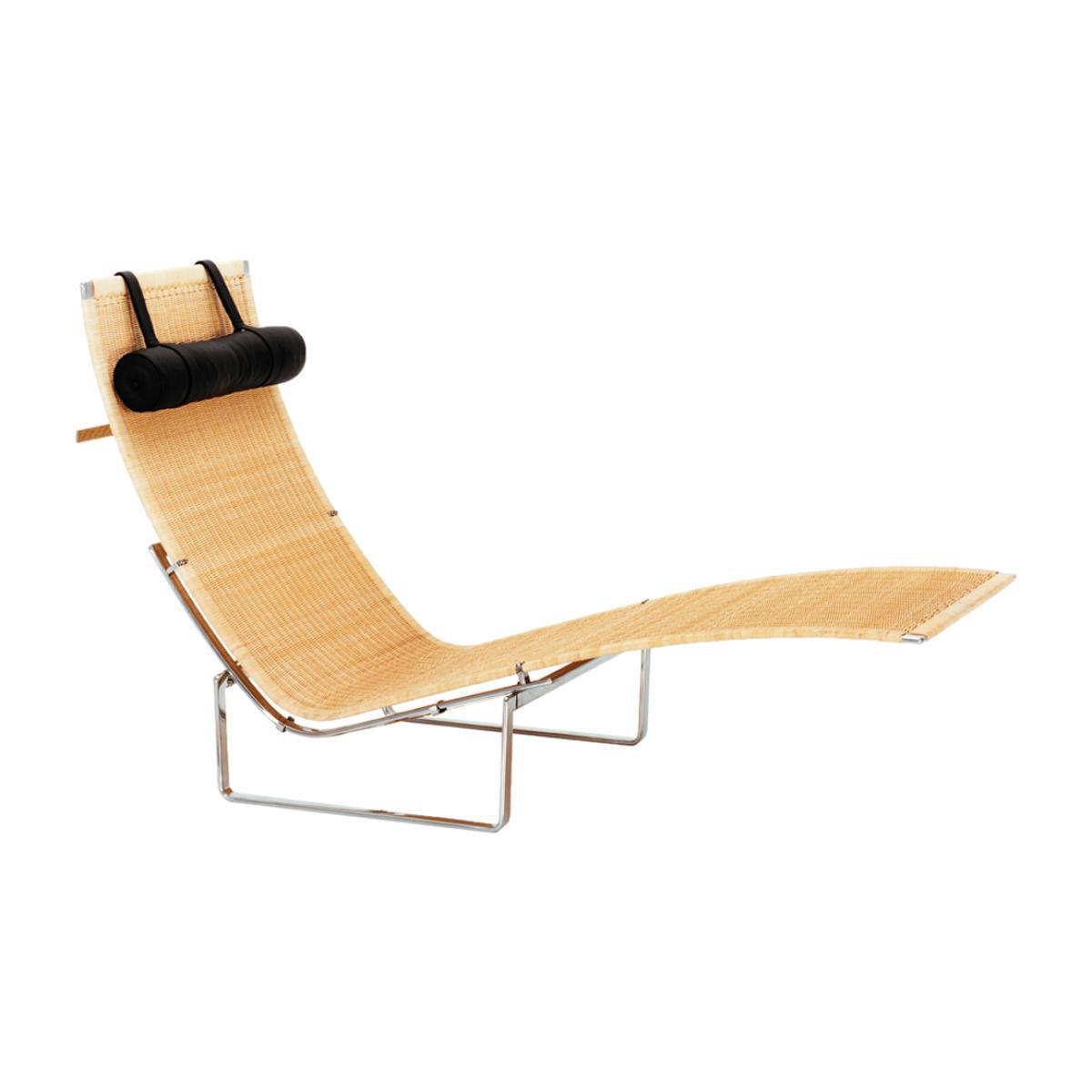 Inspired by the concept of the French chaise longue from the Rococo period, the PK24 Lounge Chair with a Grace leather headrest is undoubtedly one of Danish designer, Poul Kjaerholm's most recognisable works. Designed in 1965, the chair is a fine example of Kjaerholm's principle of constructing pieces with independent components. Consequently, the body and the frame of the PK24 chair are held in place only by gravity and the friction of these elements, and not by any physical connection, hence its other name, the 'Hammock Chair'. The organically shaped wicker seat with leather headrest, rest seemingly suspended, above a satin-brushed stainless steel frame.