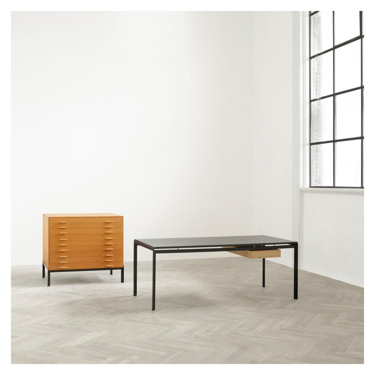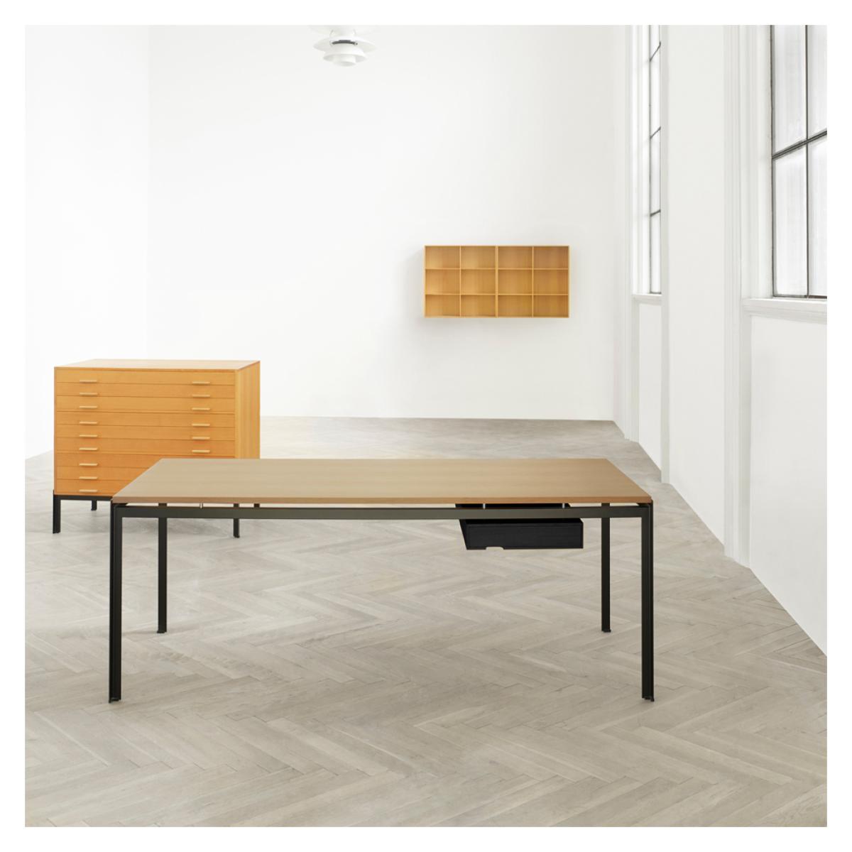 First designed in 1955 for the Royal Danish Academy of Fine Arts, Poul Kjærholm's PK52 Professor Desk and drawer has been revived and reissued by Carl Hansen & Son, showcasing the designer's mastery of functionalist furniture. Featuring a light and simple design, the PK52 Professor Desk and integrated drawer can be used as a desk, dining table or even a functional work table in design studios for an uncomplicated and elegant aesthetic. Drawing on his training as a cabinetmaker, Kjærholm's PK52 Professor Desk is accented with an integrated drawer and reversible oak table top, resting on spacers to give it the appearance of hovering above its powder-coated steel frame. With a premium oak table top in a choice of stained or Danish-oiled finishes, the PK52 Professor Desk would make the ultimate versatile addition to an array of spaces.