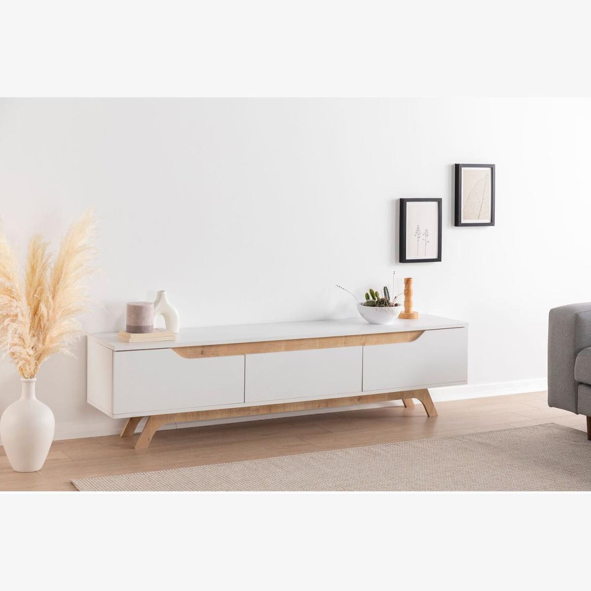I love this white TV unit for its clean, minimalist aesthetic which makes it versatile across various interior styles, from Scandi to contemporary spaces. Its neutral tone allows it to blend seamlessly into most colour schemes, while the wooden accents add a touch of warmth. Practical styling tips include layering a few decorative objects like vases and small plants to personalise the look, and keeping the top clutter-free for a sleek, organised appearance. It works particularly well in open-plan living rooms or spaces where you want the TV to be a subtle focal point without overwhelming the room’s decor.
