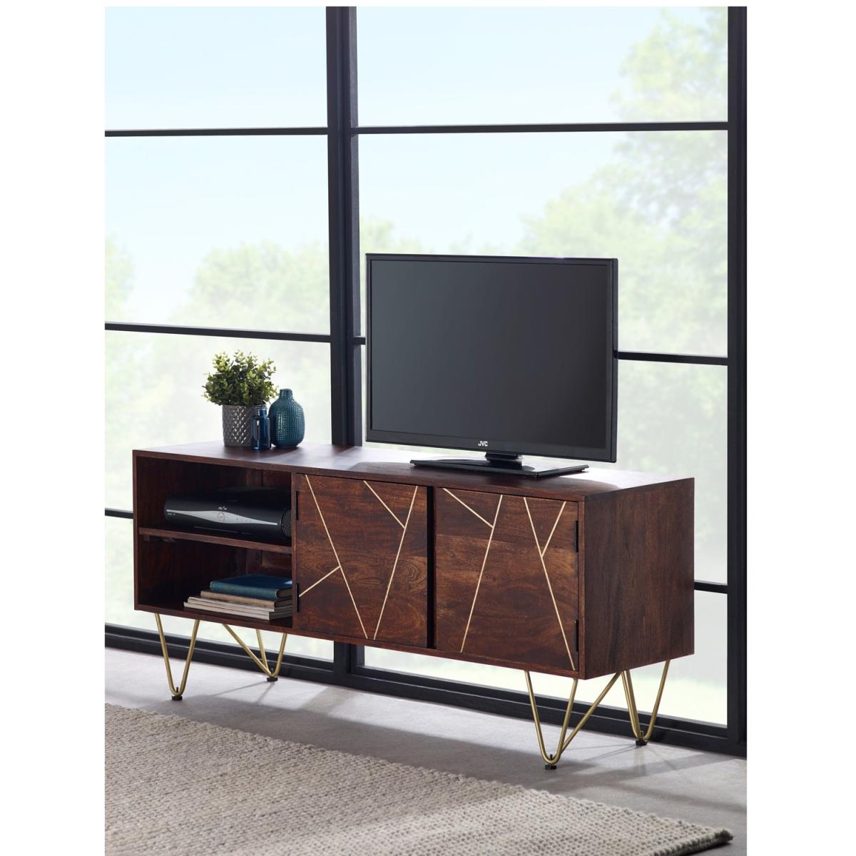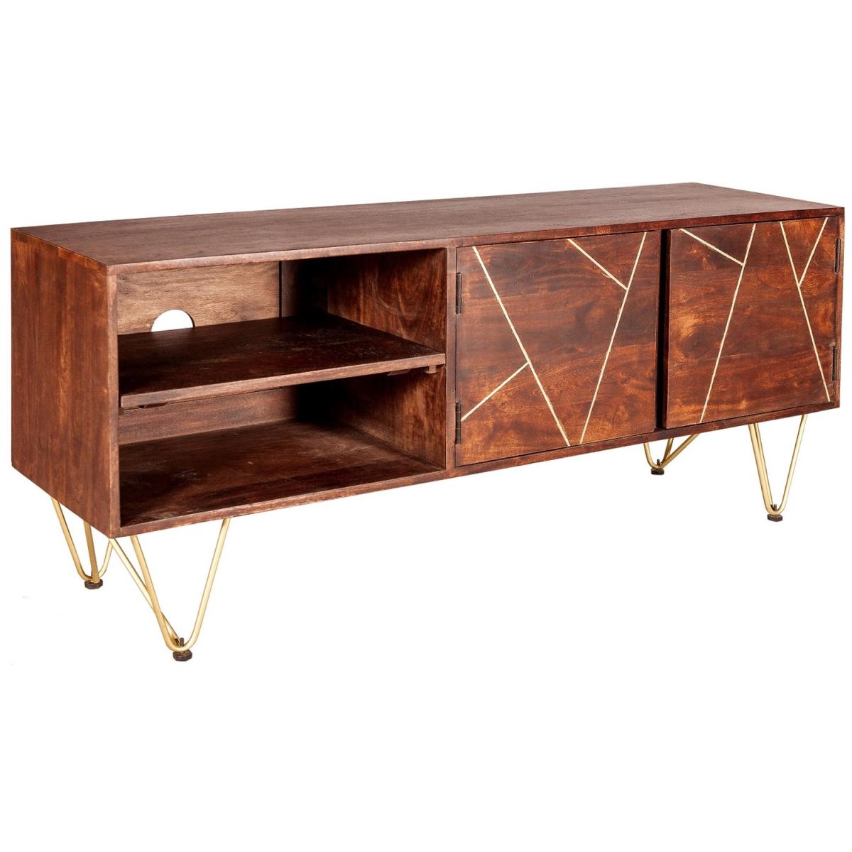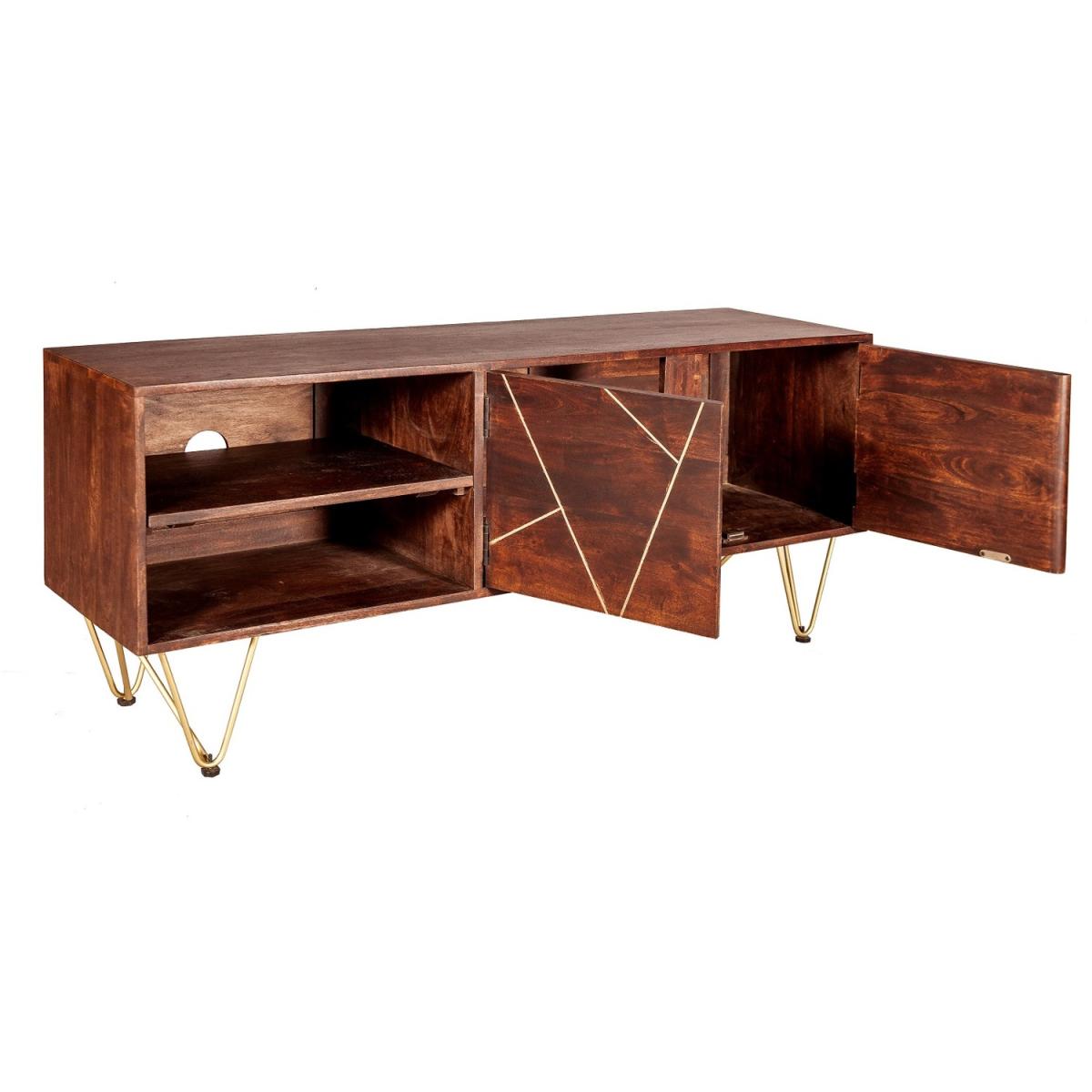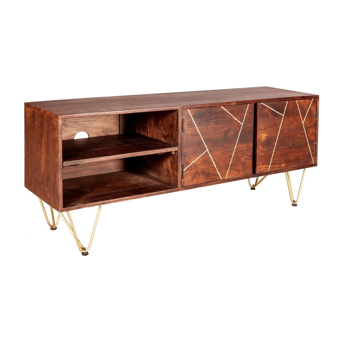 Plasma Media Unit featuring 2 shelves and 2 doors complemented with gold metal legs and gold metal inlays on the front of the unit. Made from 100% mango wood. Handmade from solid mango wood throughout and reclaimed metal you will never get tired of watching TV on this stunning piece of furniture in a dark walnut colour with shiny gold metal inlay. Designed to accommodate most TV sizes with the spacious 140cm width it will be a stylish focal point of your room. The two shelves have the capacity to hold most games consoles, TV boxes, hubs etc while the large cupboard can store away any clutter, remote controls, games etc. The answer to all your entertainment equipment kept tidy and accessible in one place!