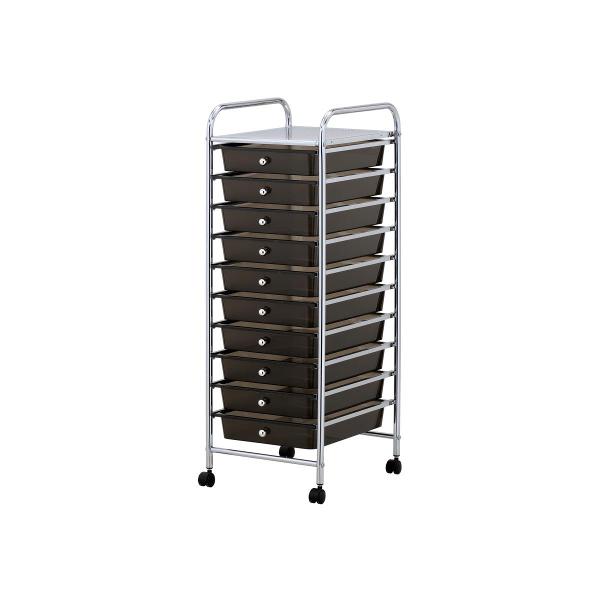 Introduce portable organisation into your home today with our 10 Drawer Trolley. Use the 10 drawers to easily pack away home accessories, trinkets, and more, and keep the practical drawer trolley in any room. Thanks to its compact shape and versatile yet modern design, the trolley can be kept in the bedroom, living room, kitchen, and more. Made with a tough steel frame, the trolley features durable PP drawers that are built to last. Easily transport the lightweight trolley throughout your home thanks to its smooth 360 castor wheels.