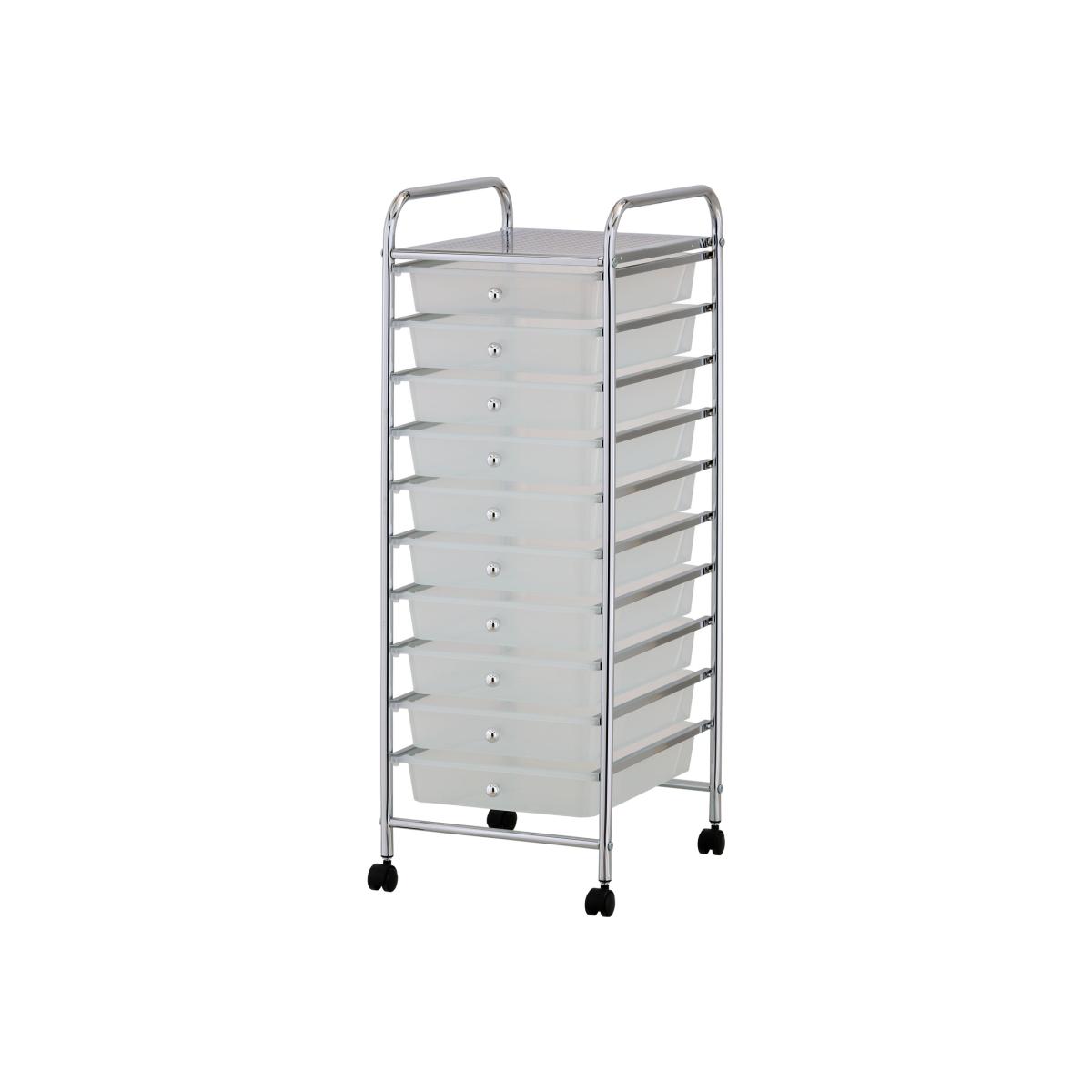 Introduce portable organisation into your home today with our 10 Drawer Trolley. Use the 10 drawers to easily pack away home accessories, trinkets, and more, and keep the practical drawer trolley in any room. Thanks to its compact shape and versatile yet modern design, the trolley can be kept in the bedroom, living room, kitchen, and more. Made with a tough steel frame, the trolley features durable PP drawers that are built to last. Easily transport the lightweight trolley throughout your home thanks to its smooth 360 castor wheels.
