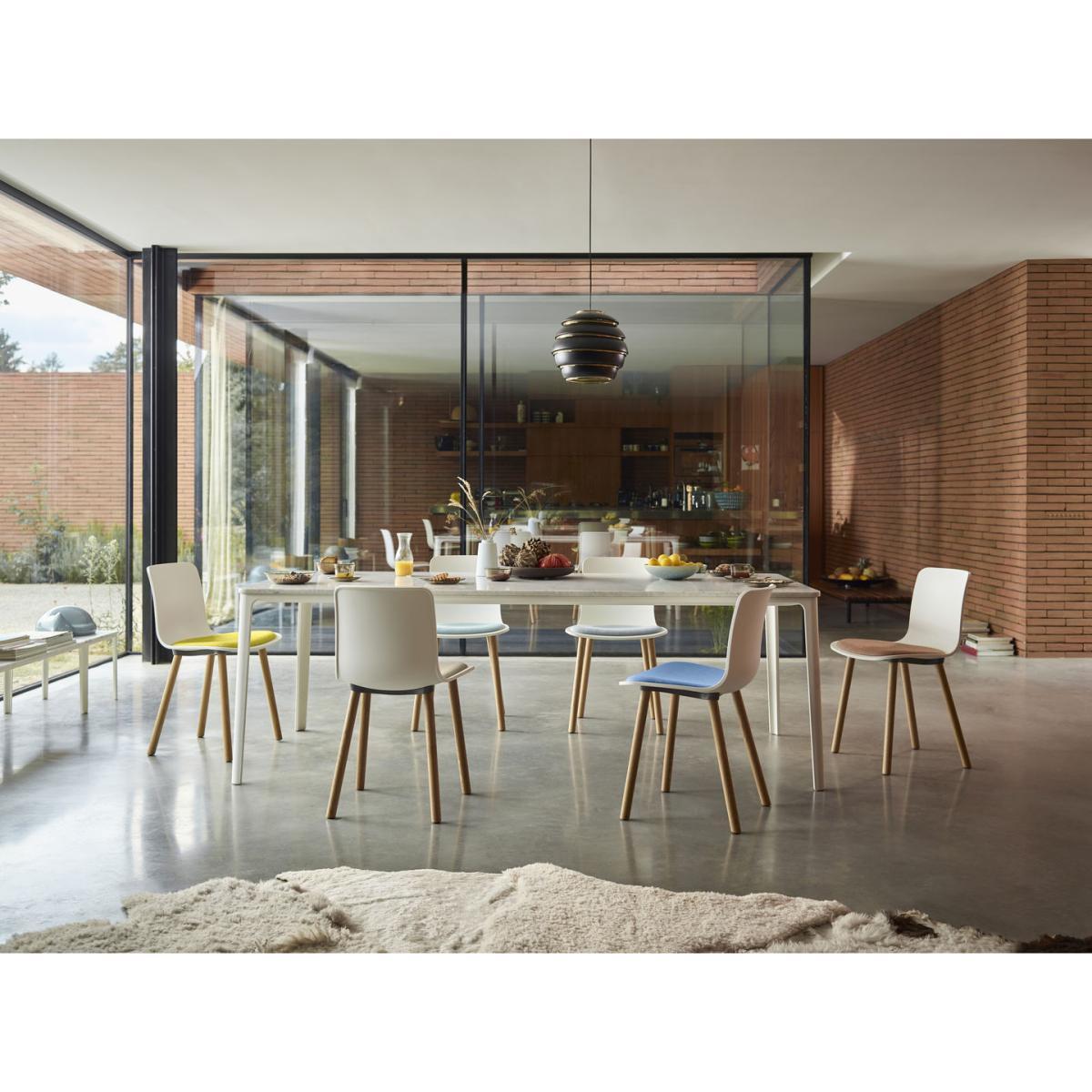 Jasper Morrison is one of the most successful industrial designers of recent decades. A champion of the "super-normal", he advocates sober, useful, responsible design. His creations are represented in the Museum of Modern Art in New York and other collections of eminent museums around the world. In keeping with Jasper Morrison's “super normal” design philosophy, his Plate Tables stand out for their modest appearance, classic shape and skilfully balanced proportions. Morrison explains: “The objects that work best don't do so because they’re beautiful or precious, but because, by their nature, they excel in their field. ” Available in different sizes, they draw their charm from the successful interaction of subtly rounded contours and precisely drawn edges. The tapered legs with their quarter-circle profile and slender frame follow the principle of efficient use of materials - as much as necessary, as little as possible - which gives the elegant table its slender silhouette. Details such as the slightly inclined legs or slight overhang of the table top are reminiscent of archetypal tables and, at the same time, their modern interpretation. Thanks to the subtle combination of formal elements and constructive details, the Plate Dining Table immediately looks familiar and natural in any interior. Thanks to its sober, refined look, the Plate Dining Table can be combined with a wide variety of chairs, contemporary or classic. The Plate Dining Table is available in several sizes and colours, with table tops in solid wood, glass, marble or MDF. This range means you can find a variant suited to the most diverse environments.