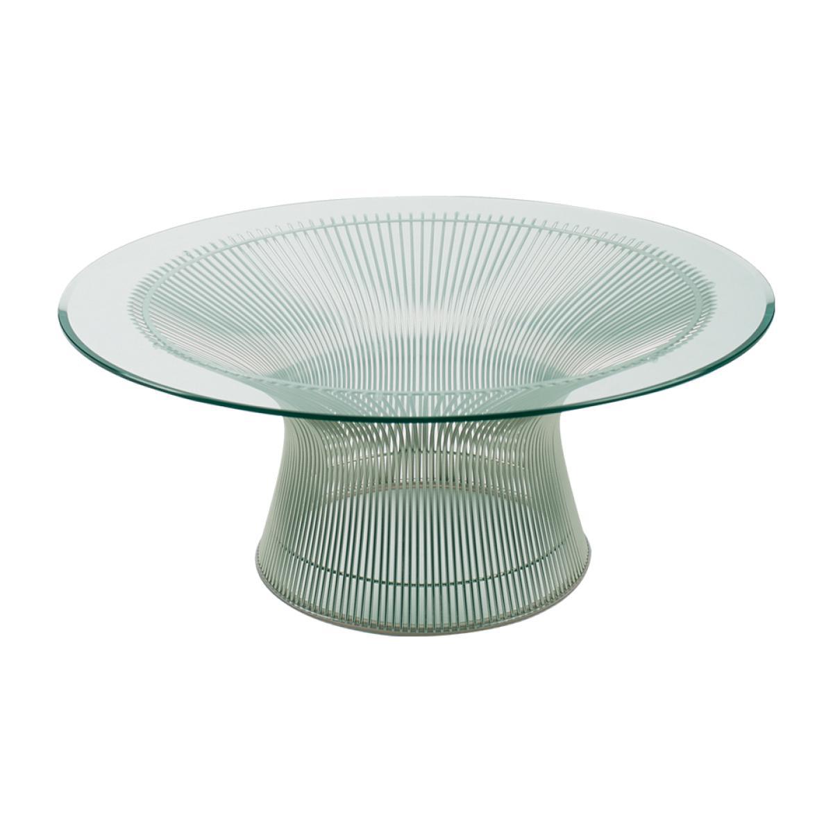 In the 1960s, Warren Platner transformed steel wire into a sculptural furniture collection, creating a design icon of the modern era. Its bold and elegant visual aesthetic is ideal for both the residential and commercial markets adding a touch of 60's classic glamour. Top options include clear glass, bronze glass and a variety of marble and veneer finishes. The base is available in two finish options: bright nickel finish with clear lacquer protection and painted metallic bronze