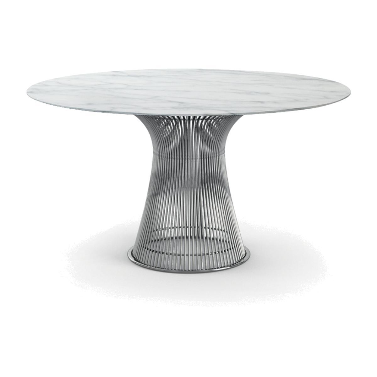 Originally designed by Warren Platner in 1966, the iconic Platner High Table in polished nickel and Arabescato Marble has been crafted by Knoll since it was introduced. Exquisitely crafted by welding hundreds of curved, nickel-plated steel rods to the circular frame, the Platner High Table is finished with a piece of uniquely veined Arabescato marble for a truly sleek and contemporary finish. Effortlessly sculptural, the table is an icon of modern design that would enhance any space with its clean lines and refined finish. Having studied at Cornell University with a degree in architecture and collaborated with legends such as Raymond Loewy, Eero Saarinen and I.M. Pei, Warren Platner is renowned across the globe for his iconic collection for Knoll.