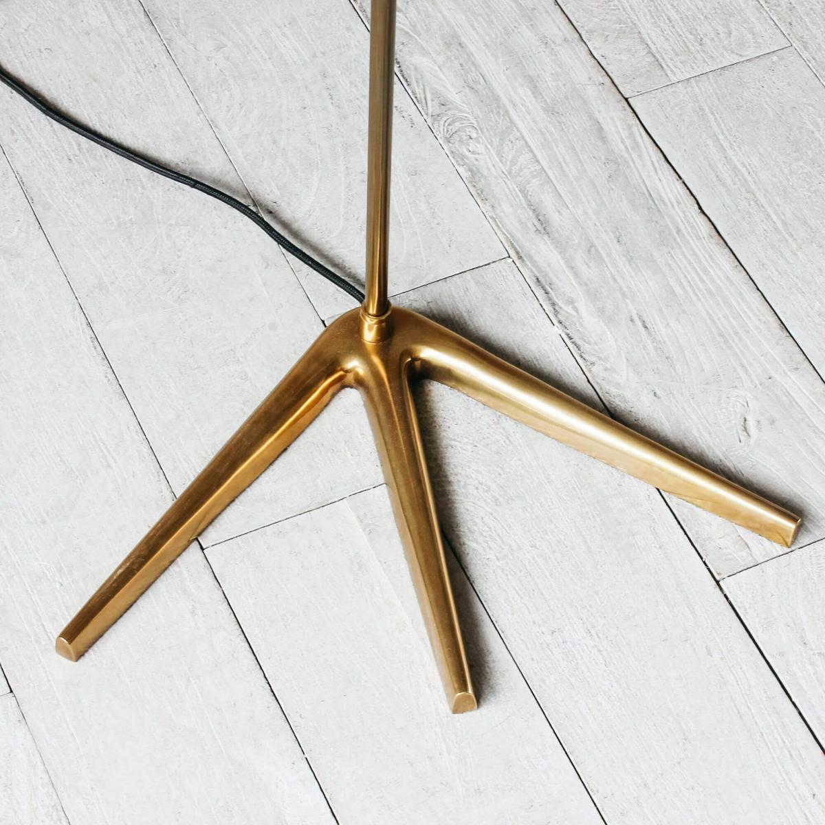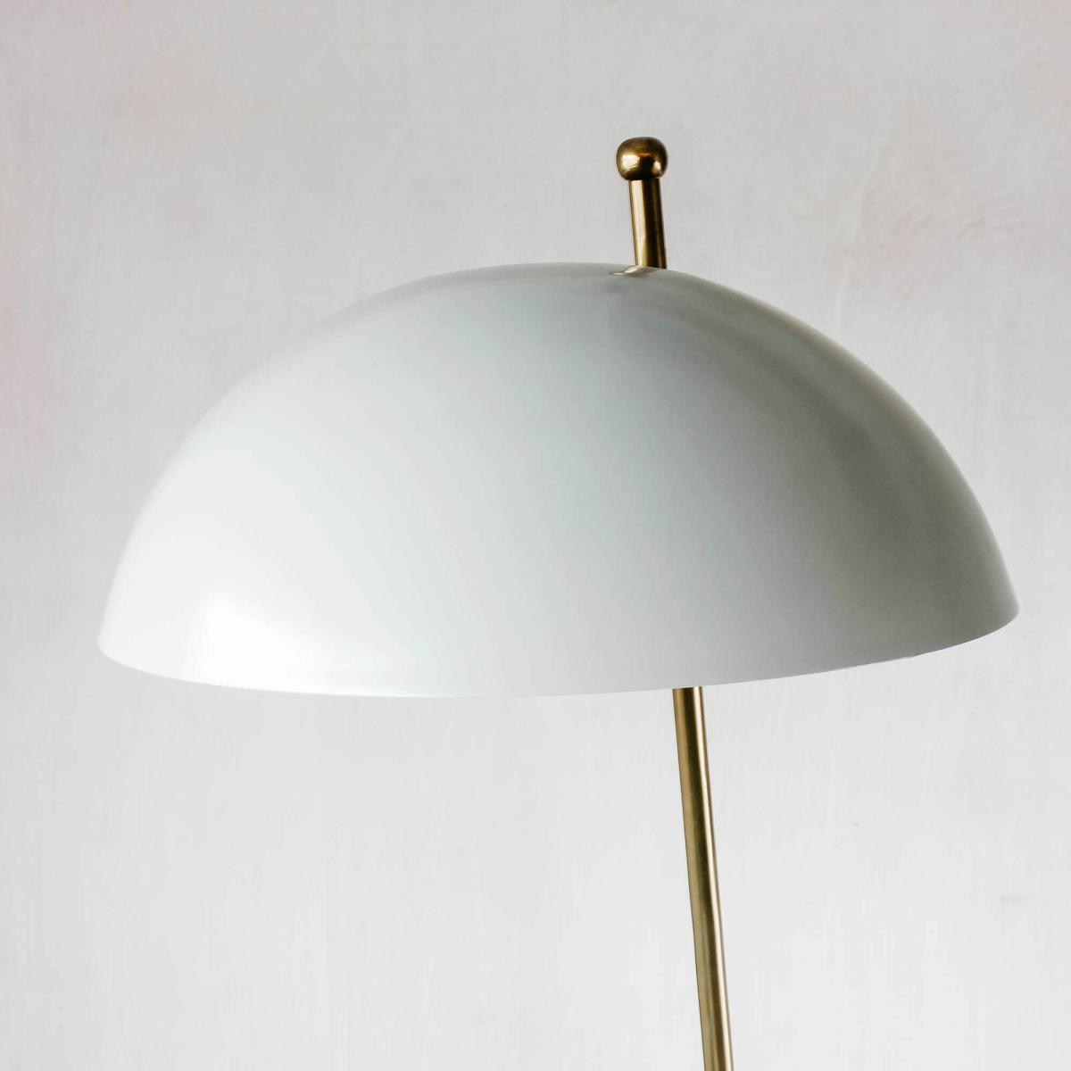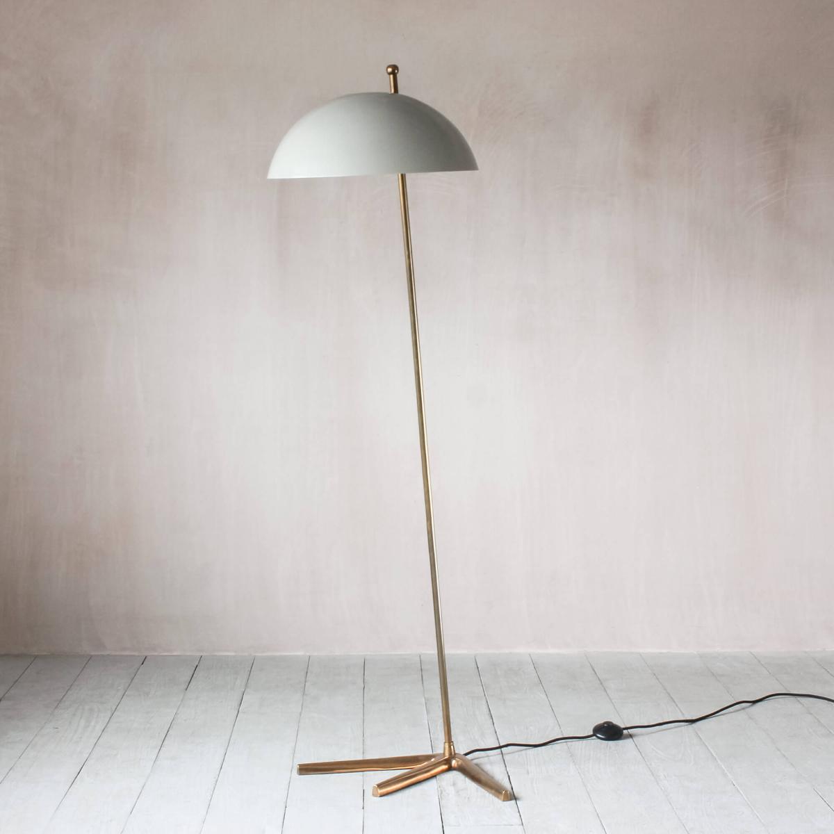 Set on a brass footed base and topped with a sleek grey dome, introduce a midcentury mood with the Platypus floor lamp.