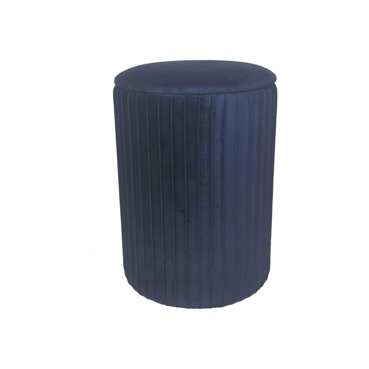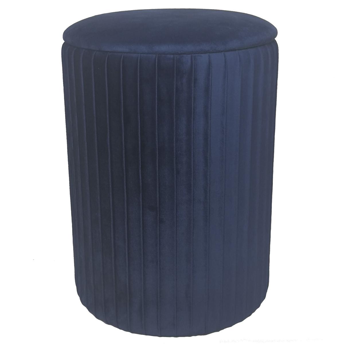 I love the navy pleated stool for its versatility and contemporary flair. Its rich colour and textured detailing make it a great statement piece in various interiors, from modern to transitional spaces. It's a practical addition as a side table or extra seating, especially in bedrooms and living rooms where functionality is key. To style it effectively, consider pairing it with light, neutral tones to let the colour pop, or with metallic accents to add a touch of elegance. The stool's compact size also makes it ideal for smaller spaces, while its storage function adds a useful element of organisation to busy households.