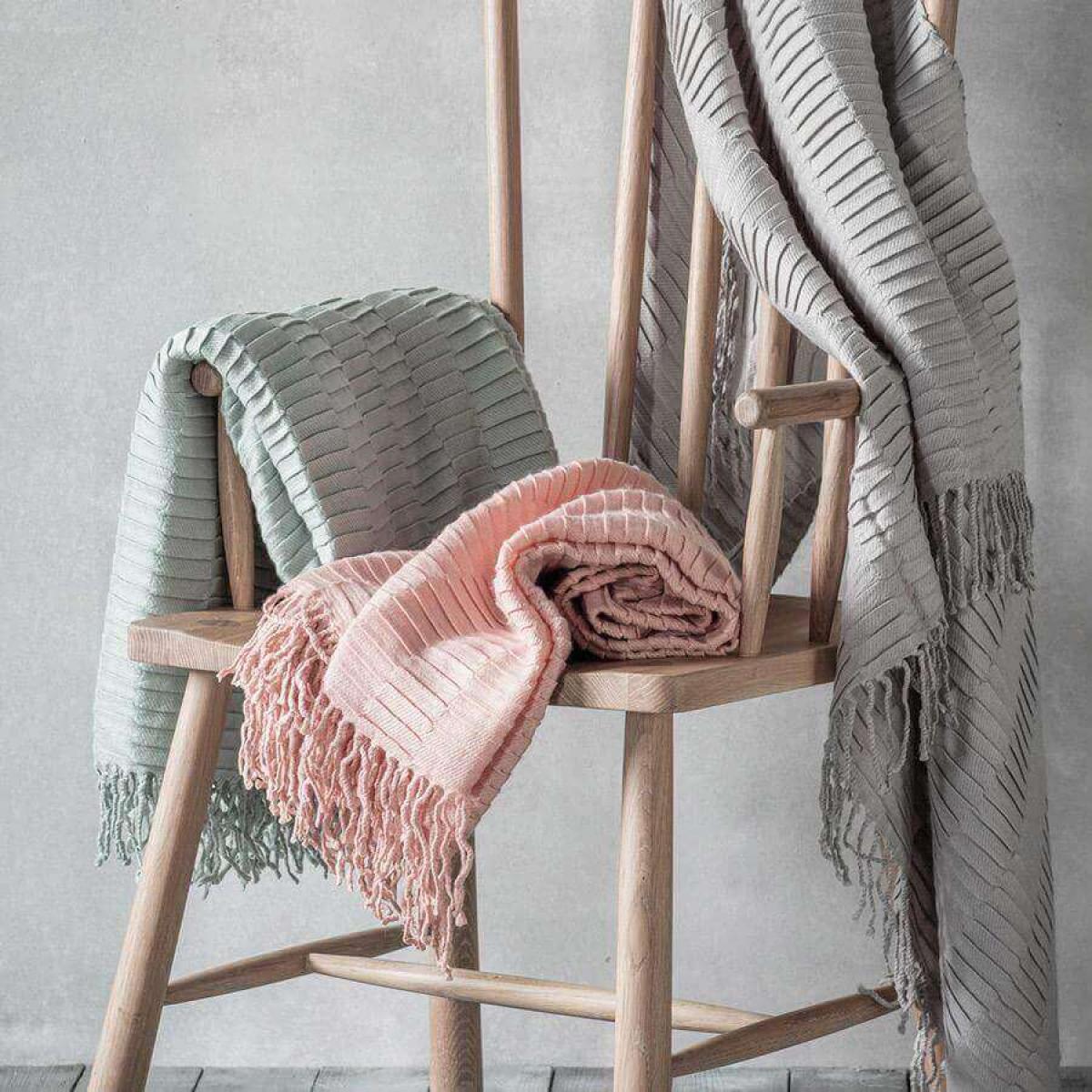 This blush pleated throw is beautifully simple and understated and has a fringed edging. Also available in grey and duck egg blue.