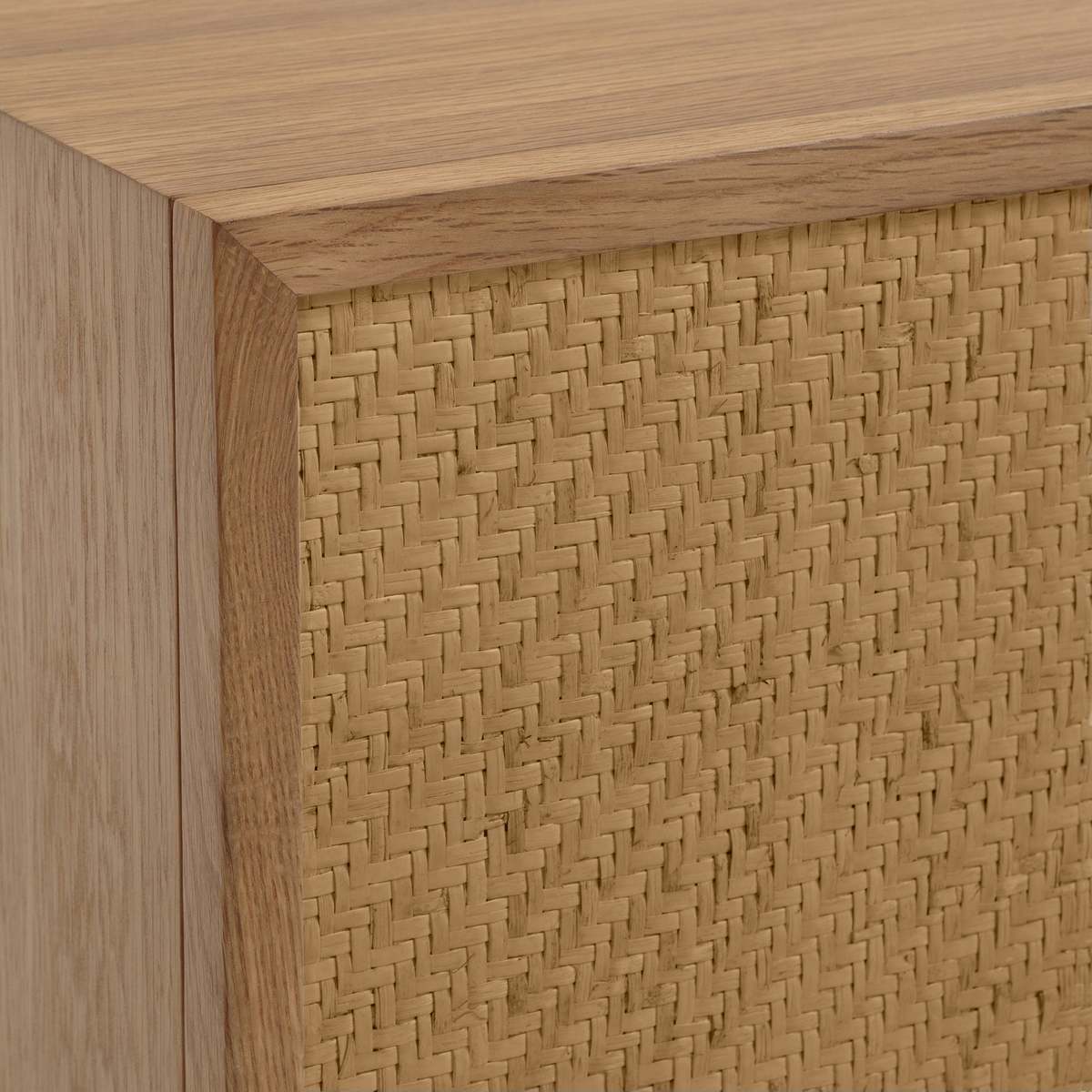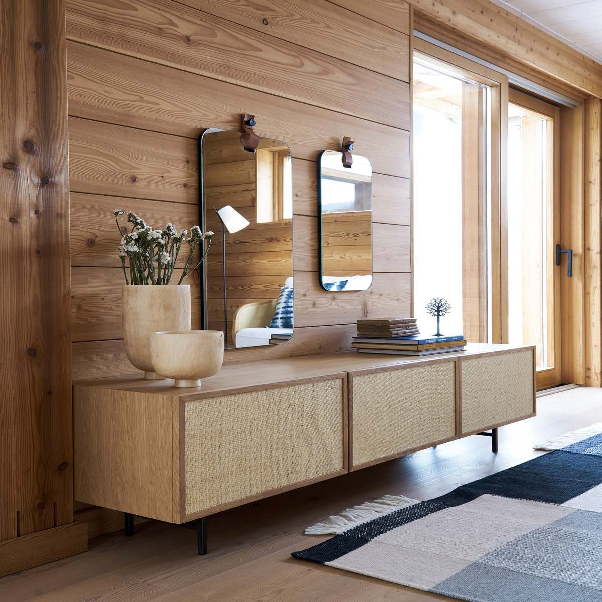 I love this long TV unit because of its warm, natural texture and streamlined silhouette, which makes it a versatile addition to various interiors. It works particularly well in modern minimalist or Bohemian spaces where you want to introduce a touch of organic, tactile detail. Practical styling tips include keeping the top surface clear for everyday use or arranging a curated selection of books and decorative objects to add personality. If space permits, pairing it with soft textiles or plants can soften its clean lines and create a welcoming focal point. Its neutral tone allows it to sit seamlessly with a wide colour palette, making it a dependable choice for grounding a living room.