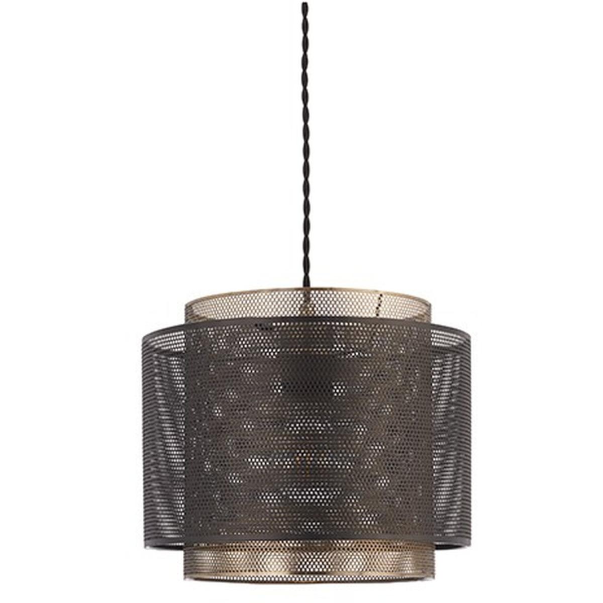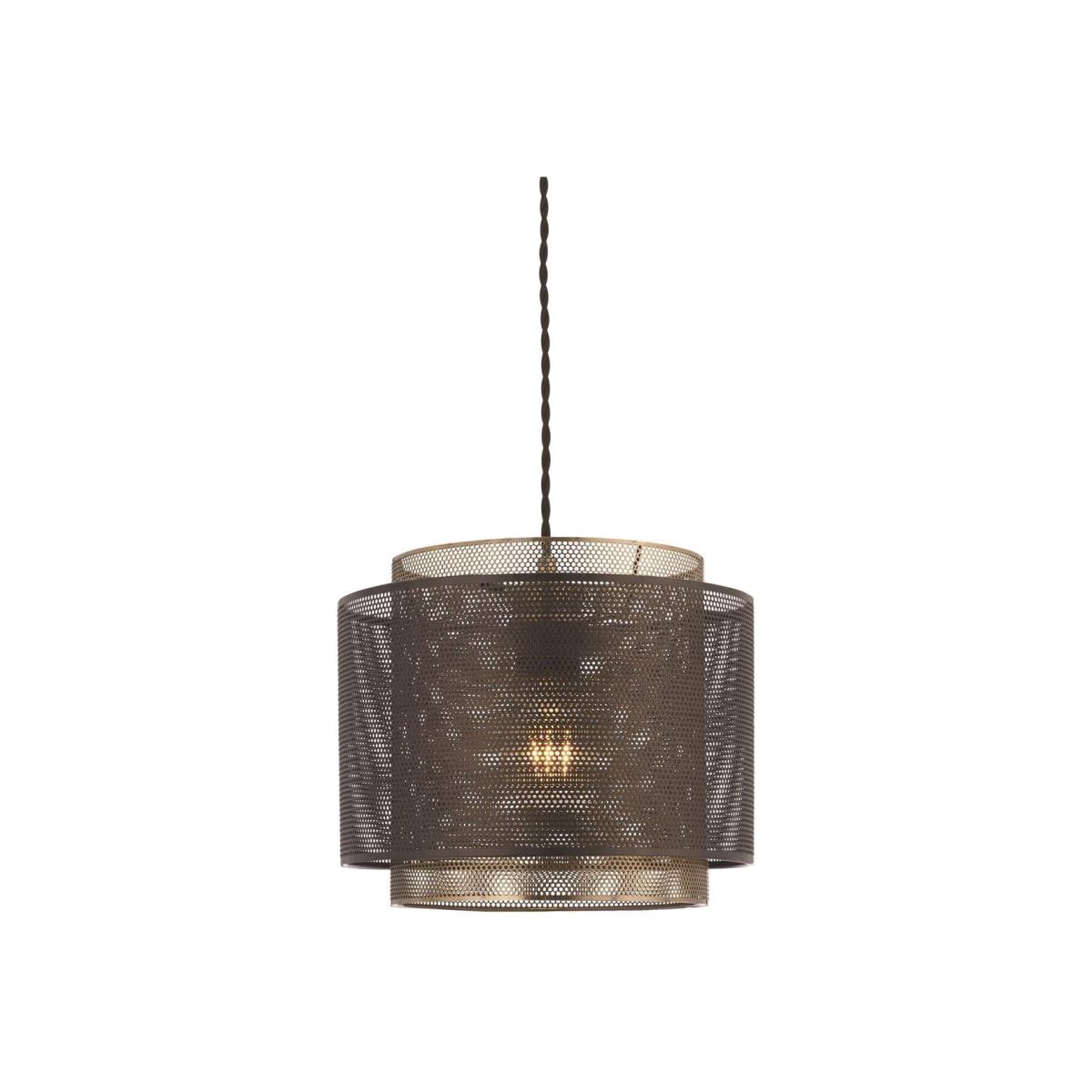 A modern pendant light formed from 2 metal etched cylinder shades, one finished in antique brass effect plate and the outer one in matt black. The mesh style shades create an interesting light effect. Compatible with LED lamps.