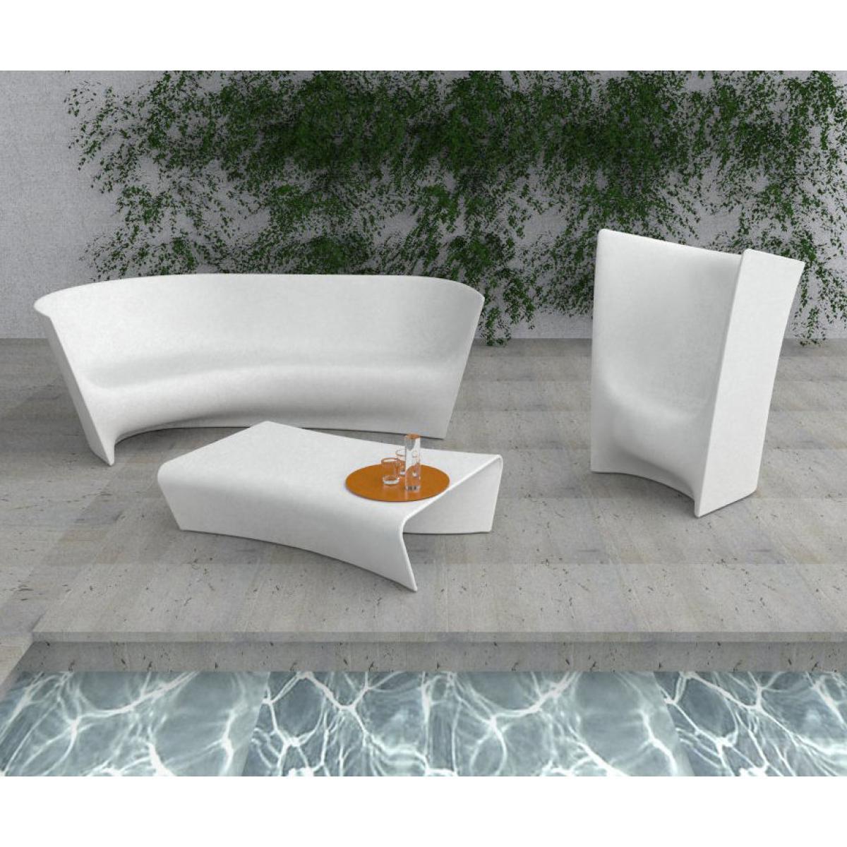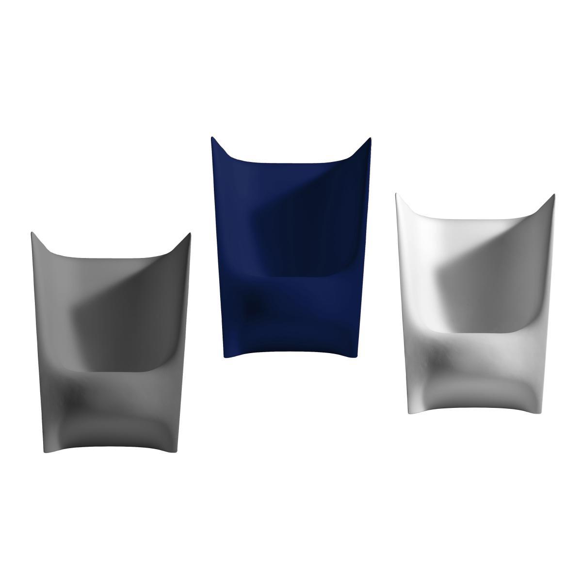 An armchair for exteriors which accommodates the Grand Plié sofas and Piaffé tables. In terms of volumetry, the fluid mass of the bases contrasts with the slender geometry of the backrests. In particular, the high backs of the armchairs tend to create self-sufficient and protected islands. The rotational moulding technique finds renewed effectiveness in this collection, a new raison d'être, and the outdoor increasingly emerges as a privileged place for design.