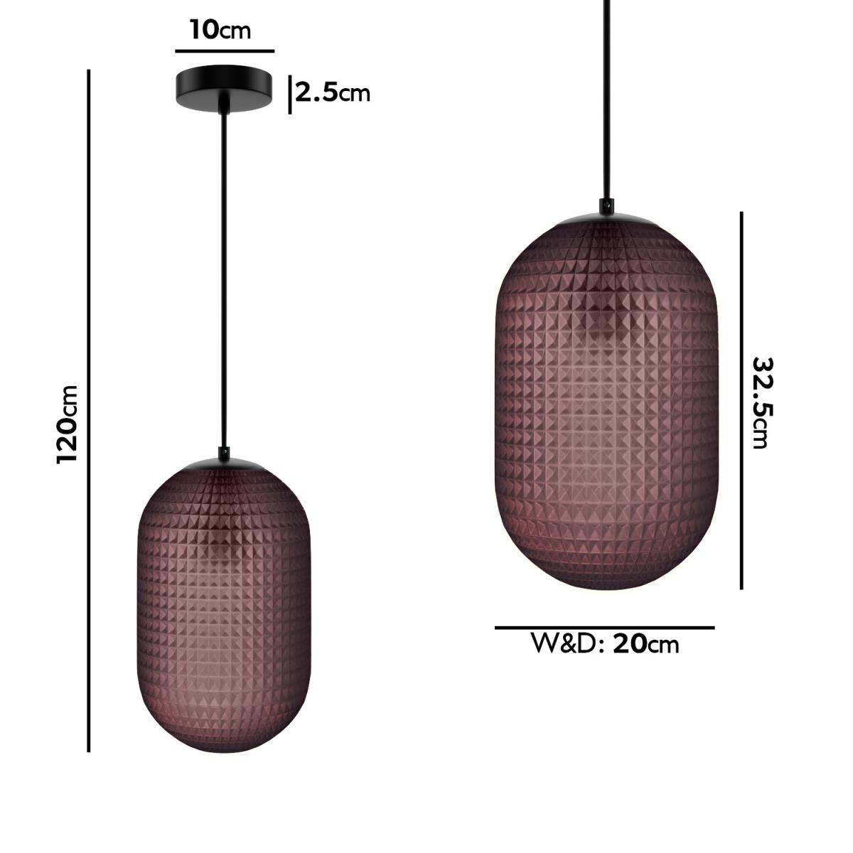 Features we love Unique plum pendant light with a smoked glass shade. Glass shade has a textured finish with a grid effect. Cast a warm soft glow across any room of your choice. Cable height can be adjusted at point of installation. Fits long E27 bulbs that can be bought separately All about me. Lugo’s smoked glass shade softens the light adding atmospheric lighting to any room. The grid patterned glass makes this a statement piece and the black detailing adds a high-quality luxury feel. It would look great as a standalone ceiling light in your living room or you could hang a couple together to give an even bigger impact. The Lugo light is also available in four other colours so take your pick. Need to know. Dimensions. H120 x W20 x D20cm Drop length. 50-120cm Weight. 1.6kg Fixture design. Ceiling pendant Number of lights. 1 Bulb type. Long E27 IP rating. IP20 Material. Glass and metal LED compatible. Yes Dimmable. Yes Bulb included. No Fixings supplied. Yes.