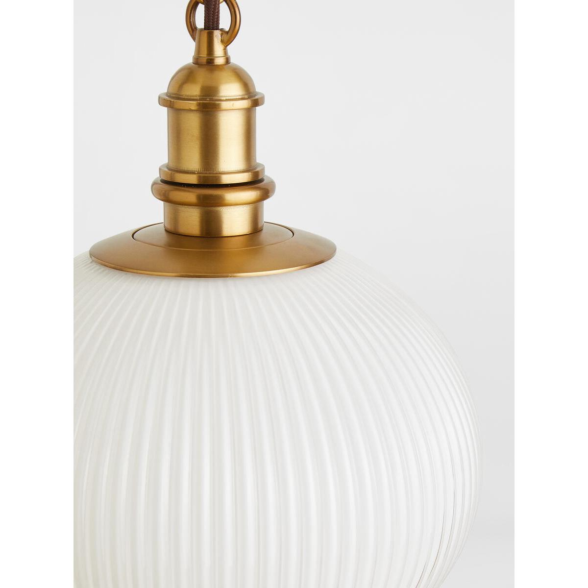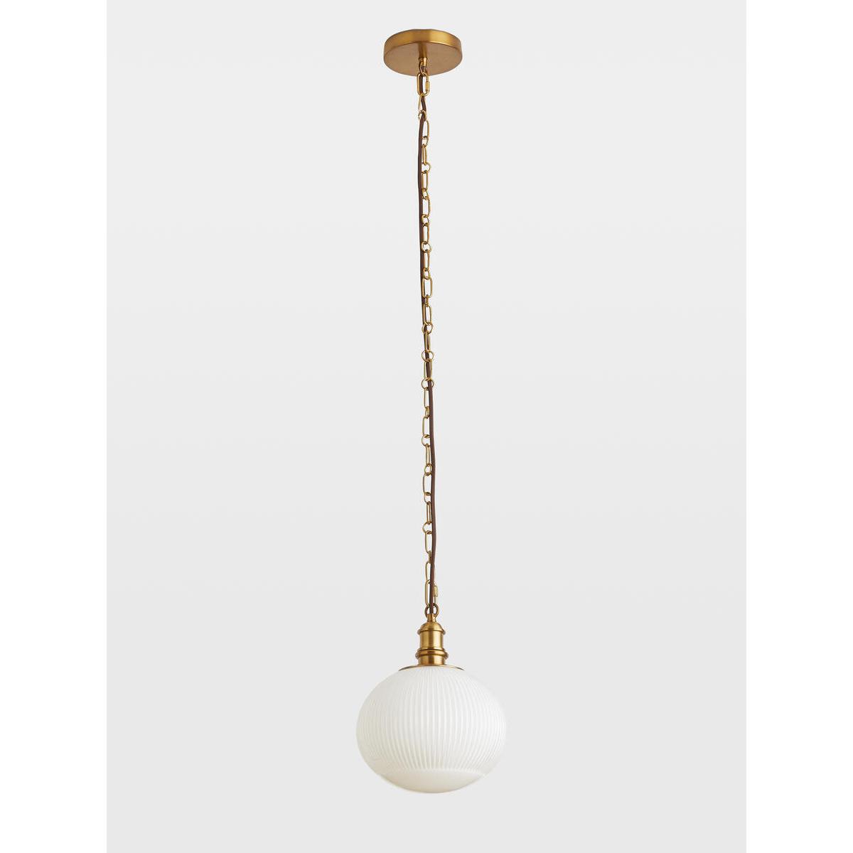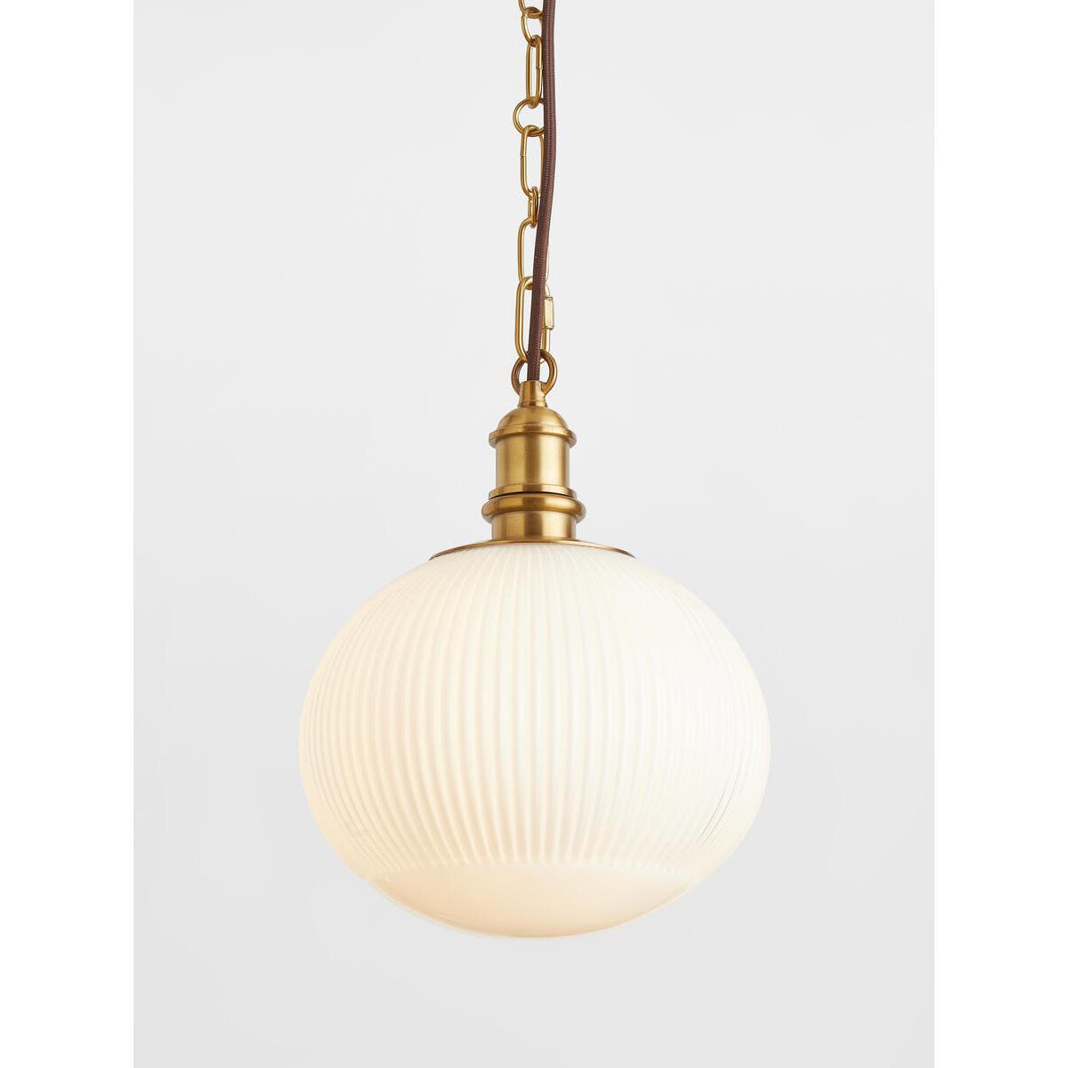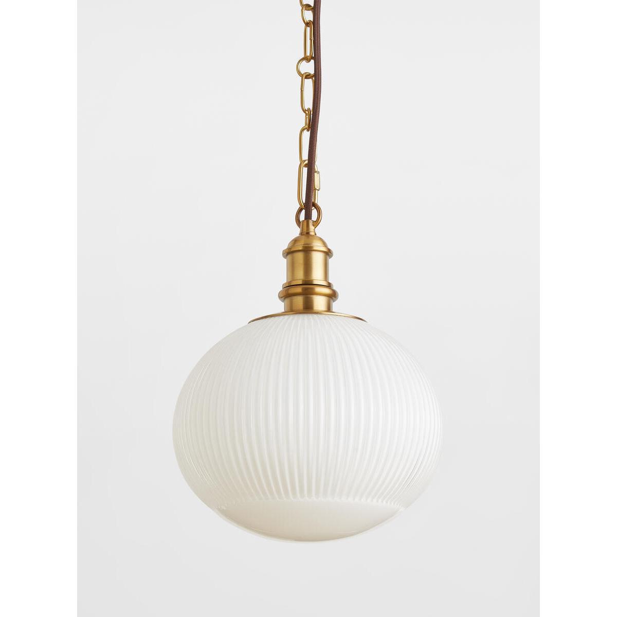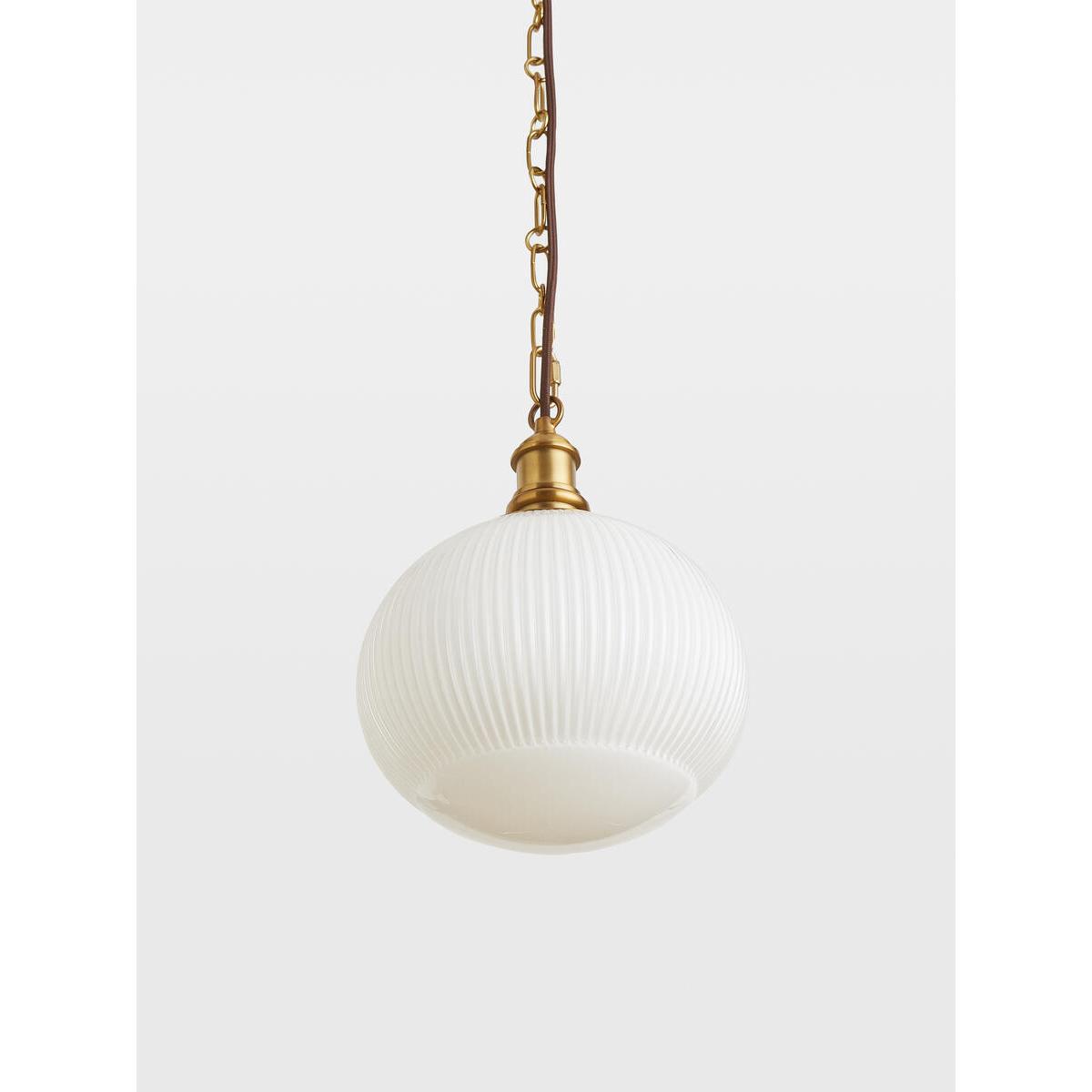 The Plump pendant is ideal for bringing a vintage feel to yourinteriors. A simple chain suspends a squashed oval glass globe,with a white gloss finish and ribbed detail. Hang this piece in ahallway, or over a kitchen counter to echo the lighting styles at. Babington House. Squashed oval shape. Blown moulded glass. Ribbed design. Antique brass finish chain and fitting. Requires 1 x Standard E27 Golf Ball bulb/ max 60. W. Can be hung independently or grouped. Inspired by Babington House.