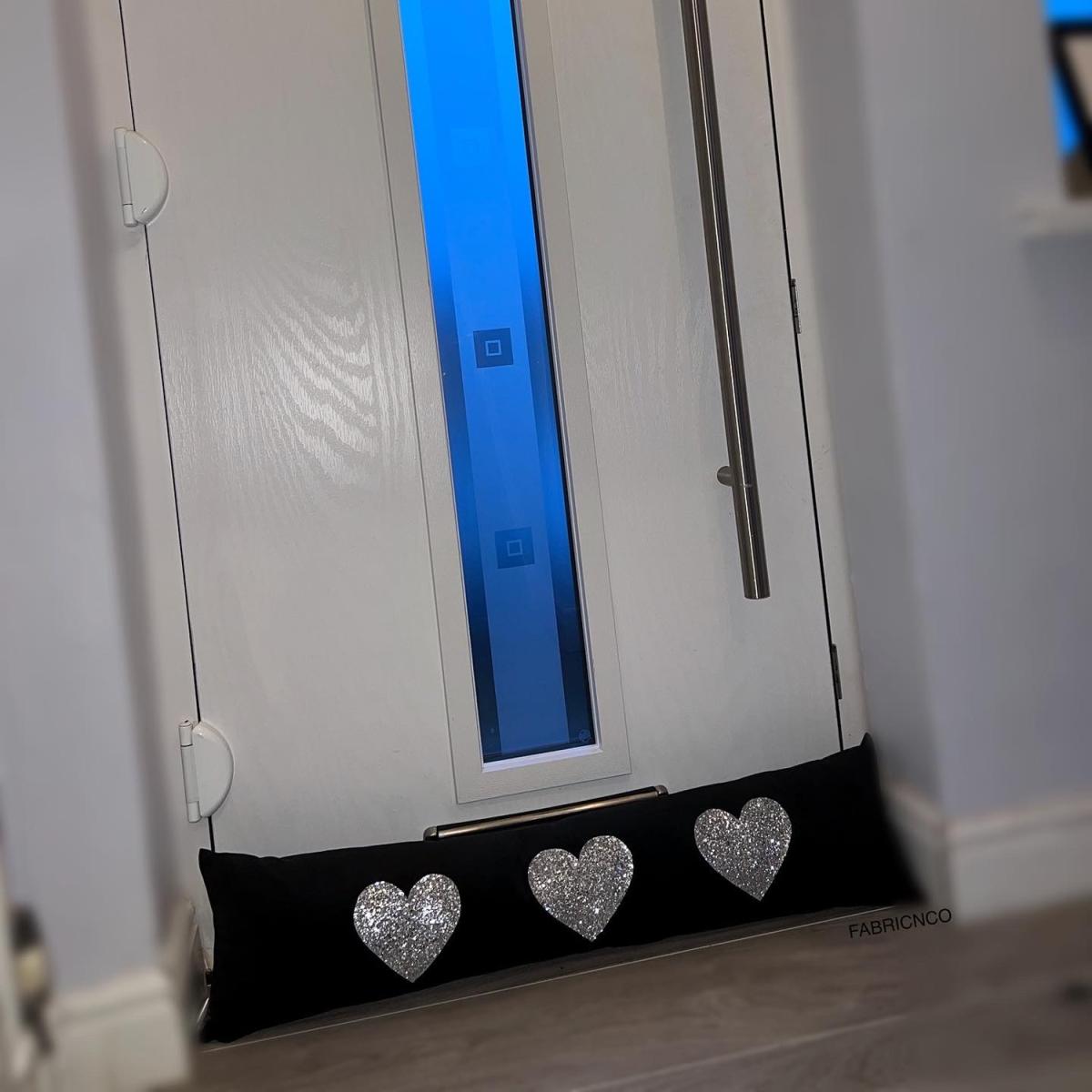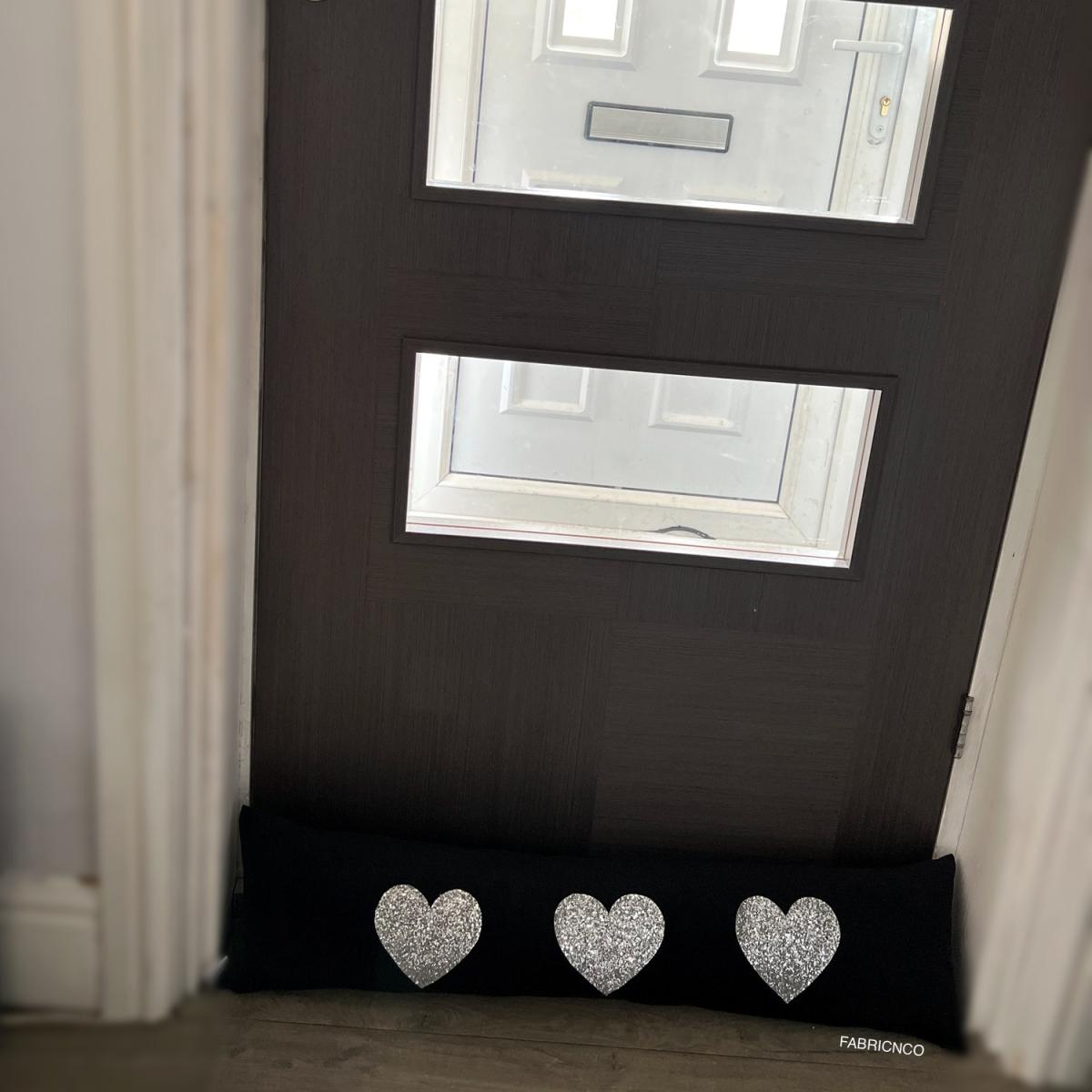 Above is one of our stunning draught excluders with three sparkly love hearts across to make it more glam. These are handmade to the highest standard with the thickest, most luxurious best quality fabric. Each item is hand-crafted to perfection with not a single fault. These gleam from every angle and make the perfect stand-out piece for your home.