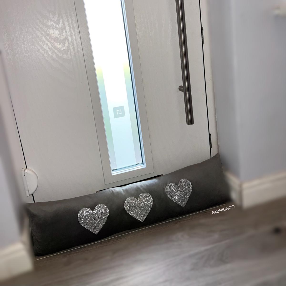 Above is one of our stunning draught excluders with three sparkly love hearts across to make it more glam. These are handmade to the highest standard with the thickest, most luxurious best quality fabric. Each item is hand-crafted to perfection with not a single fault. These gleam from every angle and make the perfect stand-out piece for your home.