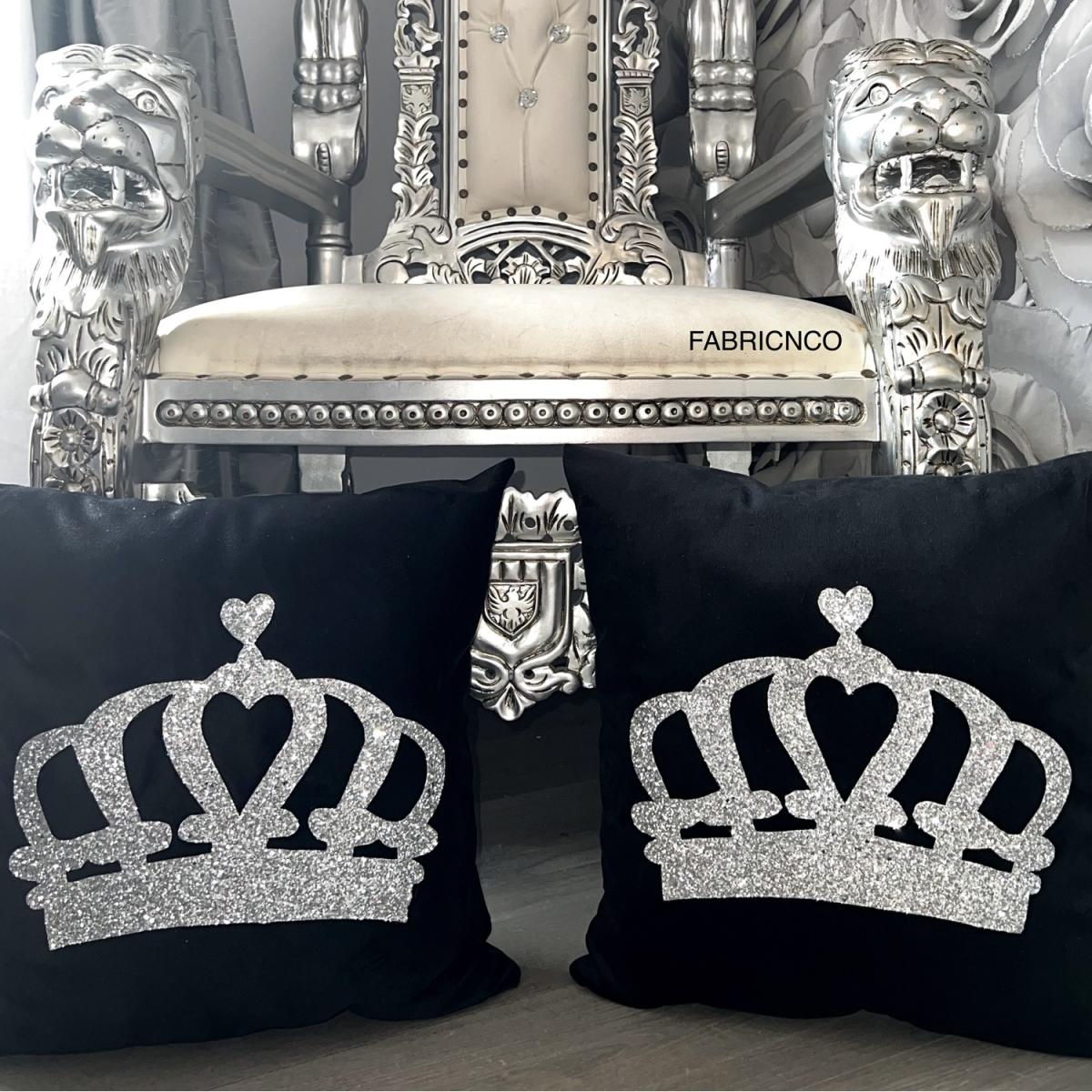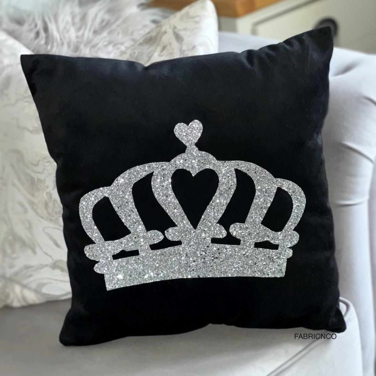 Plush Velvet Personalised Queen Cushion. Above is one of our stunning queen cushions. Finished with a sparkly crown. These can be made in any colour plush velvet and any colour glitter. These are handmade to the highest standard with the thickest, most luxurious best quality fabric. Each item is hand-crafted to perfection with not a single fault. These gleam from every angle and make the perfect stand-out piece for your home.