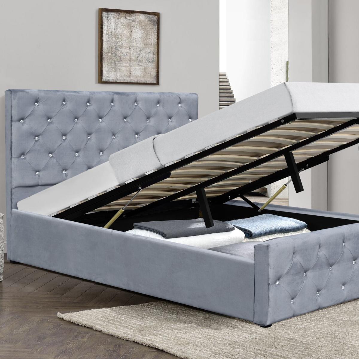 This stylish bed is beautifully upholstered in grey brushed velvet fabric. It features a padded headboard and footboard and is finished with a diamante crystal button detail. It is made from a solid wooden frame and has a sprung slatted base to give support to the mattress and give you a fully supportive and comfortable night's sleep. The ottoman aspect of this bed frame is operated using a gas lift mechanism that lifts up the mattress to reveal ample storage space. Please note this is straight to floor storage area.