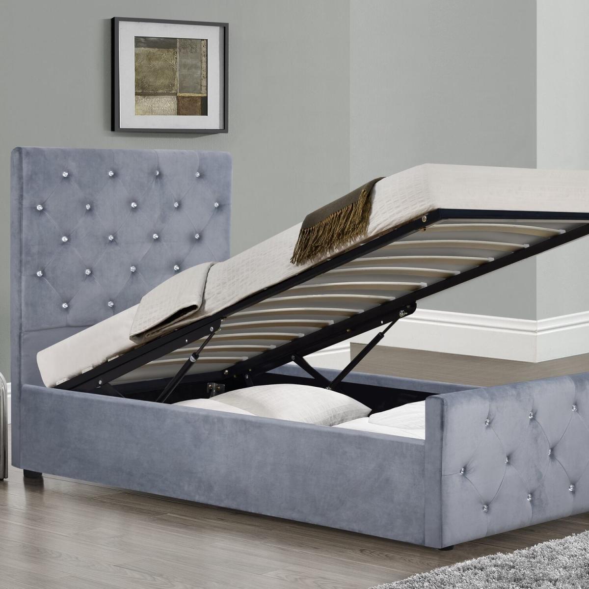 This stylish bed is beautifully upholstered in grey brushed velvet fabric. It features a padded headboard and footboard and is finished with a diamante crystal button detail. It is made from a solid wooden frame and has a sprung slatted base to give support to the mattress and give you a fully supportive and comfortable night's sleep. The ottoman aspect of this bed frame is operated using a gas lift mechanism that lifts up the mattress to reveal ample storage space. Please note this is straight to floor storage area.