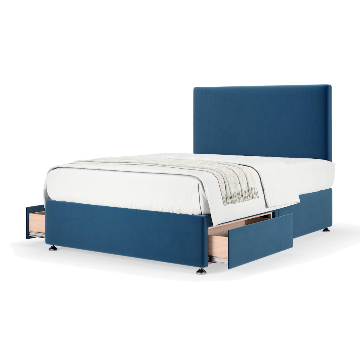 Delivered to a room of choice. A solid platform top base from one of the UK's leading manufacturers. Providing support and a firm foundation for your mattress. Finished in a lovely high-quality fabric with chrome fittings and gliders. This divan is universal, meaning the headboard and storage can be placed on any side. Can be purchased with 0, 2 or 4 drawers. Available in Duck Egg, Emerald Green, Graphite, Marine Blue, Natural or Silver in all sizes. Self-assembly required. Base height 36cm (38cm with gliders). Headboard face height 70cm (adjustable height legs). Small Single and Single base 2 drawer option - both drawers are on one side. Double base or larger - 2 drawer option includes 1 drawer on each side. Drawer dimensions - H 27cm x W 52cm x L 82cm. Drawer volume 60 litres.