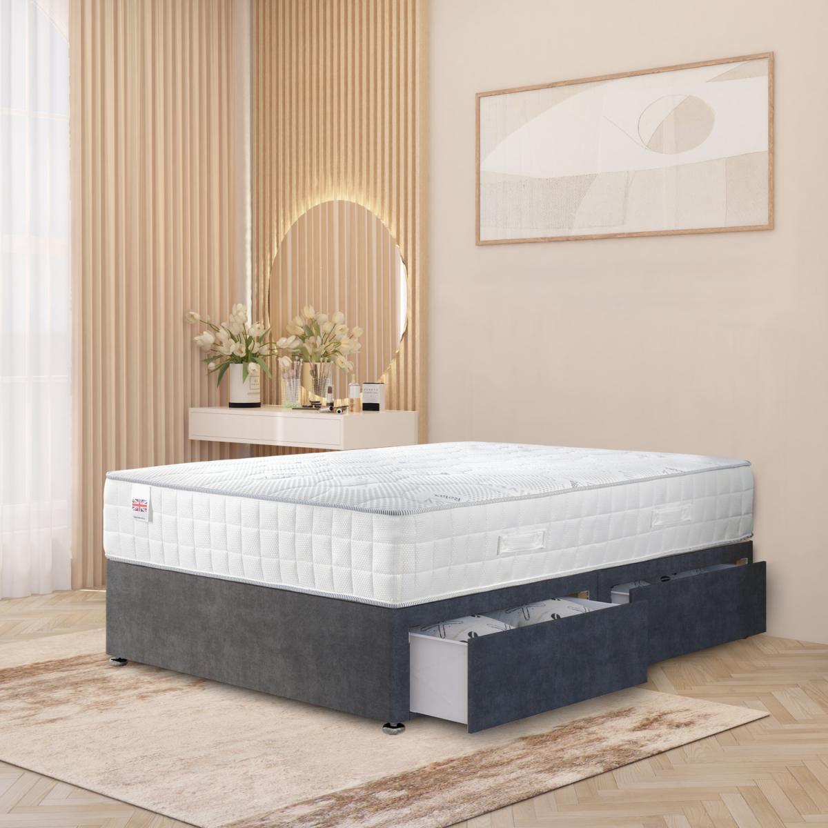 The luxurious Horizona Divan Bed combines elegance, comfort, and practical storage. Featuring a solid platform-top divan base upholstered in plush velvet, this UK made bed adds a premium finish to any bedroom. Paired with our 5 Layer Easy Relax Pocket Spring Memory Foam Mattress, it delivers medium firm orthopaedic support, contouring to your body while easing pressure. Inside, 2.5cm memory foam, 2.5cm reflex foam, 750g polyester foam, and 1000 pocket springs work with a 7-zone system to improve posture and reduce strain. Firmer edge springs increase stability, while a quilted knitted cover enhances breathability. Available as a luxury velvet divan bed with mattress in sizes from single to super king, with no drawers, 2 drawers, or 4 drawers for smart storage. Base height 34.5cm with gliders attached, 30.5cm without. No headboard included in this listing. This option bed comes with 2 easy access storage drawers. Headboard can be placed in either end of the base, so you can either have both drawers facing on the right side, or left side.