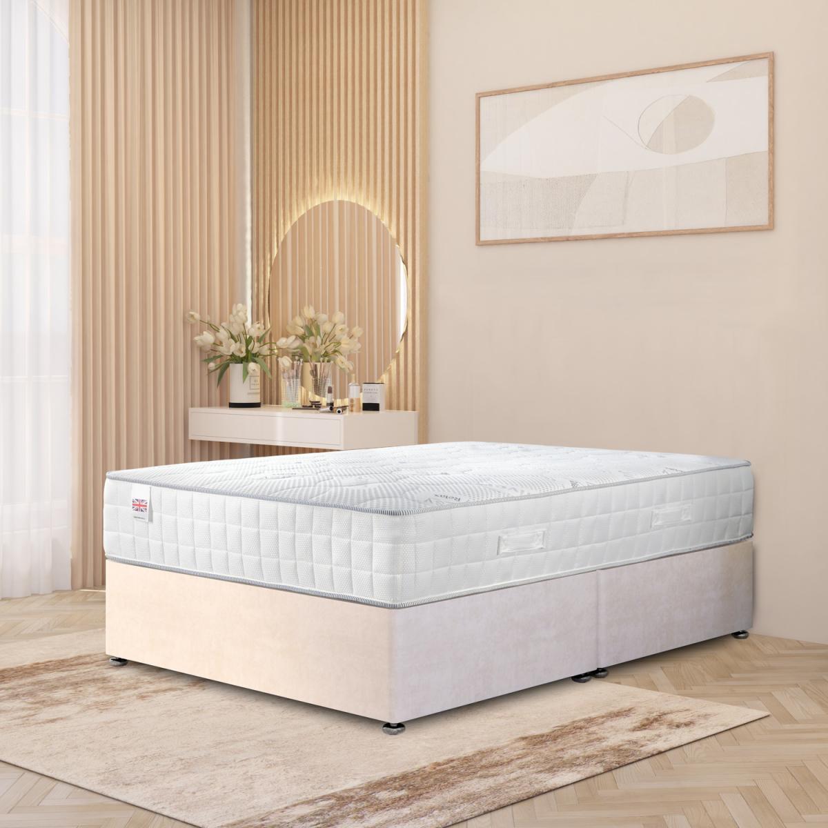 The luxurious Horizona Divan Bed combines elegance, comfort, and practical storage. Featuring a solid platform-top divan base upholstered in plush velvet, this UK made bed adds a premium finish to any bedroom. Paired with our 5 Layer Easy Relax Pocket Spring Memory Foam Mattress, it delivers medium firm orthopaedic support, contouring to your body while easing pressure. Inside, 2.5cm memory foam, 2.5cm reflex foam, 750g polyester foam, and 1000 pocket springs work with a 7-zone system to improve posture and reduce strain. Firmer edge springs increase stability, while a quilted knitted cover enhances breathability. Available as a luxury velvet divan bed with mattress in sizes from single to super king, with no drawers, 2 drawers, or 4 drawers for smart storage. Base height 34.5cm with gliders attached, 30.5cm without. No headboard included in this listing.