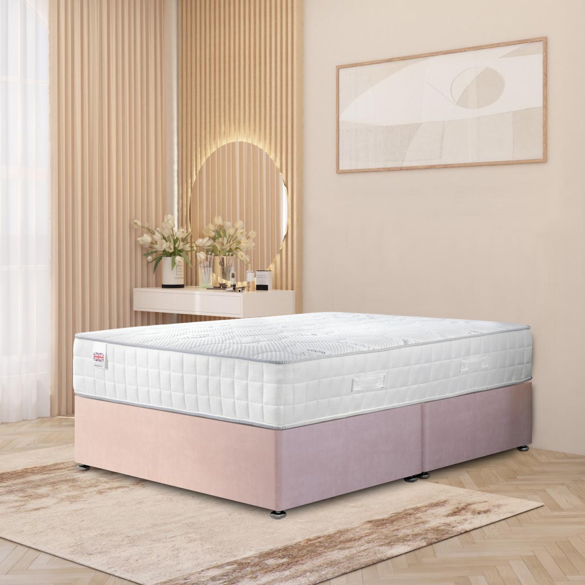 The luxurious Horizona Divan Bed combines elegance, comfort, and practical storage. Featuring a solid platform-top divan base upholstered in plush velvet, this UK made bed adds a premium finish to any bedroom. Paired with our 5 Layer Easy Relax Pocket Spring Memory Foam Mattress, it delivers medium firm orthopaedic support, contouring to your body while easing pressure. Inside, 2.5cm memory foam, 2.5cm reflex foam, 750g polyester foam, and 1000 pocket springs work with a 7-zone system to improve posture and reduce strain. Firmer edge springs increase stability, while a quilted knitted cover enhances breathability. Available as a luxury velvet divan bed with mattress in sizes from single to super king, with no drawers, 2 drawers, or 4 drawers for smart storage. Base height 34.5cm with gliders attached, 30.5cm without. No headboard included in this listing.