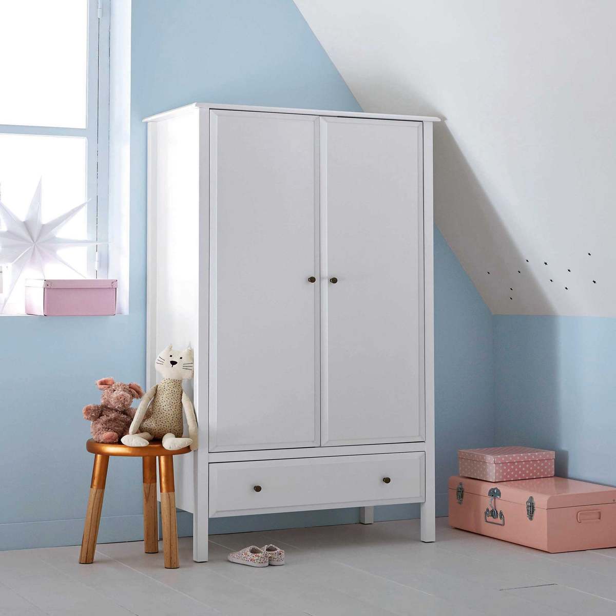 I really like this little wardrobe for kids’ rooms because of its clean, simple design which makes it versatile across various interiors-from modern to more traditional nursery set-ups. Its white finish adds brightness and keeps the space feeling fresh and airy, ideal for creating a calm environment. Practical styling tips include pairing it with soft pastel accessories or colourful storage baskets inside to add a playful touch while keeping essentials organised. It works well in compact spaces thanks to its upright, space-saving form, and the pull-out drawer at the bottom adds extra storage for smaller items like bedding or toys. Overall, it’s a functional piece that keeps a child's room tidy without compromising on style.