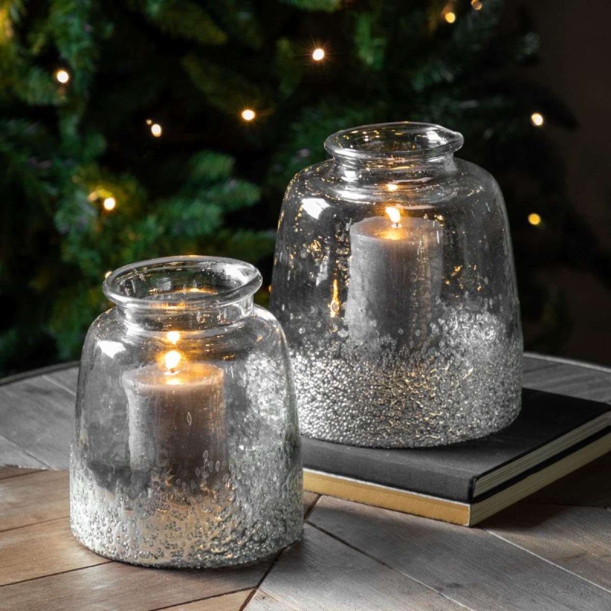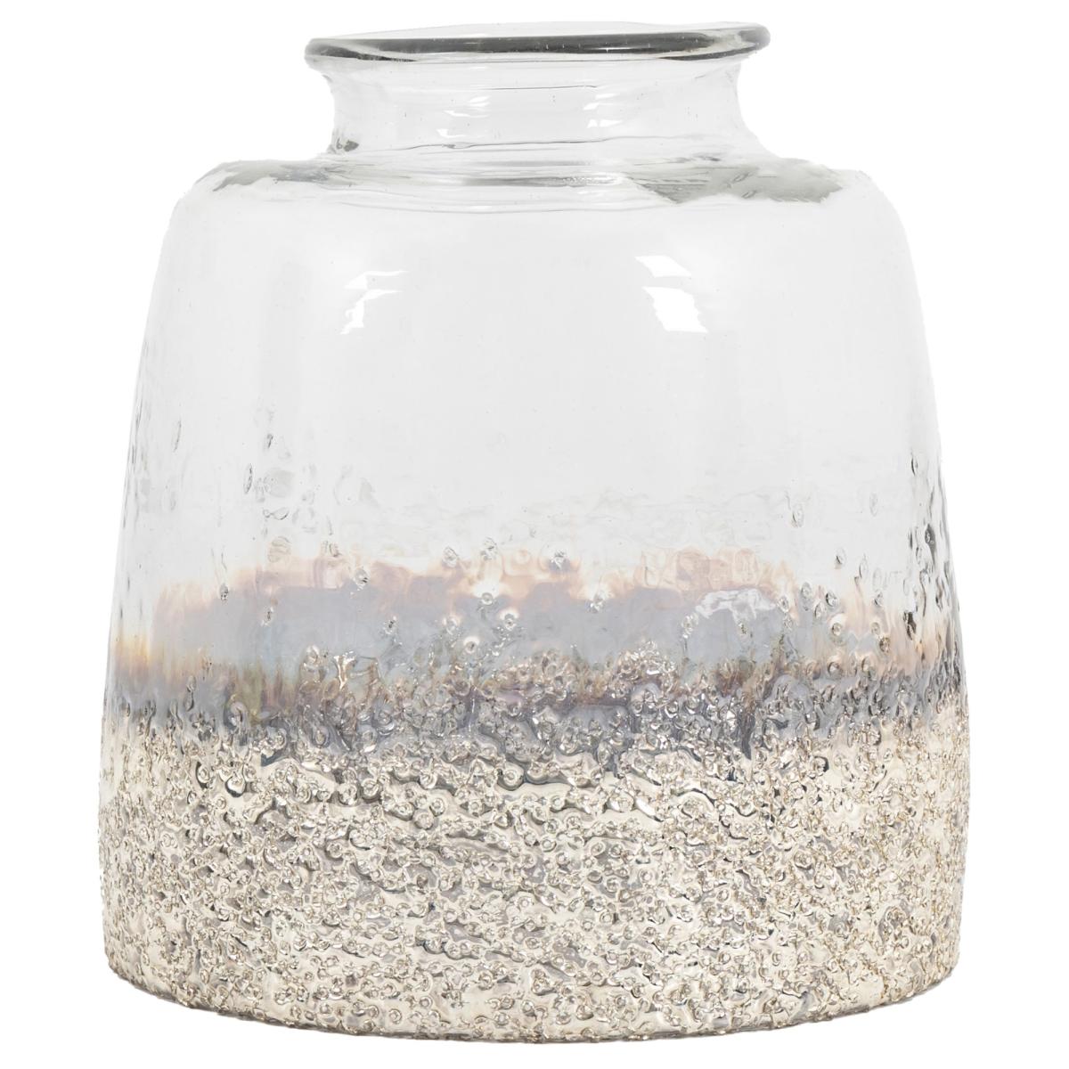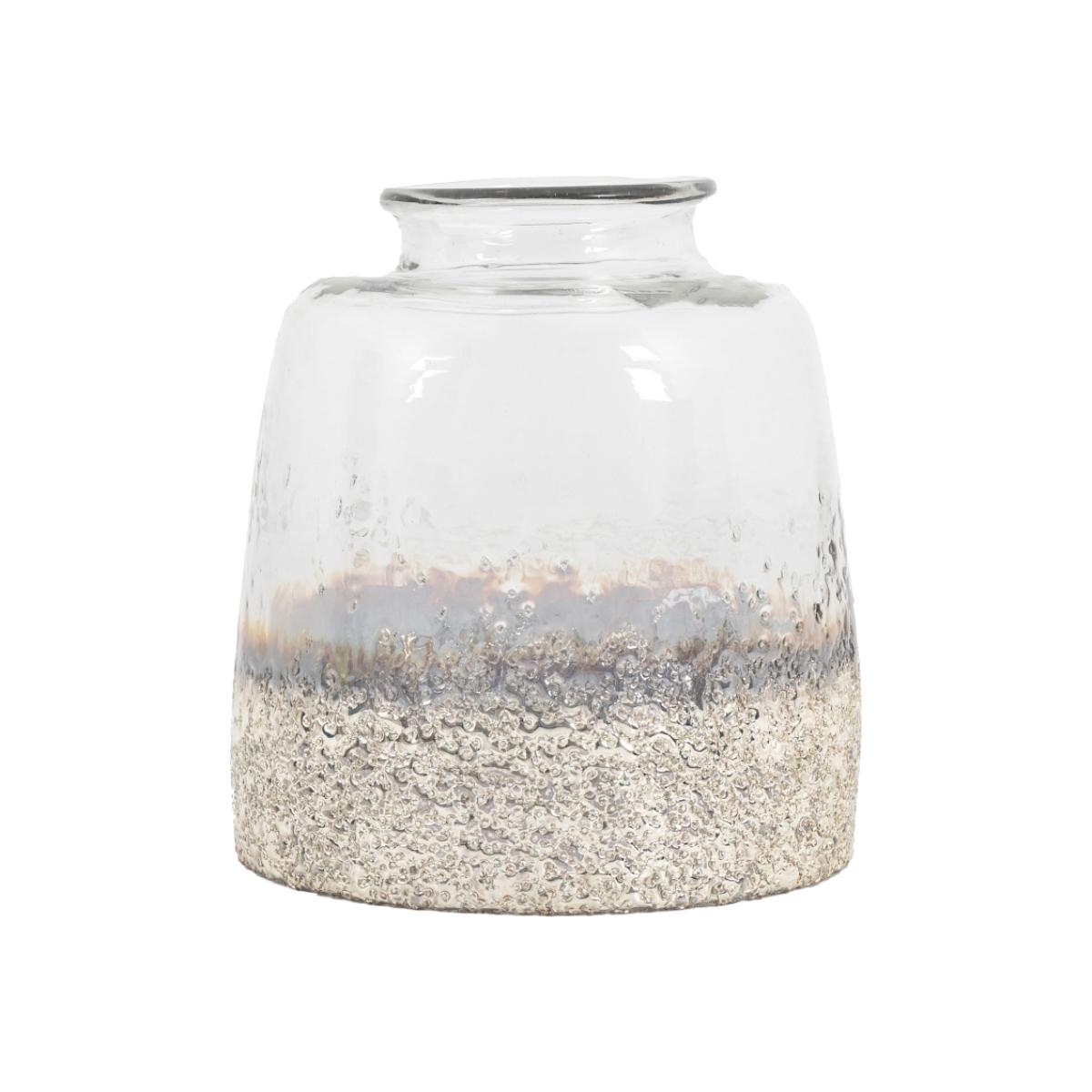 This glass Pluto Large Hurricane Vase in Silver is mouth blown to give a really organic feel. The base is then made to look like it has been dipped in antique silver and given a textured finish. Available in 2 sizes Indoor Use Only Colour - Silver Material - Glass Dimensions: (H) 23cm x (W) 20cm x (D) 20cm.