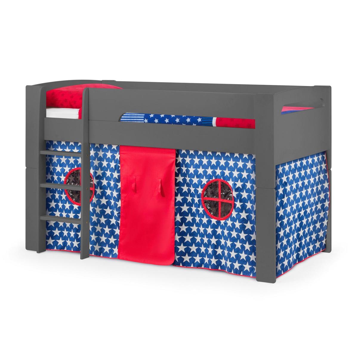 Take your child off to the moon and back with this imaginative Pluto Midsleeper with a Tent. Transform your child's bedroom with the Pluto mid-sleeper bed. This fun and vibrant bed frame comes complete with a Pluto star tent, making it ideal for encouraging your child to stray away from their TV or computer, and instead play within their own little world. The sturdy base is designed with solid wood slats, ensuring strong support for growing children who need a sturdy foundation for all the fun they will have in this fantastic raised bed. The Pluto Midsleeper is also designed for future flexibility - it can be converted to a single bed later on if required, making it an ideal bed for your growing child.