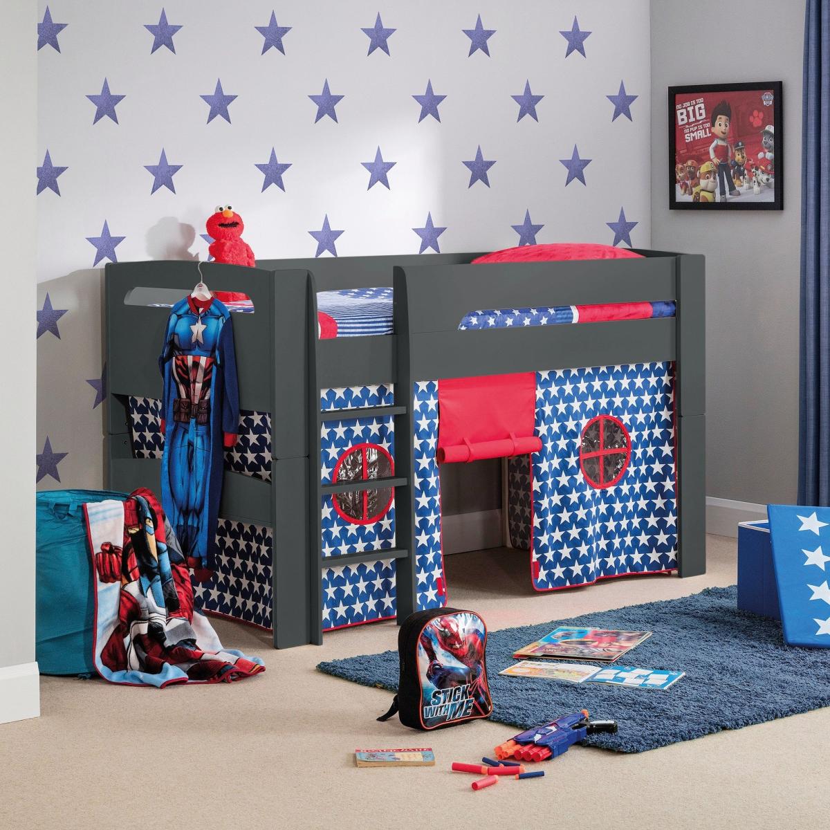 I’d pick this blue-and-black midsleeper for its clever use of space - the built-in tent creates a cosy hideaway while leaving plenty of floor room for play or storage baskets. The strong colour contrast works equally well in a neutral scheme (think dove-grey walls and white furniture) or in a bolder palette with primary reds and blues. To style it, layer in a few star-print cushions and hang a simple string of LED fairy lights around the tent opening for reading at night. Tuck toy boxes or fabric drawers neatly underneath for easy access, and add a low-profile rug in a complimentary shade to tie the whole look together.