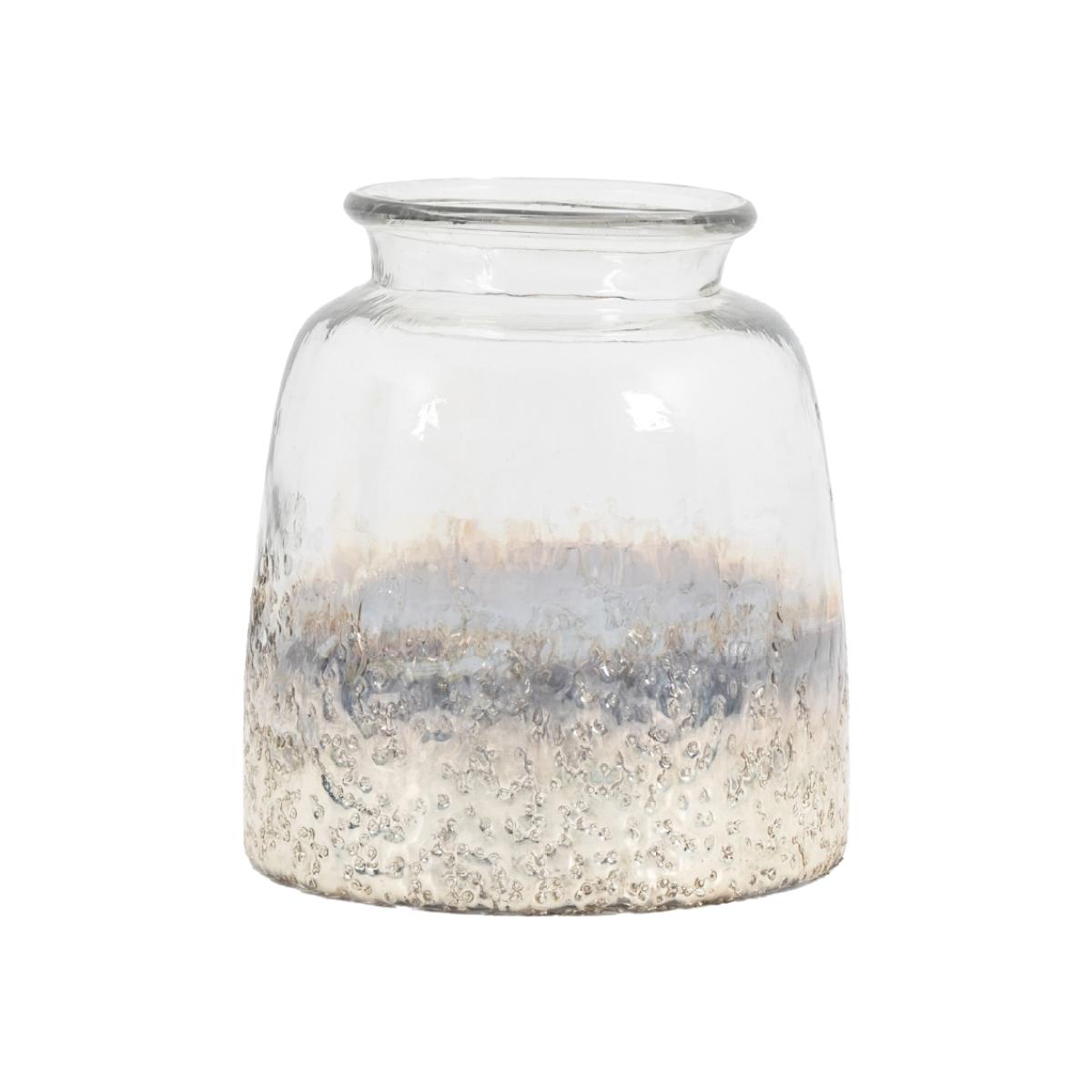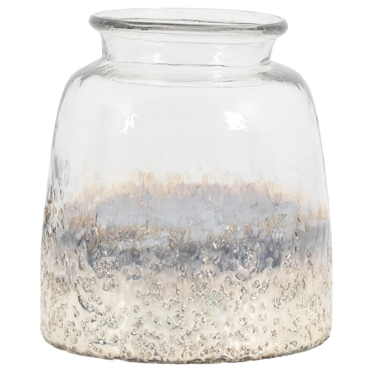This glass Pluto Small Hurricane Vase in Silver is mouth blown to give a really organic feel. The base is then made to look like it has been dipped in antique silver and given a textured finish. Available in 2 sizes Indoor Use Only Colour - Silver Material - Glass Dimensions: (H) 19cm x (W) 18cm x (D) 18cm.