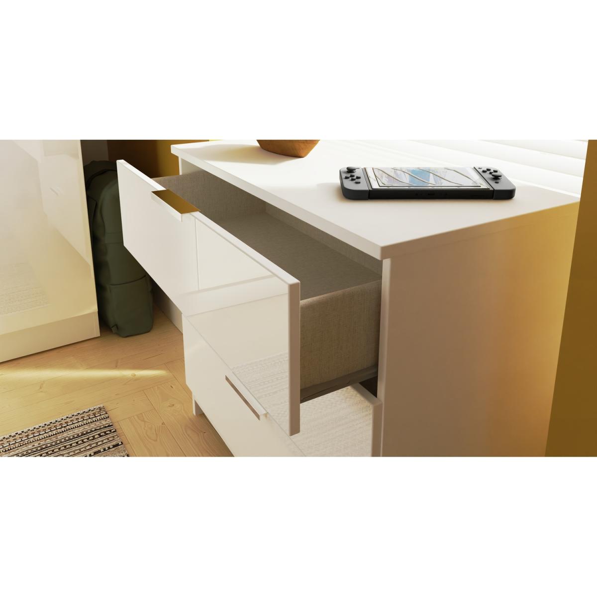 I like how the gloss-white six-drawer chest brings a sleek, light-reflecting surface to a room without feeling bulky. Its streamlined profile and minimal handles suit contemporary, Scandi or urban-loft interiors and work equally well in a bedroom, hallway or home office. For styling, keep the top uncluttered - try a low-profile lamp or vase of fresh greenery, a small stack of books and one framed print. Soften the look with a woven rug or pastel cushions nearby, and hang simple wall art above to balance the height without crowding the space.