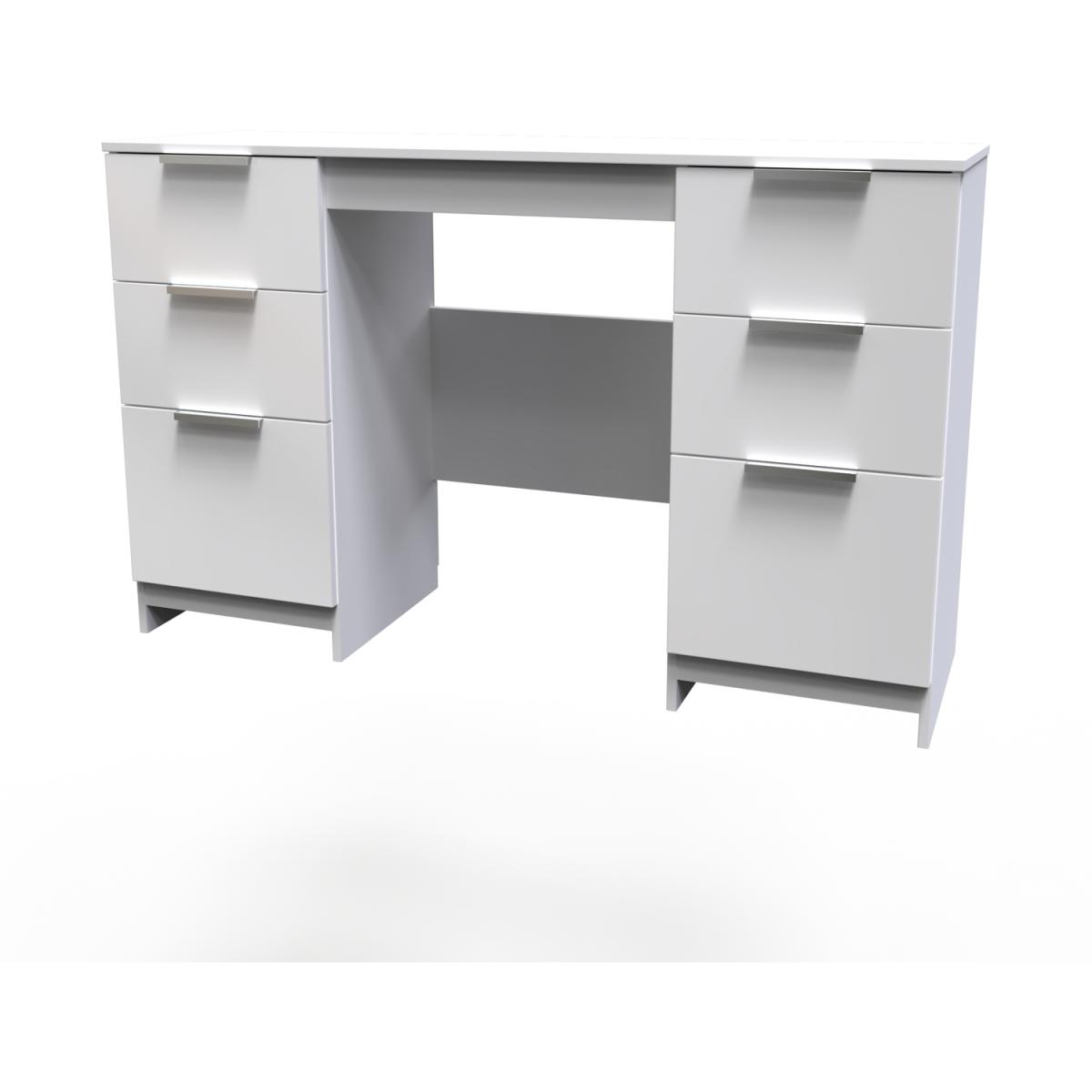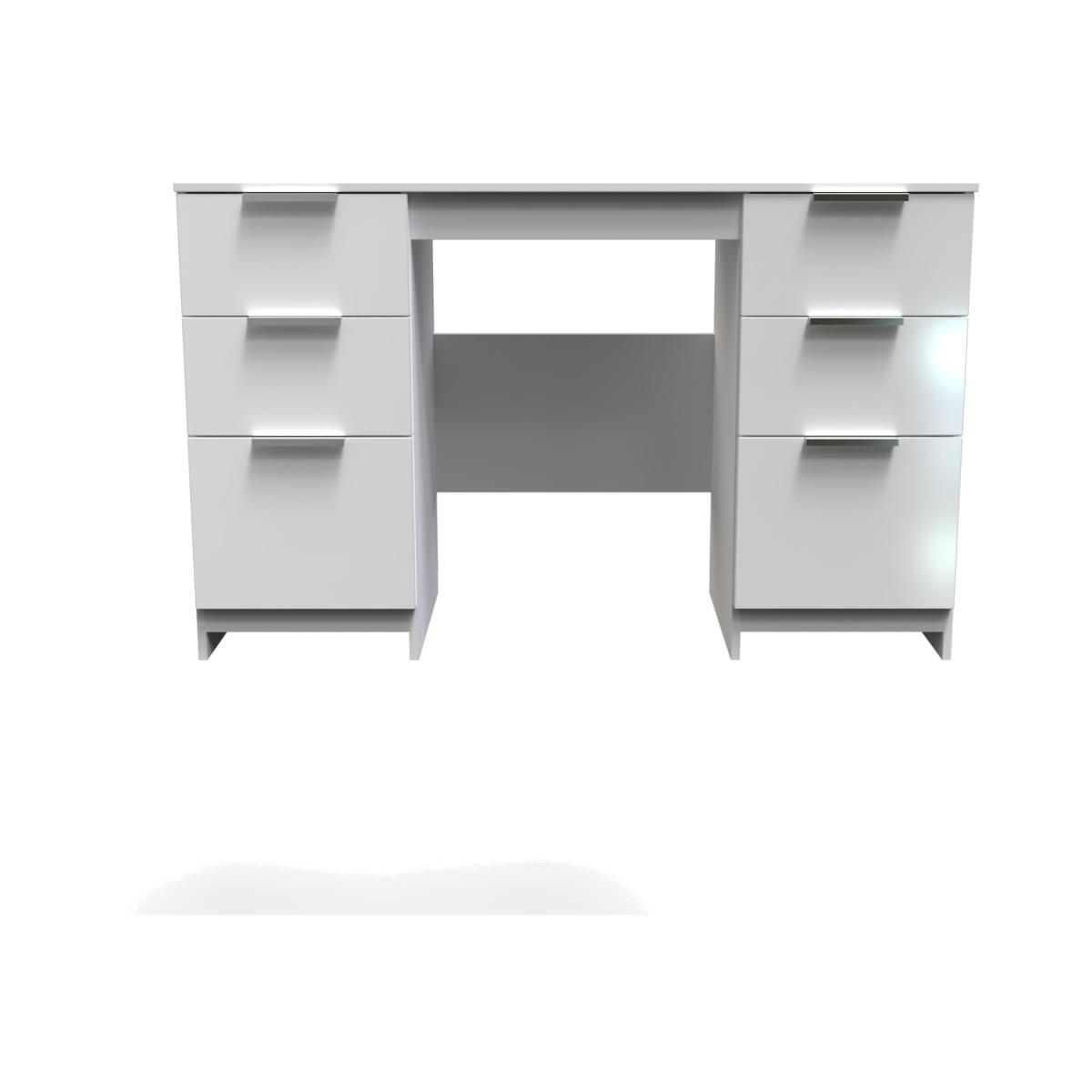 This practical 6 drawer kneehole deskvanity is perfect for any bedroom or office. A matching stool and mirror (in 2 sizes) are also available. A Fresh modern range, with solid metal pull handles and comes in a range of scratch resistant gloss or matt finishes. All our furniture is made in the United Kingdom, to the highest quality. It is delivered direct to your location of choice by one of our two man delivery teams, and come full assembled (although legs may be removed to prevent damage in transit).