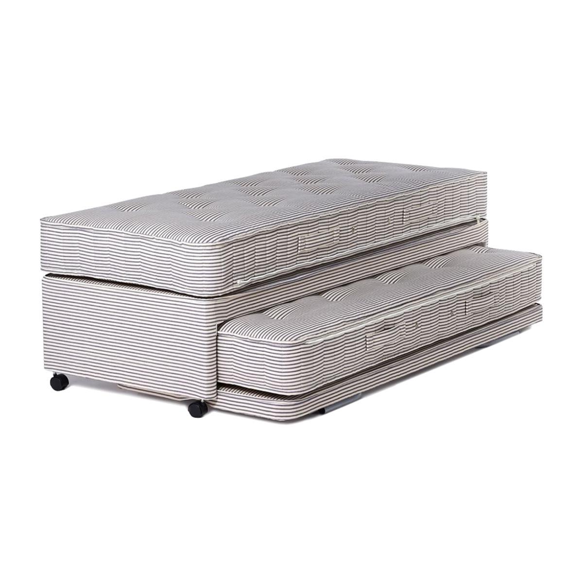 The perfect addition to a guest room or children's bedroom, the small single Pocket Guest Bed by The Conran Shop features a fold out mattress that transforms the bed into a practical queen size bed for grown up guests. The ideal bed for even the most compact of homes, the Pocket Guest Bed boasts two narrow single pocket-sprung mattresses, each of which is individually hand-nested by skilled craftspeople in England to adjust to different weights and mould to the shape of your body. Finished with practical handles, the two luxurious mattresses both feature a pure cotton outer cover in a navy-blue Oxford stripe and double hand-stitched borders for optimal longevity. Perfect for hosting anyone from unexpected visitors to stylish sleepover guests, the versatile single bed features a pull-out second bed that can be lifted out and locked to the same height as the main bed. Finished with 4 practical zips, the two mattresses can either be joined together for a secure and comfortable sleep in a queen-sized bed or used as two singles for maximum flexibility. Incredibly versatile, the mattresses can be joined together on either side of the bed to suit any space. The Pocket Guest Bed is also available in a single-to-super king size.