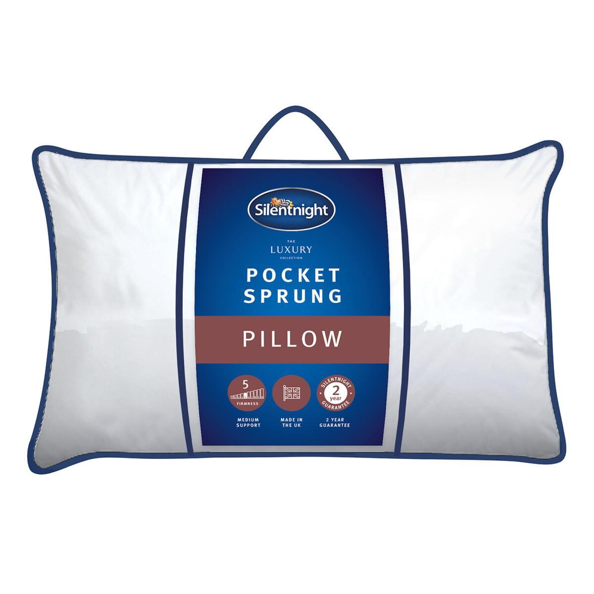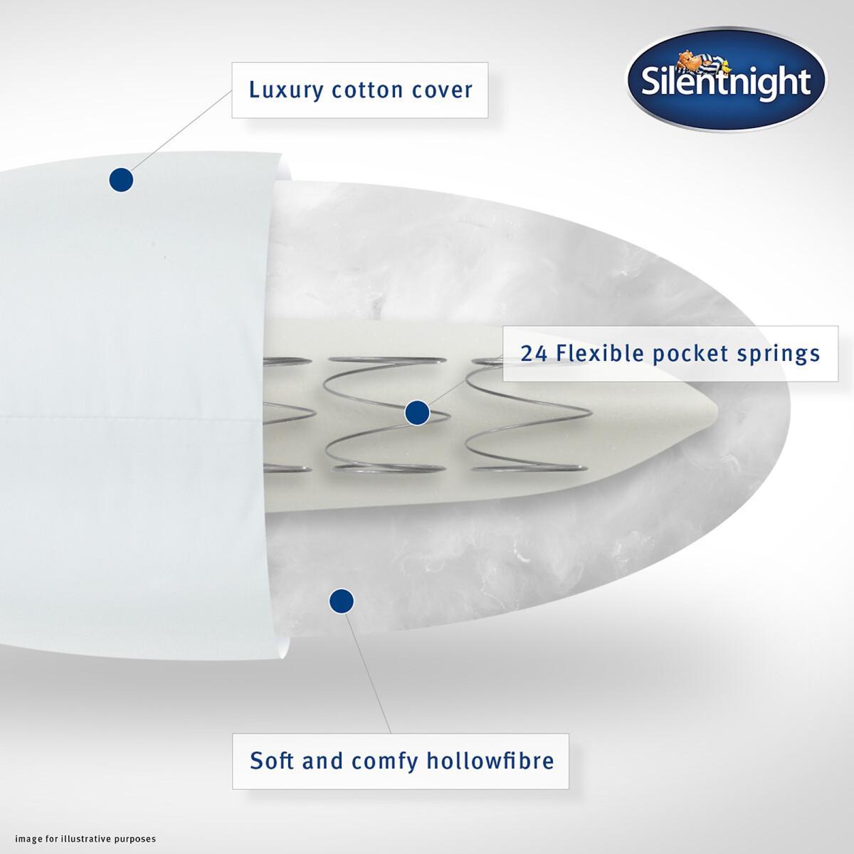 The Silentnight Pocket Sprung Pillow is designed a little like a mattress, this is because miniature pocket springs lie at the heart of the pillow. These springs provide flexible support to ensure that your pillow never goes flat, keeping your head and neck fully supported and comfortable throughout the night. Similar to our mattresses, each of the springs is encased in its own protective pocket and the entire spring unit is surrounded by soft and comfortable hollowfibre. The pillow is encased in a smooth 100% cotton cover that is naturally breathable and cooling. Providing a medium firmness, this pillow is most suitable for people who sleep on their back or side. At Silentnight we understand the importance of a good night’s sleep and we believe your pillow should be as unique as you. When choosing the right pillow you need to consider your dominant sleep position. For example people who sleep on their front require only a small amount of support from their pillow, so a soft and slim pillow is ideal for front sleepers. Back sleepers need a little more support, so a medium firmness is best suited. Finally, side sleepers require the most support from their pillow to help relieve pressure from the neck. If you sleep on your side you will feel more comfortable with a firmer pillow. Back and side sleepers may need to use more than one pillow to achieve the perfect level of support. 1 Silentnight Pocket Sprung Pillow, standard size 74 x 48cm. Filled with miniature pocket springs for a flexible and supportive pillow to keep your head and neck comfortable throughout the night. Provides medium support and is most suitable for back and side sleep positions. Smooth, soft and breathable cotton cover that is naturally cooling for extra comfort. Machine washable at 40°C. 2 year manufacturer’s guarantee. This product will be dispatched by one of our trusted suppliers. You’ll be contacted by their selected courier about your delivery. Goods must be unused and returned in their original packaging. If sealed for health/hygiene reasons they must also be returned unopened with seals, stickers and tags intact.
