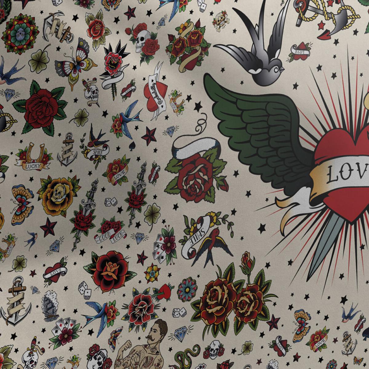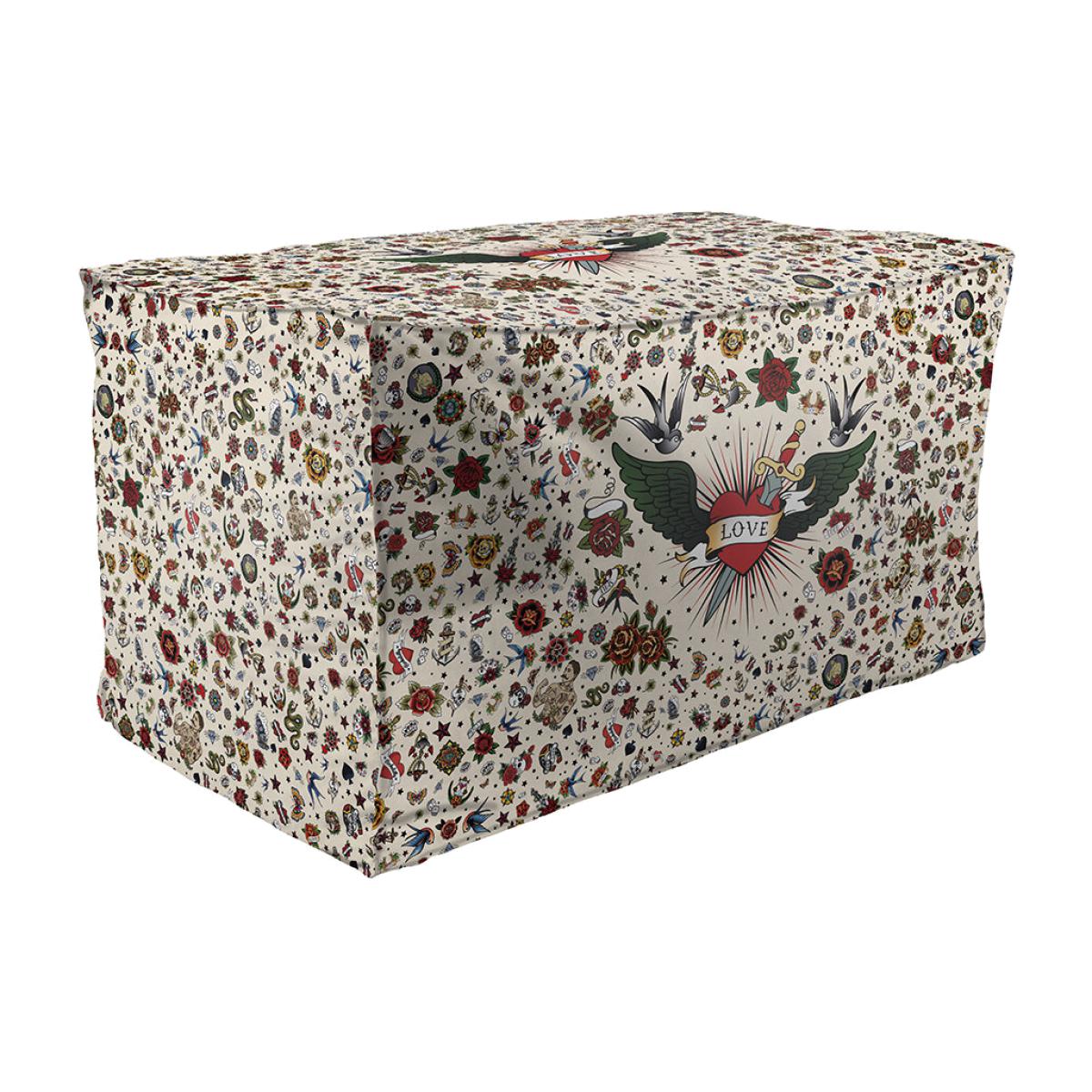 Add an extra soft spot in your living space with this ottoman from PODEVACHE. Made from polyester and filled with long-lasting EPS beads, it is adorned with an array of vibrant tattoo designs on a beige background.